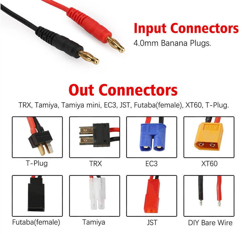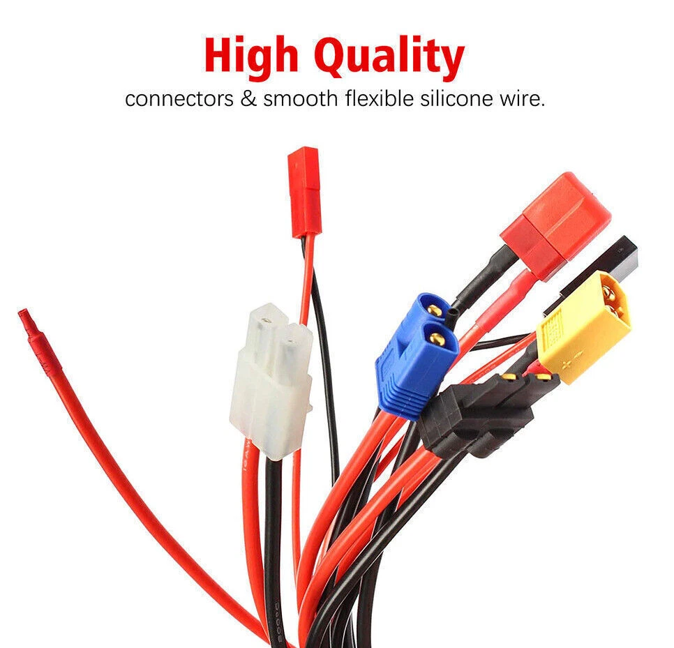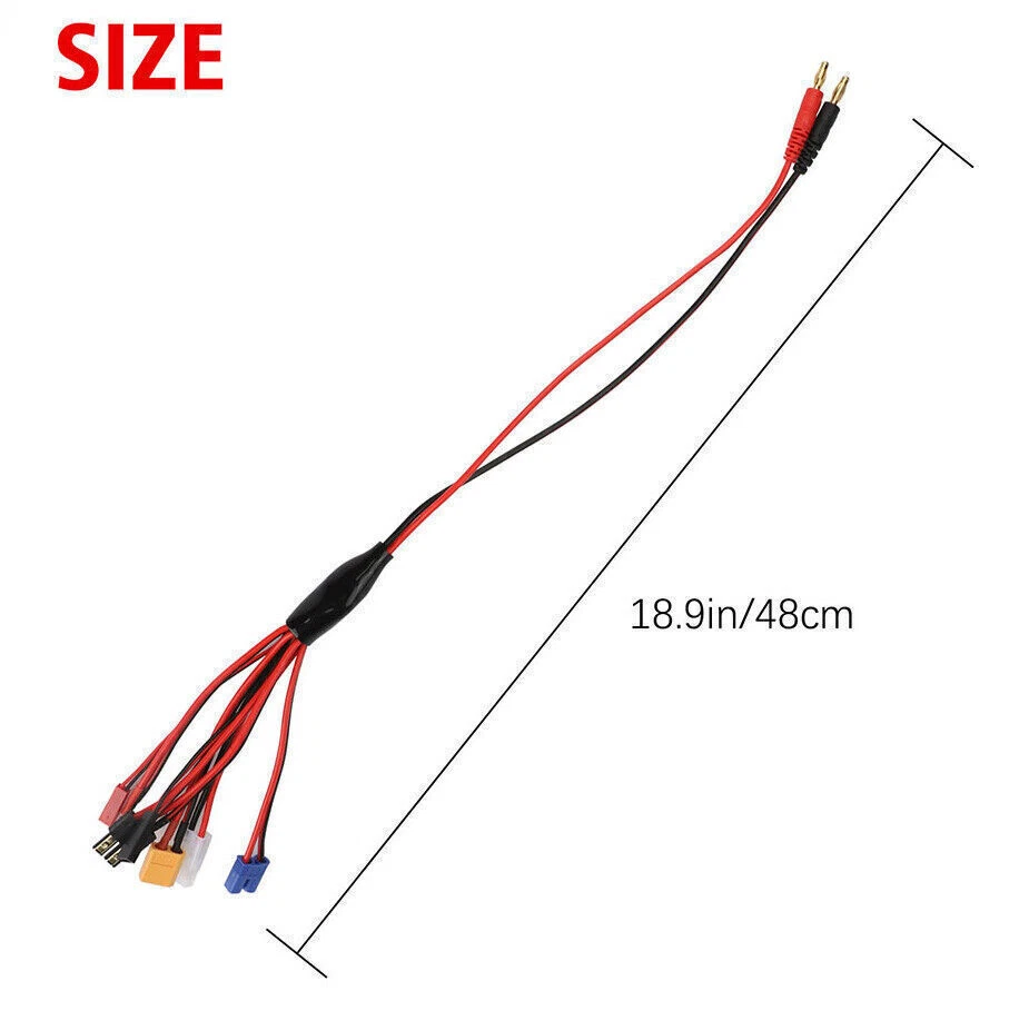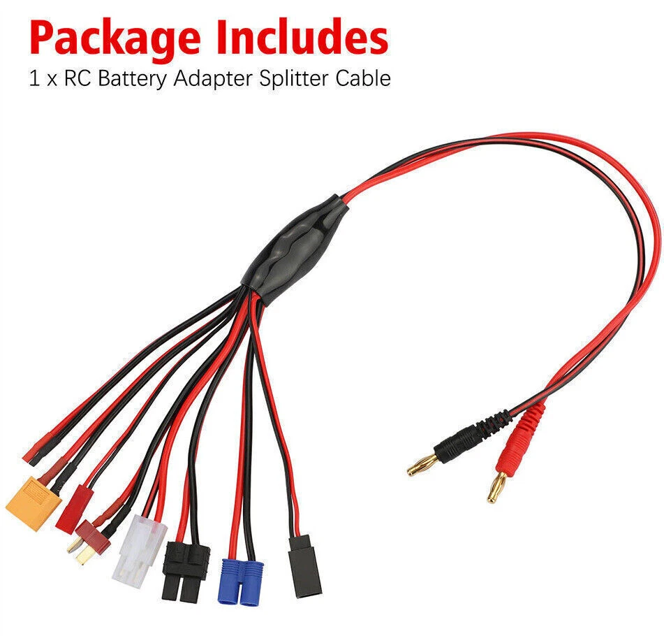 Product Features 8 In 1 RC Charger Leads: Reduce multiple charge leads, save money. Input Connectors: 4.0mm Banana Plugs. Out Connectors: TRX, Tamiya, Tamiya mini, EC3, JST, Futaba(female), XT60, T-Plug. High Quality: connectors & smooth flexible silicone wire. Lipo battery charger cable used silicone as outside insulation, which has excellent properties such as being able to endure high temperatures and flame retardant. Product Specification Type 8 in 1 RC Lipo Battery Adapter Splitter Cable Input Connectors 4.0mm Banana Plugs Out Connectors TRX, Tamiya, Tamiya mini, EC3, JST, Futaba(female), XT60, T-Plug Material Plastic Feature 8 in 1 RC Charger Leads,Gold plate Package Included 1 x RC Battery Adapter Splitter Cable