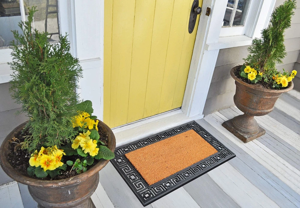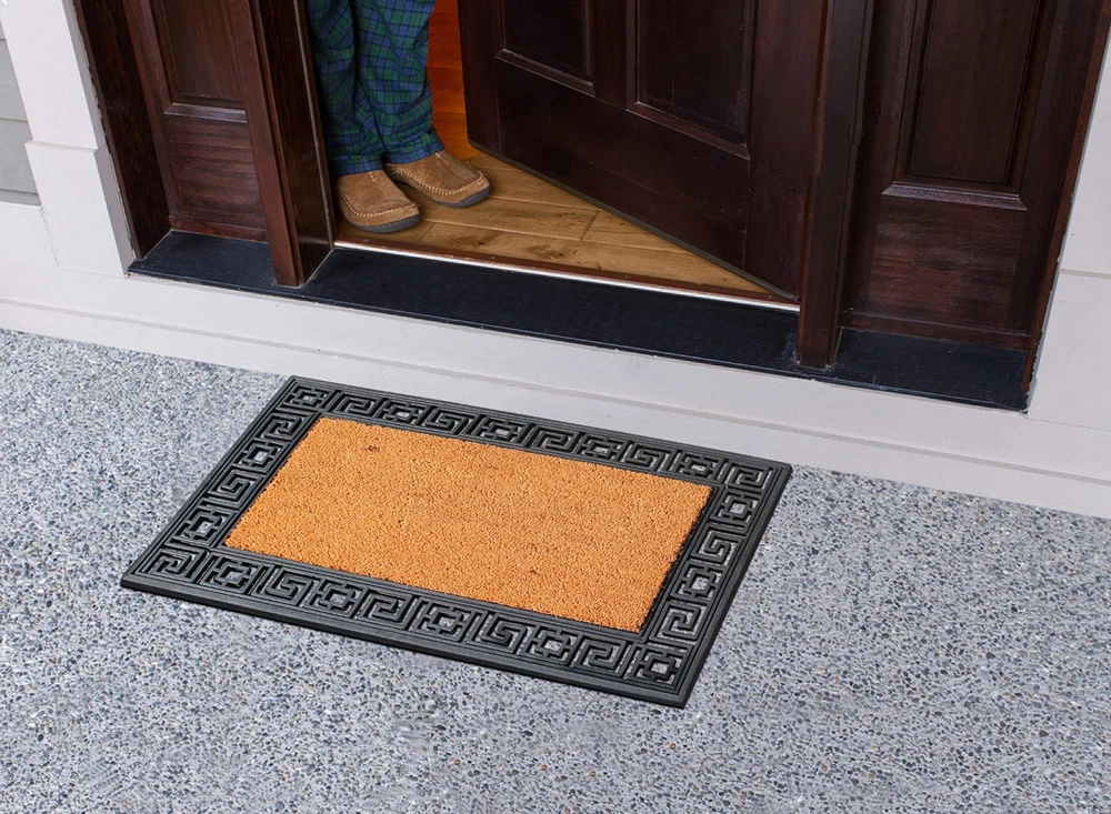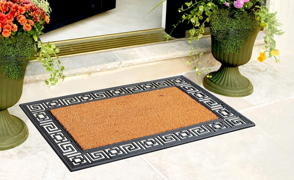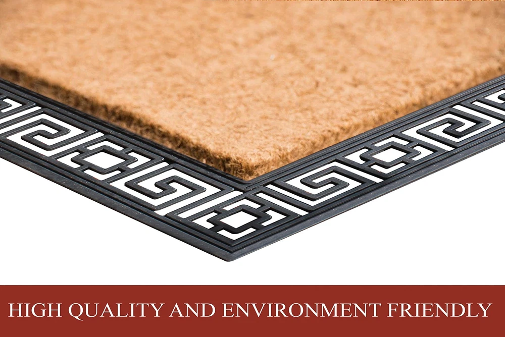 More than a decorative enhancement this rubber & coir doormat is made With a heavy rubber backing that anchors it in place while you brush dirt & debris from shoes & boots. The tufted coco-fiber facilitates scrubbing soles clean. 100%Coconut coir fiber - natural fiber face provides the perfect surface for guests to wipe their shoes before entering your home. Heavy weight - rubber border firmly anchors the mat in place. Place before every exterior door - use on a patio, in a garage, entryway, and anywhere there is high traffic from outside. Use in covered outdoor areas. Perfect size for your large entry - doormat measures 24" X 36" And is thick to allow your door to easily pass over the mat without getting stuck. Decorative all Season popular design - adds a unique touch to your front door or back door while being very functional. ENVIRONMENTAL FRIENDLY OUTDOOR RUG: Made from 100% Hard Wearing Coir Eco friendly Rubber base .These doormats are completely Biodegradable & compostable. Adds a unique touch to your front door or back door while being very functional. Only for use in covered outdoor areas. Do not expose directly to sunlight or rain.