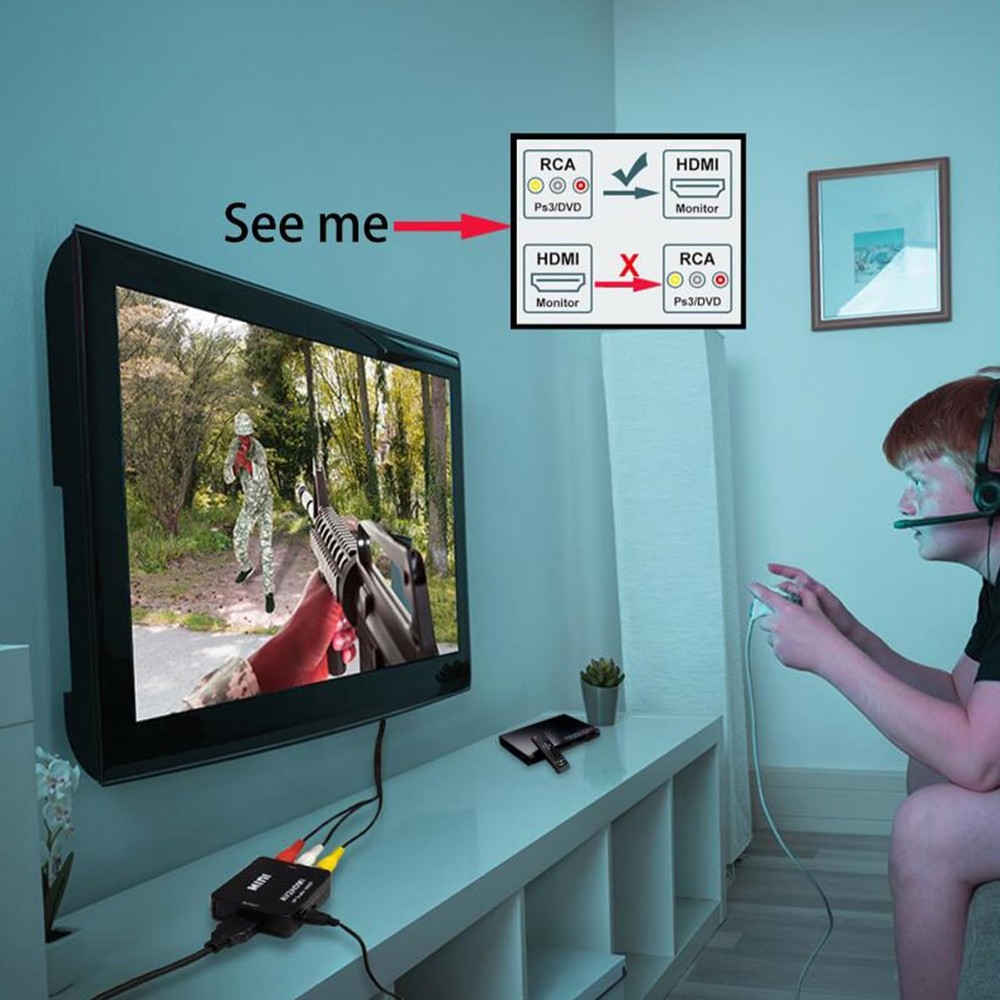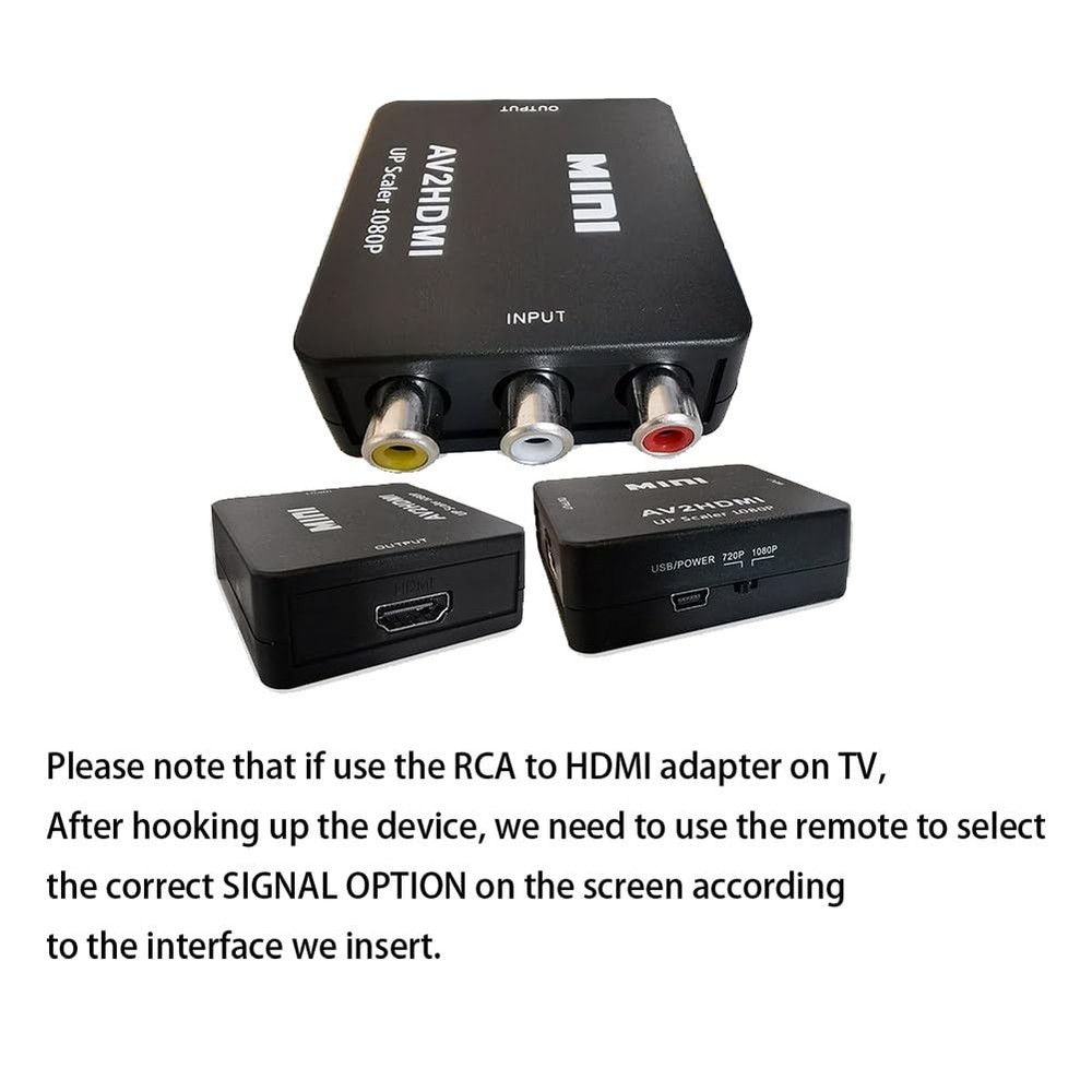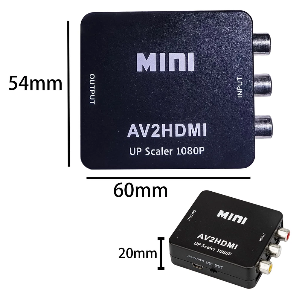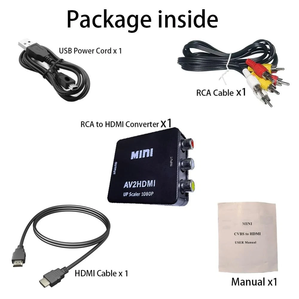 Composite to hdmi AV to HDMI/RCA to HDMI converter. Package Set with HDMI cable x 1, RCA male cable x 1, Micro USB cable x 1, RCA HDMI adapter x 1, USER Manual x 1. Good for VHS Player, av to hdmi for VCR Player, rca to hdmi for wii and etc av cable hdmi adapter. The RCA to HDMI Converter only supports RCA to HDMI, NOT HDMI to RCA, and doesn't support the HDMI DVD player connects to your older TV with RCA ports av hdmi upscaler. Meaning RCA inputs for HDMI output only-cvbs hdmi converter The AV HDMI converter is applied for Xbox, WII, PS3, PS1, PS2, STB, VHS, N64, VCR, DVD Players and others devices with composite AV input vcr hdmi converter. Composite hdmi adapter TV formats such as PAL, NTSC4.43, SECAM, NTSC3.58, PAL/N, PAL/M, & More. The RCA HDMI is Plug and Plays & Easy to Use, The mini AV HDMI Adapter needs no extra driver, portable & flexible. And please Note that the USB power cable needs a 5V 1A power during use. This mini composite hdmi converter user-friendly. This CVBS to HDMI converter offers HDMI output up to 720p/1080p 60Hz Resolutions, The VCR hdmi converter Convert RCA AV CVBS composite (Red, White, Yellow) input to HDMI output on Monitors/HDTVs.