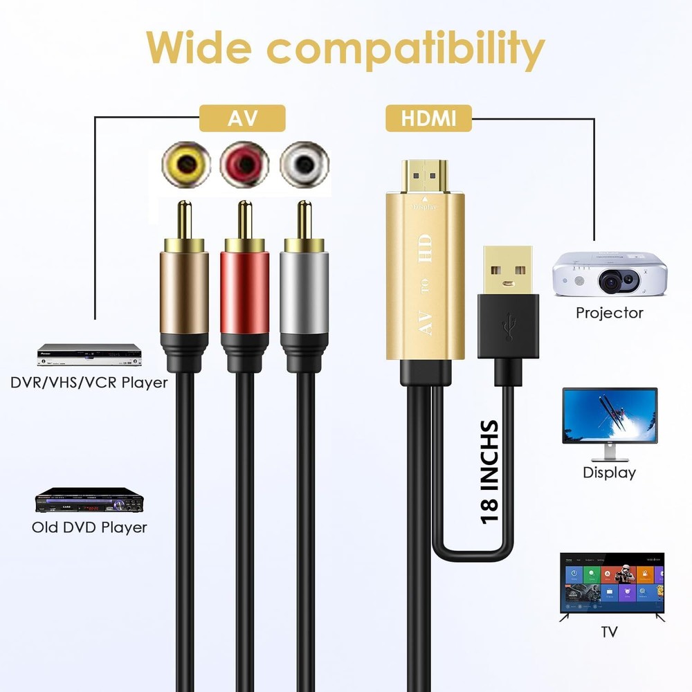 RCA to HDMI Converter for Smart TV - Composite AV to HDMI 1080P Aluminum Alloy Video Audio Adapter for VCR/DVD/VHS Player/Roku/PS2 Game Console - 6 Feet (Golden) Connect old AV devices to modern HDMI-equipped TV: This RCA to HDMI converter can convert analog RCA composite input to HDMI up to1080P output. Great for using older video players with smart TV, easily connected old-school VHS/DVD/VCR player to smart TV, you can watch old equipment sources and use old game systems on new TV that may not have RCA, which can bring back your childhood memories. Perfect for making old video peripherals useful again. All in one AV to HDMI Cable Adapter: Supplied with RCA male cable, HDMI cable, and USB power cable, features a built in RCA to HDMI converter chipset, no need to buy extra cable, Hassle Free and Save you money by eliminating the need for extra components. Great For Viewing VHS and DVDs from old analog Player to New Digital TV. Easy HDMI hook up for older AV devices: Easy to use, no need any drivers, just plug to play, Please remember to hook up the USB power cable to 5V power source to make it work, you can get it to work within minutes. Note: the Audio Video cable to HDMI Converter only support converts AV to HDMI, can't converts HDMI to AV. 1080P HDMI Quality Supported: The av to hdmi converter has an built in authentic HD chip that supports advanced signal processing with great precision, colors, resolutions scale up to 1080P HDMI. Wide Compatibility: This composite to hdmi adapter is widely applied to use your old DVD, VCR, VHS, Android TV box, PS2, PS3 or game system with RCA input to connect to your new HDTV or HDMI only monitor, this RCA to HDMI converter is the right choice. If you want to use your DVD, VCR, VHS, Android TV box, or game system with RCA output to connect to your new HDTV or HDMI, this RCA to HDMI converter is what you need. RCA to HDMI Converter Kit: Contain all necessary cables you need, such as Male RCA cable, HDMI cable, micro USB Power cable and built-in intelligent chip, no need to buy extra cable, more convenient to use. Features: Converter RCA signals into HDMI signals so you can watch your video on your HD Smart TV. No need to buy extra RCA cable and HDMI cable. No driver need,just plug and play. Helped to play your video consoles with your newer TV,then you got back to live your memories again. Allows you to view your favorite VHS tapes and preserve memories. It can bring back your family memories, relive your childhood in seconds, and it’s also a ideal choice for those who still love playing older game systems. Makes it easy to get old tech to work with new tech without a whole lot of fuss and costs. Note: This converter is not bidirectional. Just a one-way connector only, convert signal from RCA to HDMI. It can not convert HDMI to RCA. Shipping We offer FREE shipping on all orders! We ship within Three business days of payment, usually sooner. We use a selection of shipping services such as UPS, FedEx, USPS etc. We only ship to the lower 48 states, no APO/FPO addresses or PO Boxes allowed. Local pickups and combined shipping options are not provided at this time. Return You can return a product for up to 30 days from the date you purchased it. Any product you return must be in the same condition you received it and in the original packaging. Please keep the receipt. Feedback Customer satisfaction is very important to us. If you have any problem with your order, please contact us and we will do our best to make you satisfied. Contact Us If you have any queries, please contact us via ebay. We usually respond within 24 hours on weekdays. Please visit our eBay store to check out other items for sale! Thank you for shopping at our store.