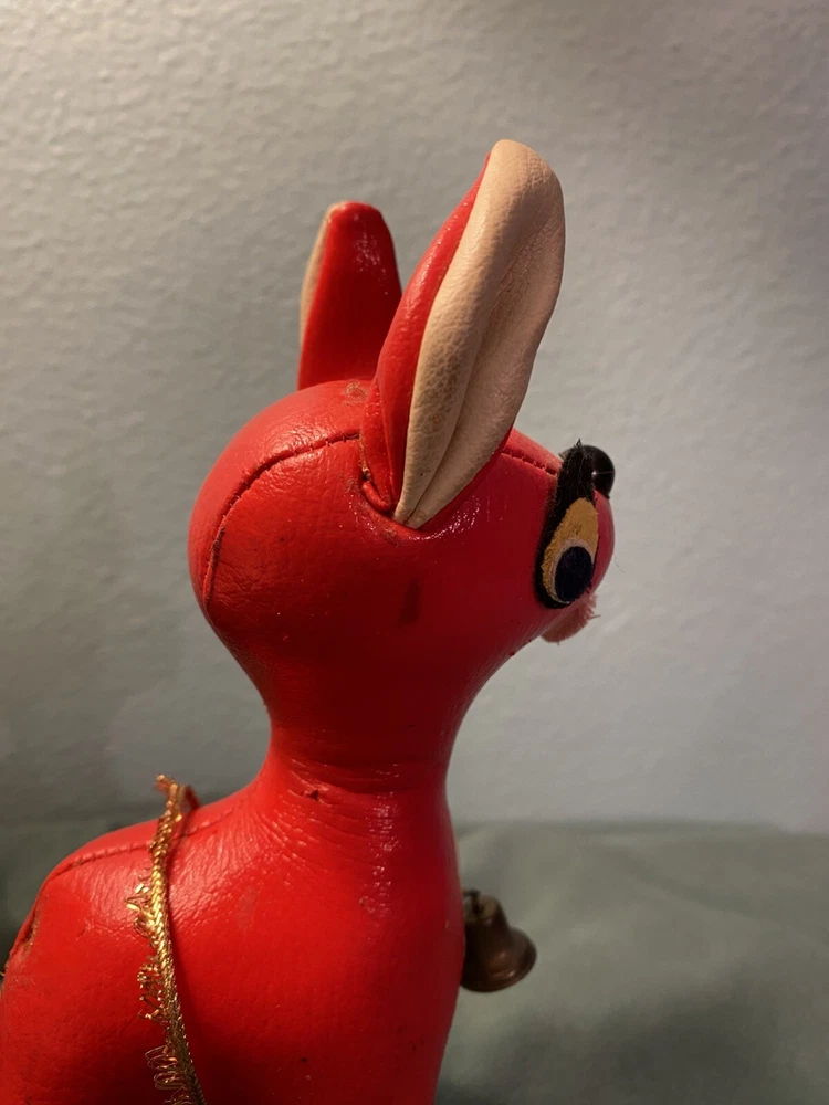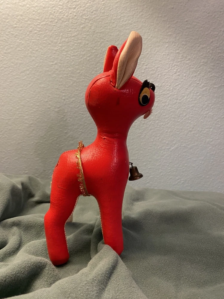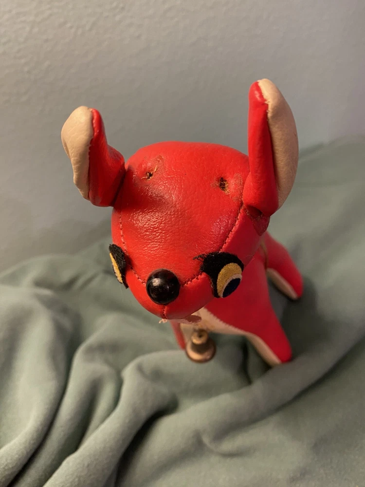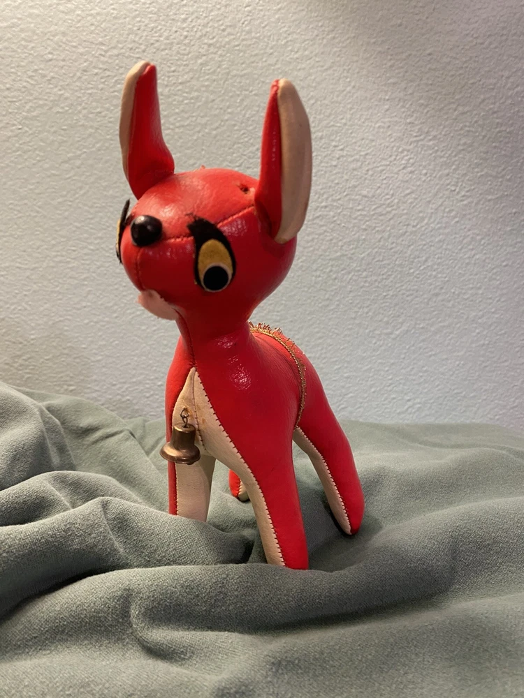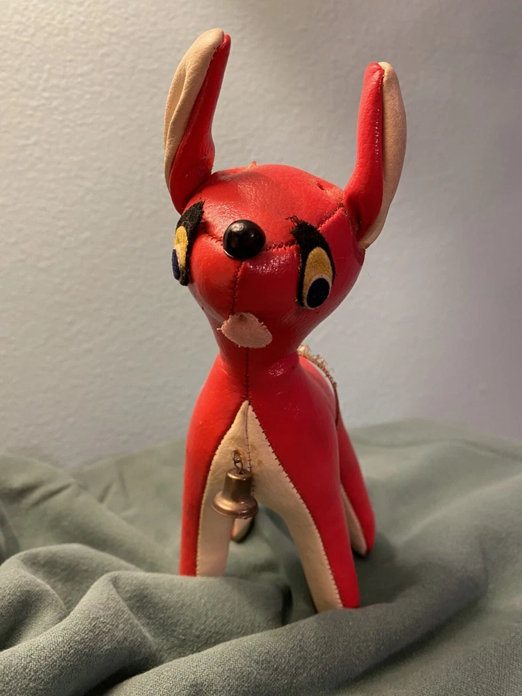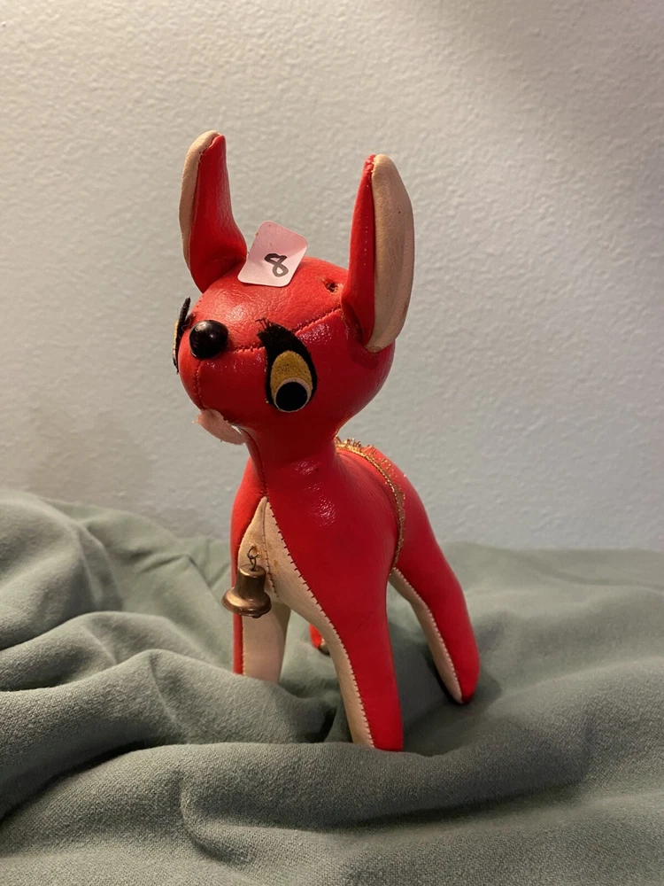 This vintage vinyl/leather stuffed reindeer deer toy is a perfect addition to your Christmas decor. Made in Japan, it exudes a charming and timeless appeal that is sure to capture the hearts of collectors and enthusiasts alike. Its smooth surface, combined with its durable and high-quality construction, makes it a great choice for kids and adults alike. The reindeer deer toy is suitable for ages 4 and up, and it is perfect for anyone who loves vintage and antique toys. Its character family is deer, and it is made in the United States. This toy is sure to bring joy and cheer to anyone who adds it to their collection. This toy shows its age, it’s missing its antlers and tail. Please see all pictures for condition.