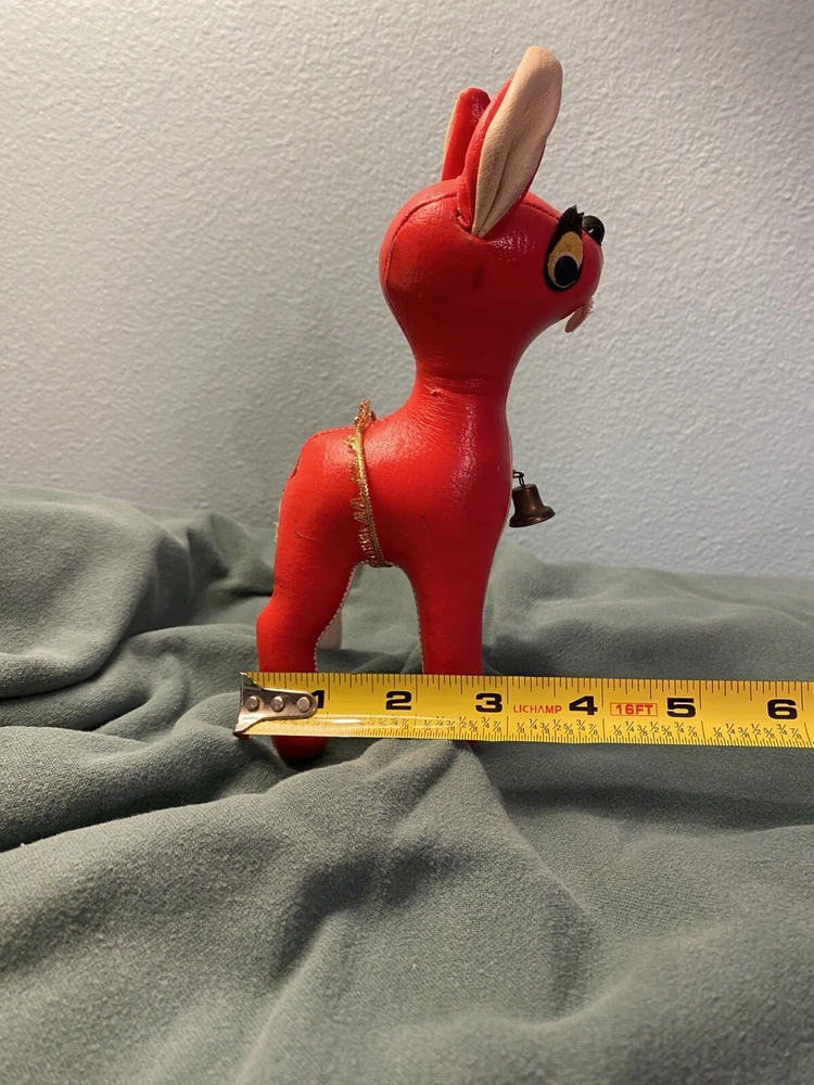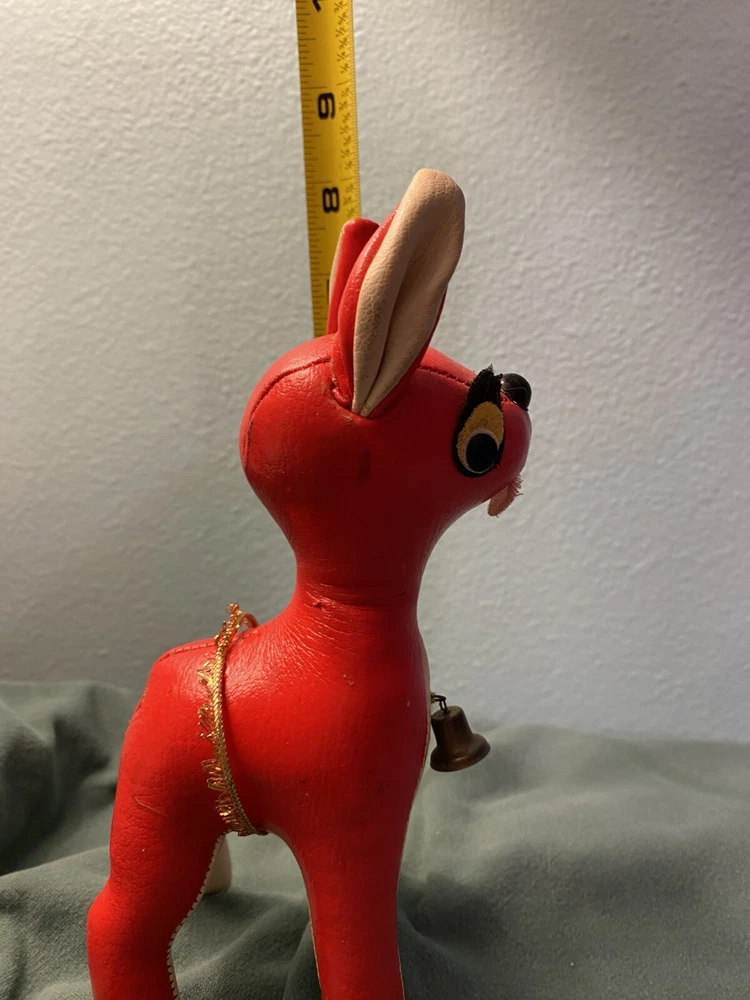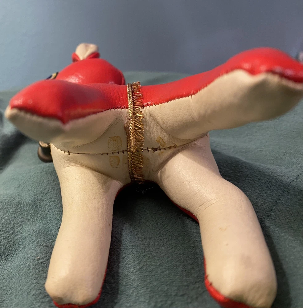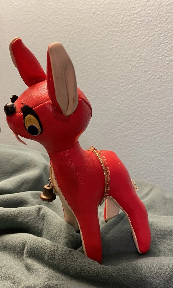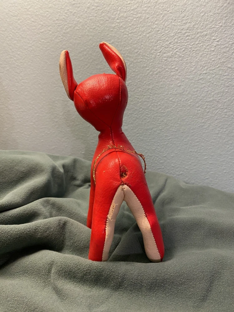 This vintage vinyl/leather stuffed reindeer deer toy is a perfect addition to your Christmas decor. Made in Japan, it exudes a charming and timeless appeal that is sure to capture the hearts of collectors and enthusiasts alike. Its smooth surface, combined with its durable and high-quality construction, makes it a great choice for kids and adults alike. The reindeer deer toy is suitable for ages 4 and up, and it is perfect for anyone who loves vintage and antique toys. Its character family is deer, and it is made in the United States. This toy is sure to bring joy and cheer to anyone who adds it to their collection. This toy shows its age, it’s missing its antlers and tail. Please see all pictures for condition.
