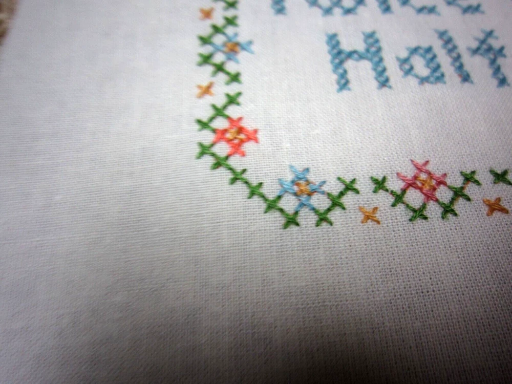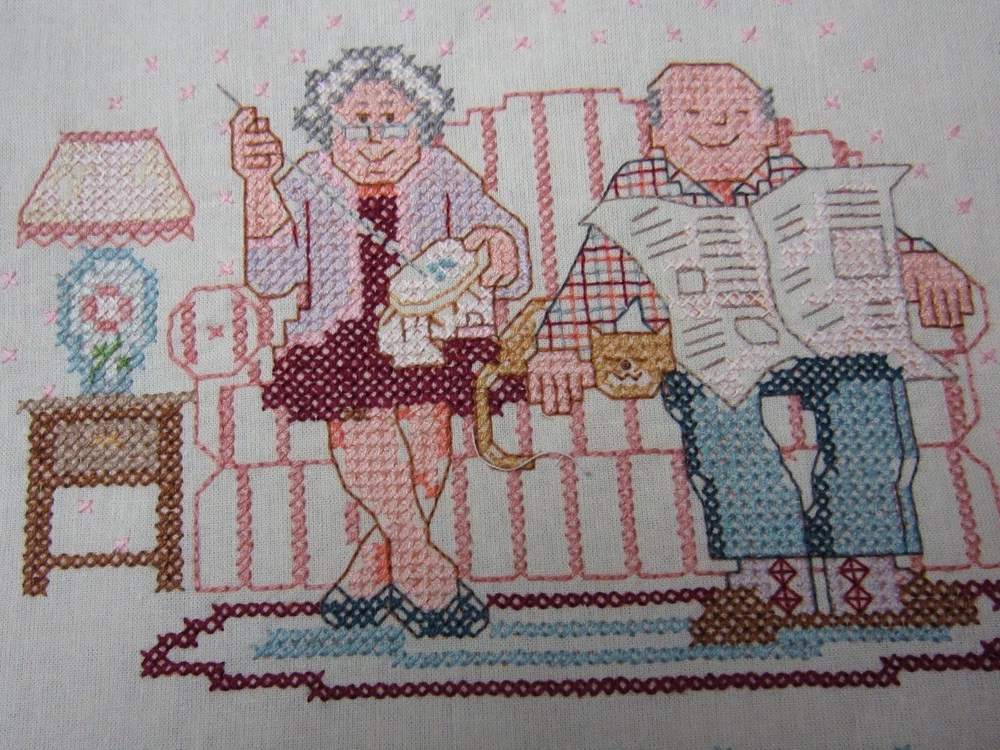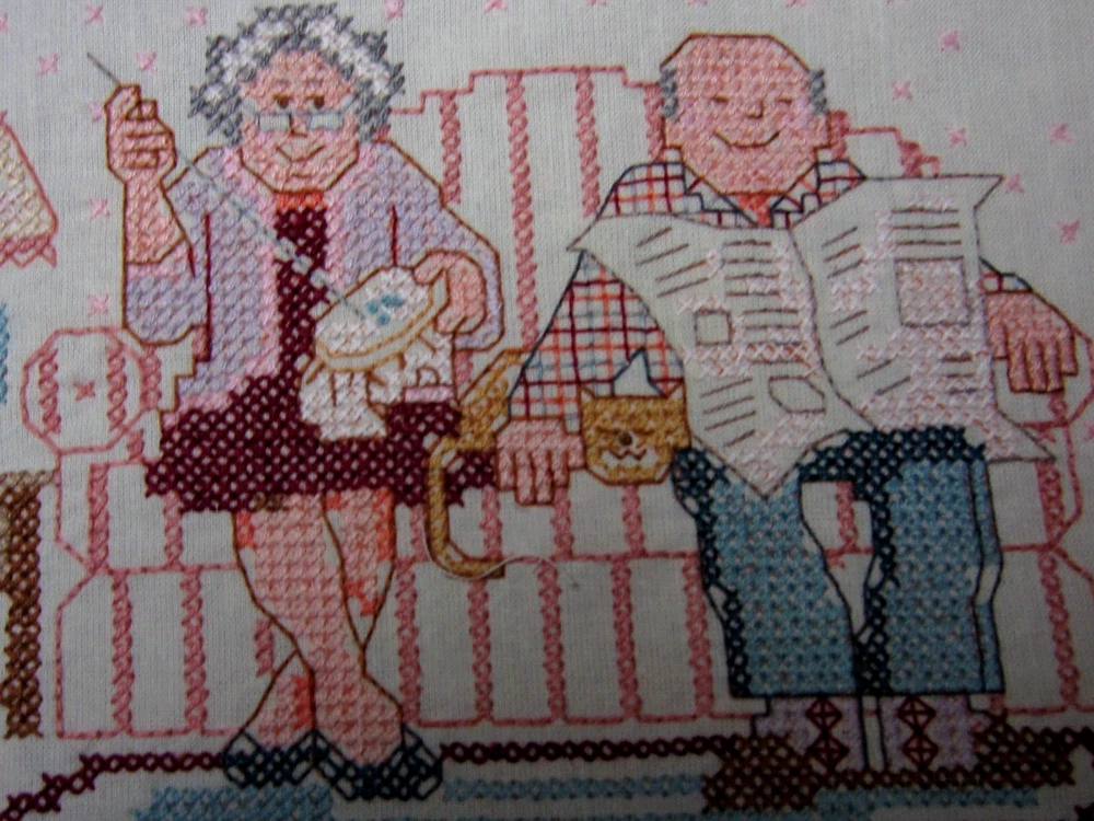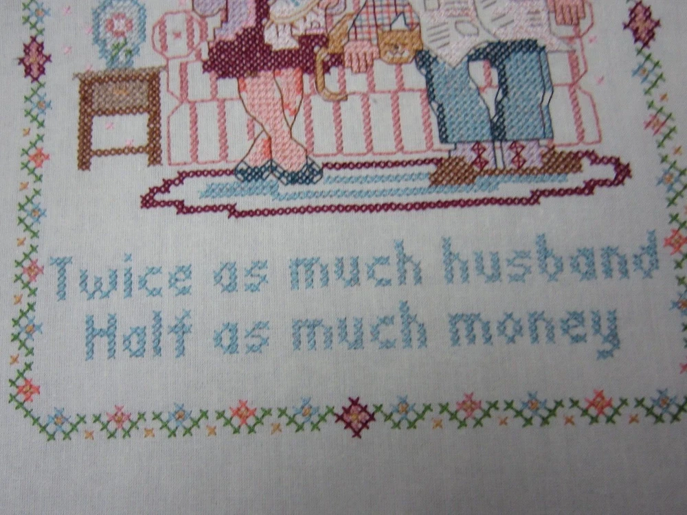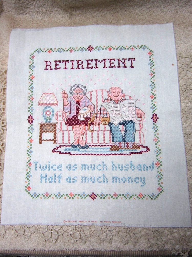 HAND-STITCHED CROSS-STITCH PILLOW TOP "RETIREMENT ----- TWICE AS MUCH HUSBAND, HALF AS MUCH MONEY" MEASURES 13 1/2" X 11" READY TO BE MADE INTO A PILLOW EXCELLENT CONDITION ---- NICELY STITCHED! Please e-mail me with your questions before making a purchase, as all sales are final with no return or refund. Thank you for looking!