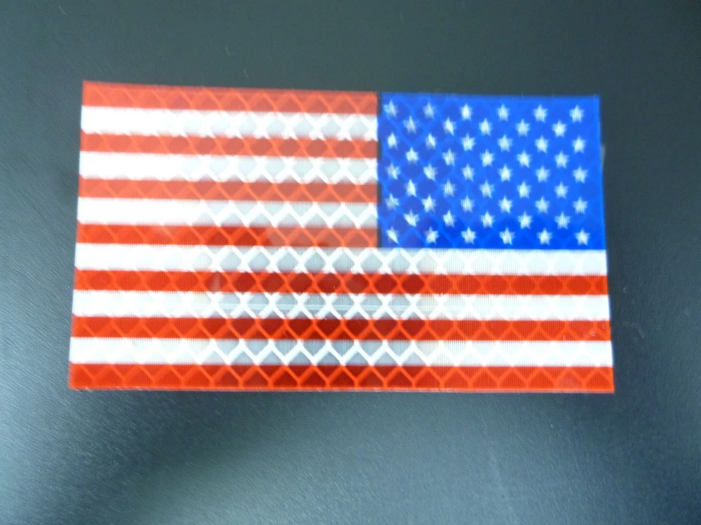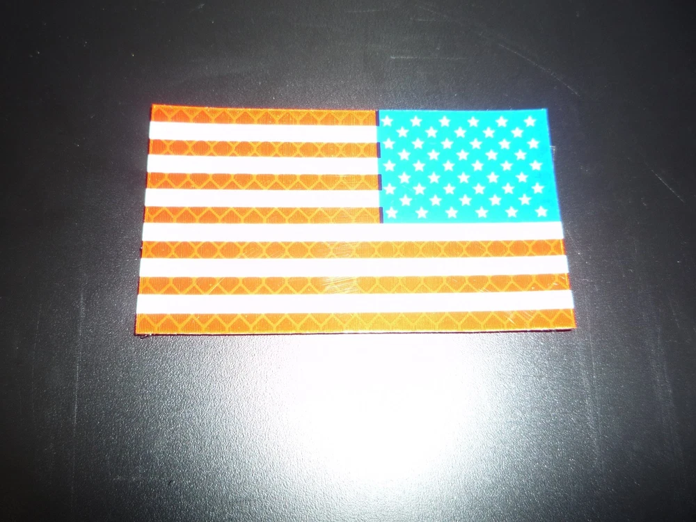 BETA PRINT RUN 2ND PATCHES These patches were the first patches printed in our development of a new product line. It was not until these patches were tested in the field that a problem was detected. These patches have a weakness. If placed on a curved surface the reflective material may separate from the VELCRO® BRAND FASTENER . We did not wish to sell these patches without warning the customer of the issue. We have determined that in order for HV patches to be the best possible durability we will have to add a sewn Merrow edging to them. Once the new and improved patches are printed we will list them. 1 HIGH VIS Reflective PATCH 3.5” X 2” REVERSE USA FLAG RED AND BLUE ON REFLECTIVE Hi-Vis The Red and Blue are transparent and also reflect. Pictures do not do these patches justice they are really beautiful, glossy and extremely reflective. WITH VELCRO® BRAND FASTENER $5 EACH HV Patches are patches made by Anytime Sign, Inc., introduced in 2016 using the MOST REFLECTIVE MATERIAL KNOWN TO MAN. Patches are made with 3M solvent screen printing ink and 3M reflective material for the highest quality, most highly visible patch possible. Hi-Vis patches are made in the USA with all USA materials including VELCRO® BRAND FASTENER with HIGH HEAT 330 PSA 0172 adhesive. WHEN SAFETY IS A MATTER OF LIFE AND DEATH... Question: What are the advantages of Hi-Vis Patches ? Answer: Hi-Vis Patches replace other patches that are not reflective or have very little reflectivity for safety and efficiency. 1) Night Visibility - HV Patches are the Most reflective, most Highly Visible Patches in the world. 2) Changeability- HV Patches attach with VELCRO® BRAND FASTENER 3) Flame Resistance - HV Patches can withstand some open flame without distortion or singing of the patch. 4) Fine Detail - HV Patches can have the finest detail image. We make our transparent positives with a laser Imagesetter. 5) Exotic colors and metallic capabilities - HV Patches have colors that are brighter and colors can be metallics like silver and gold and "hot" inks like hot pink and neon green. 6) Longevity - HV Patches are made with 3M materials and VELCRO® BRAND FASTENER to last longer than other patches. 7) Conformity - HV Patches are NOT as flexible as cloth patches - we recommend purchasing a sample patch before placing large orders. 8) Cleanability - HV Patches can easily be cleaned with water or glass cleaner after removal from clothing. 9) Launderability - HV Patches attach with VELCRO® BRAND FASTENER, must be removed before washing clothes. 10) Custom Images - because HV Patches are solvent screen printed, custom images require a minimum 25 patches order. VELCRO® is a registered trademark of Velcro BVBA, used with permission.