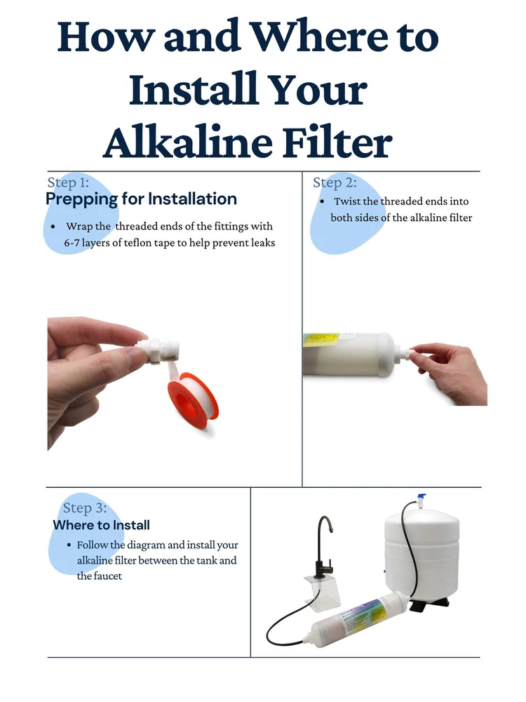 The Aptera Alkamag inline alkalinity filter is a true alkaline ionized filter that features 10 levels of filtration using premium medias, cermaics, and a magnet that emit far infrared rays, increases pH and alkalinity, lowers ORP, and gives your water a refreshing mineral flavor. Levels of Filtration -Sediment Filter Pad -KDF/Redox -Almandine Garnet -Super Cermamic -Pi Ceramic -Negative Ion -Tourmaline -CalCor (Calcite/Corosex) -Quartz -Neodymium Magnet Studies have shown that alkaline water enable the human body to function more efficiently as it does not have to buffer as much the acids we take in through food and drinks. The Aperta inline alkaline filter is recommended for post RO (Reverse Osmosis) use and includes a neodymium magnetic module. The Aptera alkaline ionized water filter requires a very slow flow rate of 0. 25-. 5 gpm in order for the water to have sufficient contact time with each of the medias of the ionized water filter. Using this filter in combination with your current water filter system gives you pure & great tasting water with more health benefits than standard filtered water. INCLUDES QUICK-CONNECT FITTINGS AND FILTER CLIPS. The filter includes two 1/4" FPT x 1/4" quick connect fittings and two 2. 5" double clips, making connecting your filter quick and easy WITHOUT going to the hardware store to get additional parts to connect. Increase your pH by 1. 0 - 1. 5 points AND lower the ORP of you water Provides truly alkaline water using minerals, ceramic beads, neo magnets, and far infared rays Includes two 1/4" quick-connect fittings to make adding the filter to your system quick and simple Includes two 2. 5" double clips to attach the filter to your current system Best results will be achieved by using with an RO system and . 25-. 5 GPM flows