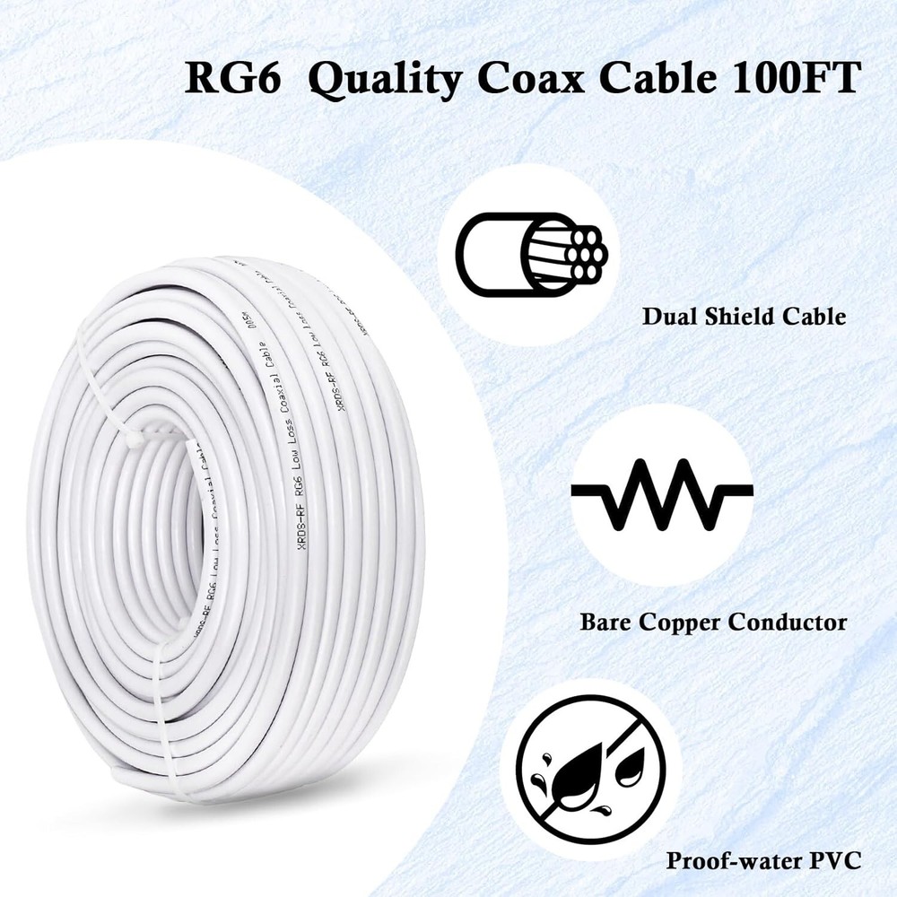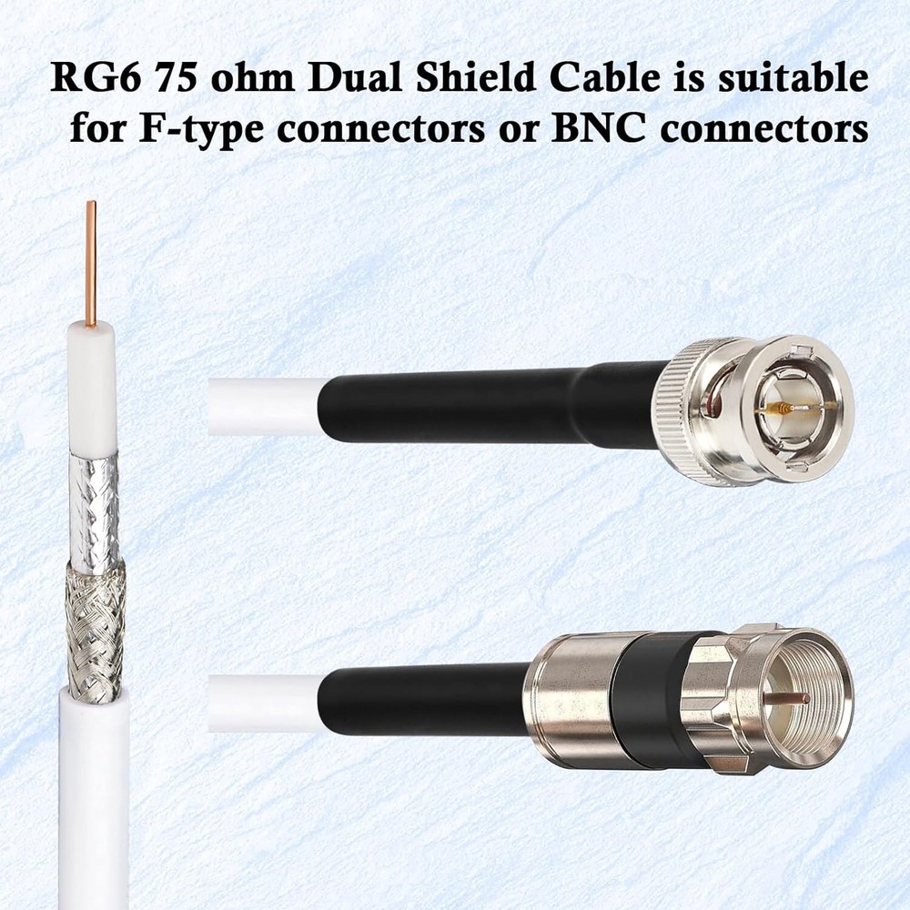 RG6 Dual Shield Cable that made of Aluminium magnesium alloy braid and aluminum foil conductor. Our RG6 coax cables have been sweep tested up to 6GHz.75 Ohm swept tested. The conductor of this 100ft rg6 coaxial cable is solid bare copper that is required for satellite installations, and is superior to copper clad steel (CCS). The Jacket is made of the flexible and proof-water pvc that could be used so long in the harsh environments in the outdoor. Polyvinyl Chloride (PVC) cable jacket fire safety rated to CMR/CATVR/CL2. Pair with 75 Ohm BNC connectors can handle 6Gbps for accurate video, RF signal transmission and full SDI performance Pair with F-type connectors for professional custom installations. Easy connection for TV's, VCR's, cable modems, satellite receivers, off-air antennas & other coaxial F-Pin enabled devices.