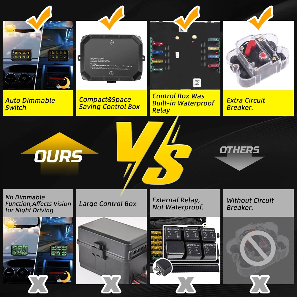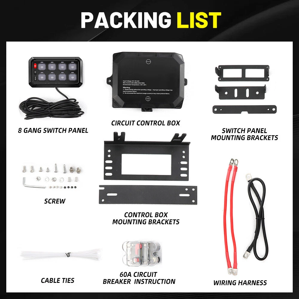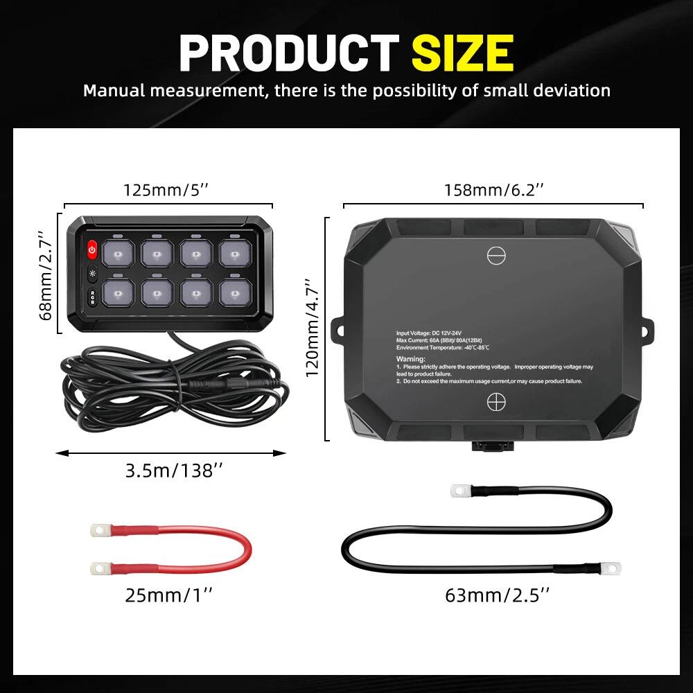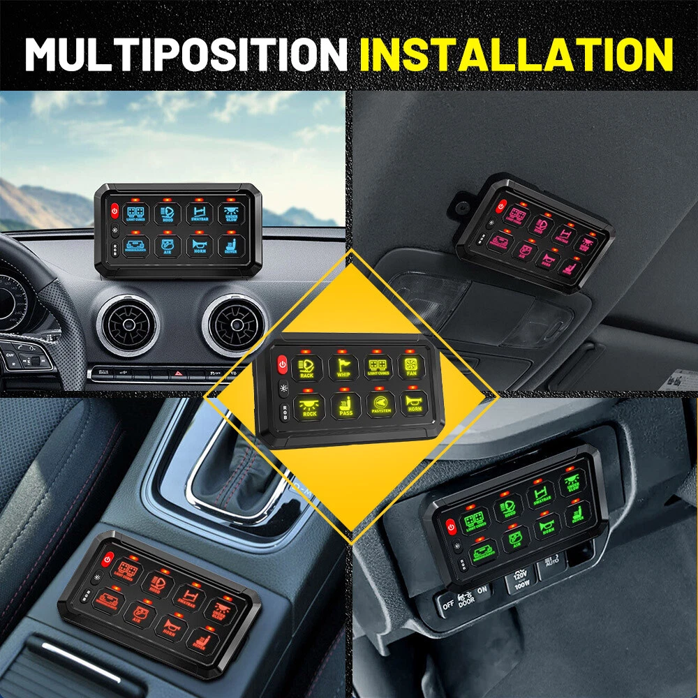 Specification: Working voltage: DC 12-24V Switch operation: On - Off Power switch type: press the button Button color:RGB Operating at 12 Volts: max power rating of 720W Operating at 24 Volts: max power rating of 1440W Max current: 60A Operating temperature: -40°C - +85°C Packing included: 1 Set of 8 Gang on-off Control Switch Panel with panel,switch stickers,wiring harness, mounting accessories, and all required mounting hardware RGB 8 Gang Switch Panel Auxiliary Control ACC Electronic Relay System 12V/24V 8 Gang RGB Switch Panel ACC Features: - Multi-position installation and wide application . with different brackets, it can be installed in any position you like. - All in one design for your ultimate convenience. This kit has everything you need for installation and use. No need to buy extra parts. - Universal 8 switch panel relay system. power up to 8 lights & accessories from one convenient place. - Customize your own panel , with 50 universal switch stickers, you can customize your unique personal switch panel according to certain needs. Specification: Working voltage: DC 12-24V Switch operation: On - Off Power switch type: press the button Button color: R G B Operating at 12 Volts : max power rating of 720W Operating at 24 Volts : max power rating of 1440W Max current: 60A Operating temperature: -40°C - +85°C How to connect the red, yellow and white cables? 1. Connect the red cable to the ACC. If you want to light up the LED lamps before the car start-up, please connect the recommended because the higher the power is, the more the power of the battery will be consumed. 2. The yellow cable connects the width lamp to the master switch panel. 3. Connect the white cable to a momentary push button to adjust through three different brightness levels of the switch panel. if you just want to have the most brightness switch panel, you can disconnect it. Fits many applications: UTV, for Polaris RZR XP, Turbo, for Can-am, Sand Rail, Side by Side, Truck, Jeep, Car, Race Car, Off-Road, SUV, Tractor, Marine, Boat, Camper, Van, GMC, Motor Home Utility and high-performance vehicles Note: 1. Please allow 1-3cm (0.4-1.18") difference due to manual measurement and slight color variation for different display setting. 2. Due to the difference between different monitors, the picture may not reflect the actual color of the item. Packing included: 1 Set of 8 Gang on-off Control Switch Panel with panel,switch stickers,wiring harness, mounting accessories, and all required mounting hardware Payment Delivery details Return About us Contact us Payment 1. We only accept PayPal as the payment method, which allows you to pay quickly and securely. 2. All products will be sent to your PayPal address. Please make sure your eBay address is correct before placing your order. 3. If you would like to change your address, please contact us via eBay email as soon as possible before the order is shipped. Delivery details -Package can be shipped out to you within 3 working days from USA -The default expected delivered time is 2-7 working days -We send the most packages via USPS/UPS/Fedex/DHL and other air mail. -Please be kindly note that there will be custom duty or tax for certain items in some countries. It is the buyer's responsibility to pay for the clearance. -If you have any questions or issue about delivery, please contact us via eBay Messages and we will do our best to make sure you’re happy. Return Out 30-day Satisfaction Guarantee assures our customers that they will receive all orders promptly and exactly as described. In addition , it allows customers to return new and unused products in their original factory condition for any reason within 30 days from the date of purchase. Notice: 1.We will provide 3-year warranty. And you may return all products within 30 days of delivery for replacement or refund if you're unsatisfied with them. 2.All return items must be in brand new condition which means the item is never installed and kept in original packaging with whole integrity. 3.We offer the pre-label for our customer who received the broken/ defective/wrong item. But please be kindly note that the customer has to pay for the returning shipping fee unless a mistake is made by us. 4.For the returned products, we will arrange a new replacement or issue a refund after we have received your package and inspected it. About us 1.We operate the shop based on the principle of " quality first, credit first, customer first, integrity". Please contact us to solve the problems firstly if you have any ones. 2.We specialize in producing and selling LED working light/ LED headlight/ LED light bar/ LED headlight bulbs etc. 3.Due to the time difference, we may not be able to respond to your message in time, we will check the message and solve your problem at the first time.Our Customer Support Working Time:(GMT+8)Monday to Friday,9:00-17:00. Contact us Our Working Time: (GMT+8)Monday to Friday,9:00-18:00. For inquires and customer support, please send your email via ebay email system. All emails will be responded to within 24 hours during business days. On Dec 3, 2024 at 14:35:44 PST, seller added the following information: