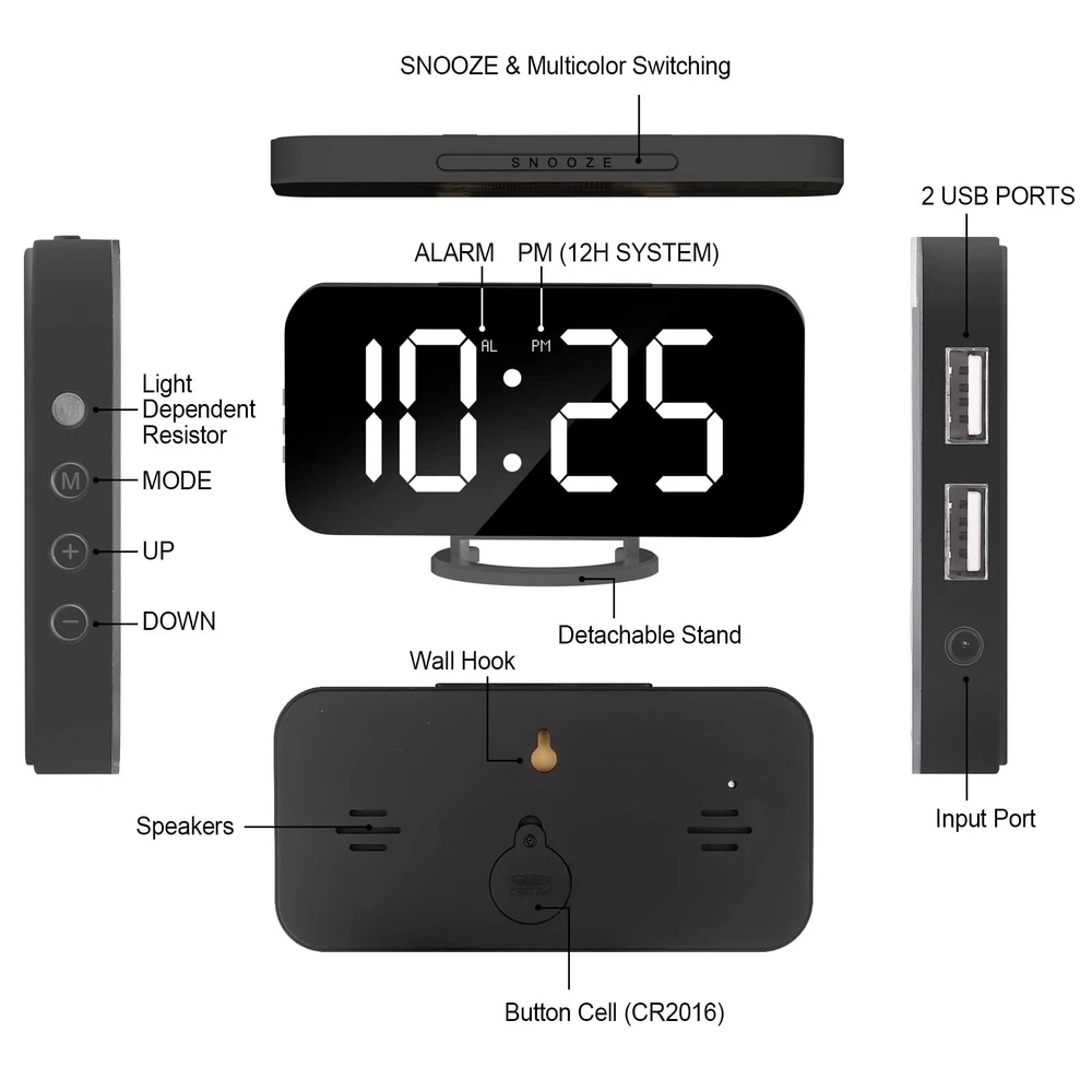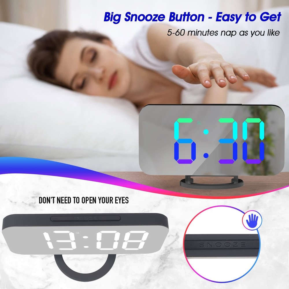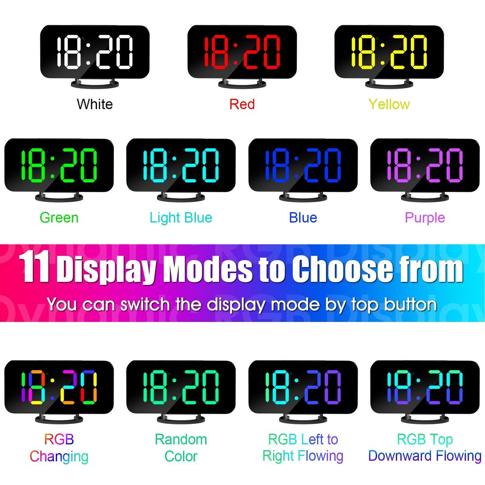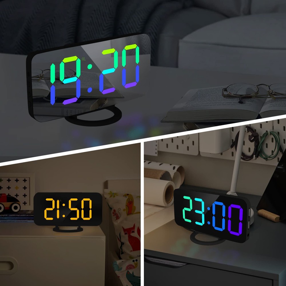 RGB Digital Clock - LED Alarm Clocks Large Display Mirror Surface with Dual USB Ports for Modern Decorations Aesthetic Home Bedroom Living Room Office and Wall Decor - Black ⏰RGB COLORFUL DISPLAY - RGB digital alarm clock with 11 color display modes (4 dynamic modes + 7 fixed modes) to increase the visual experience. You could change the display color mode by pressing the big button on top. Simple and atmospheric appearance, very suitable for living room, bedroom, office etc ⏰NEW 6 LEVEL BRIGHTNESS - This Led alarm clocks is equppied with a light sensor and 6-level brightness display. You can manually adjust the brightness, or turn on the automatic adjustment mode, this electronic digital clock will automatically dim the brightness according to the brightness of the room. (Level-1: 0% brightness, level-6: 100% brightness) ⏰LARGE MIRROR SURFACE - You can clearly see the time within 30 feet, digital clock with a 6.5" HD large display and mirror surface. Ladies and girls can use this mirror clock for makeup, men and teens for shaving etc. Stylish and functional ⏰DUAL USB PORTS & BIG SNOOZE BUTTON - Alarm clock dual USB ports design allows you to charge two devices at the same time. Big snooze button helps you turn off the buzzer easily, allowing you to get 5 to 60 minutes (settable) of extra sleep time 💝GREAT GIFT - You can imagine several scenarios, a RGB color-changing mirror clock in the party, a led clock that changes brightness according to the brightness in the bedroom or office. It will be a perfect gift for your friends and family 👨❤️👨100% SATISFACTION GUARANTEE - You will get: 1 x Digital Alarm Clock + 1 x USB Charging Cable + 1 x Product Manual + 30 Days Unconditional Money Back/Exchange + 1 Year Warranty. If you are not satisfied with any of our products, please contact us by email and we will provide a solution within 24 hours. The lowest is very dim for sleep, the highest is so bright that you can't miss it in the room and it's a so modern decor in your house. SHIPPING Domestic Buyers - We have confidence in our products, but if you are not fully satisfied please contact us within 30 days of purchase and you will get full refund. - We ship within 3 business days of payment, usually sooner - We offer FREE shipping on all orders! - We only ship to the lower 48 states, no APO/FPO addresses or PO Boxes allowed International buyers – please note: Import duties, taxes, and charges aren't included in the item price or postage cost. These charges are the buyer's responsibility. - Please check with your country's customs office to determine what these additional costs will be prior to bidding or buying. * Order Cancellation Policy ** You can return a product for up to 30 days from the date you purchased it. 1. The seller reserves the right to cancel the special case only due to eBay cancellation fee. 2. The decision of seller is the final. 3. The seller will respond to the cancellation request within 2 business days. Please wait for the result of cancellation. 4. In case the cancellation is not completed by some reasons, the buyer can follow the options below to get the refund. 4.1 The buyer can reject the item when it arrives. 4.2 The buyer can send the item back to the seller within 30 days If the buyer receives item (USA Shipment ONLY). The seller will provide the FREE return label to the buyer when the buyer opens " Return Item" case on eBay by using the reason as "Change my mind" ONLY. 5. When buyer has placed the order. The order will be processed and completed by automatic warehouse system within 5 minutes. In case that buyer sends the cancellation request after 5 minutes of placing the order, the request will be rejected. **Sending direct message to cancel the order is not allowed for every case.* Return Policy For the return case - If buyer would like to return the items for refund or replacement, please CONTACT SELLER to receive the free return label from seller. The refund or replacement will be processed with the tracking number of return label which is provided by seller only. The other ways of return which are not approved by seller will not be processed for the refund or replacement.
