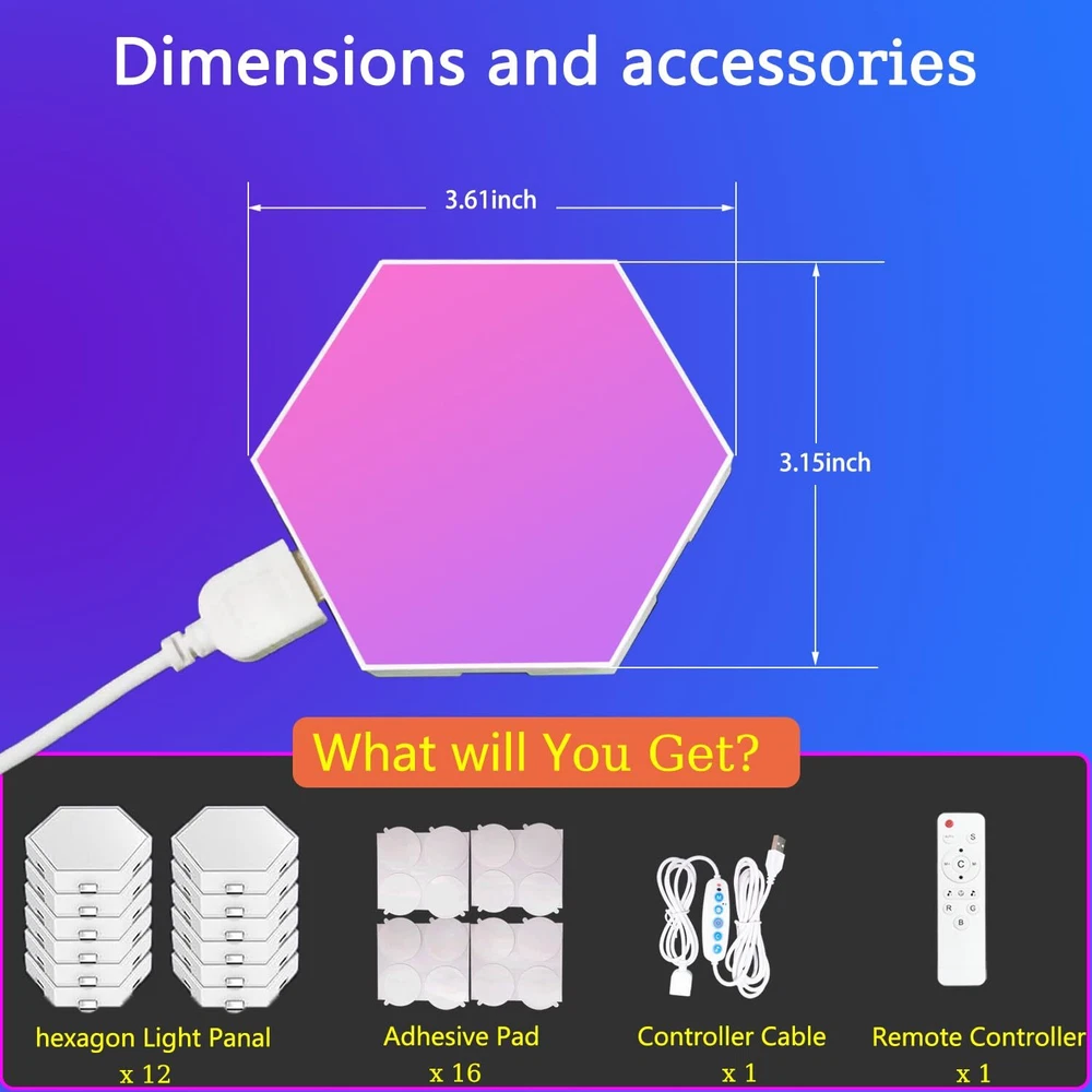 Versatile Lighting: This 8-pack of hexagon light panels offers smart RGB LED lighting with app and remote control for customizable ambiance. Modular Design: The modular hexagon tiles can be arranged in various shapes and patterns to suit your space and creativity. Music Sync: Enjoy an immersive experience as the lights sync with your favorite tunes, creating a captivating visual display. Multiple Modes: Choose from various lighting modes, including static colors, dynamic effects, and DIY customizations. Ideal for Spaces: Perfect for living rooms, bedrooms, gaming setups, or as a unique gift for DIY enthusiasts and kids alike.