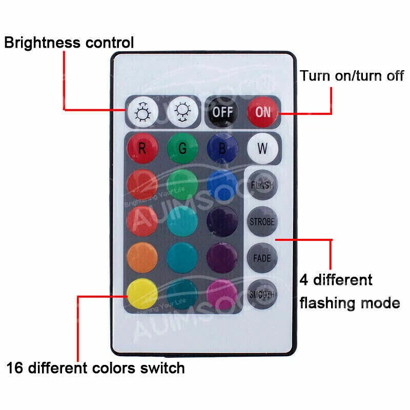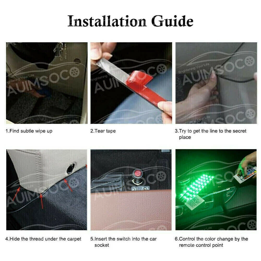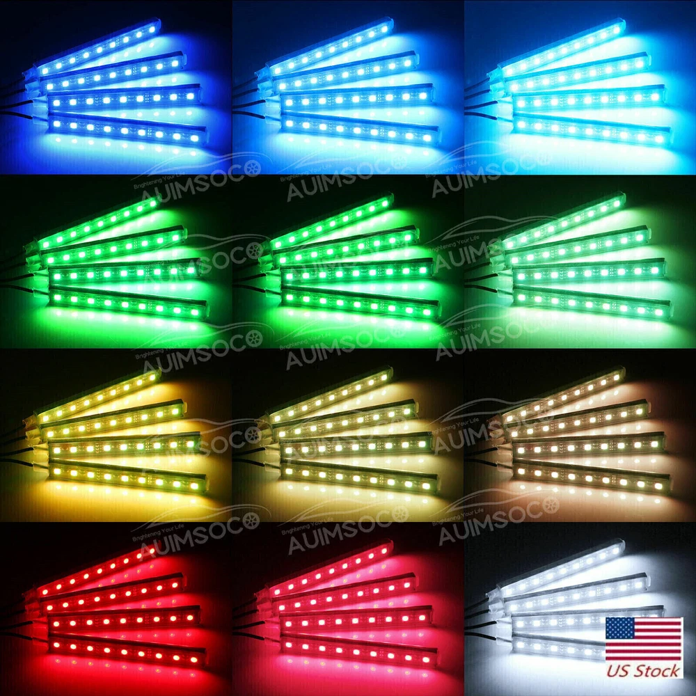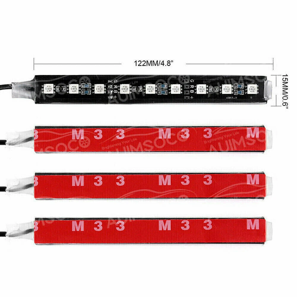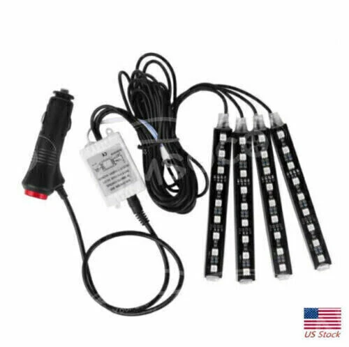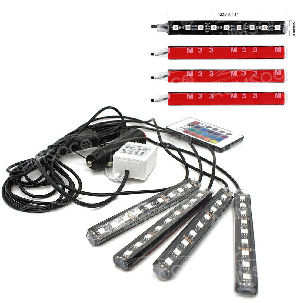 Specifications: Number of LED's: 9 LEDs Per Light Colour of LED's: RGB Colourful Voltage: 12V Size: 120 x 15 x8mm Installtion: Direct inserted in cigarette lighter 100% Brand New and tested before shipping Source Type: 5050SMD Waterproof Level: IP65 Scope: ambient lighting Single size: 12CM Current: 0.03A Voltage: 12V Power: 3W Source: LED Colorful Lamp beads: 4 * 9LED APPLICATION: Universal Package Included: 1 Set 4PC LED Interior Light 1 pc Remote Controller
