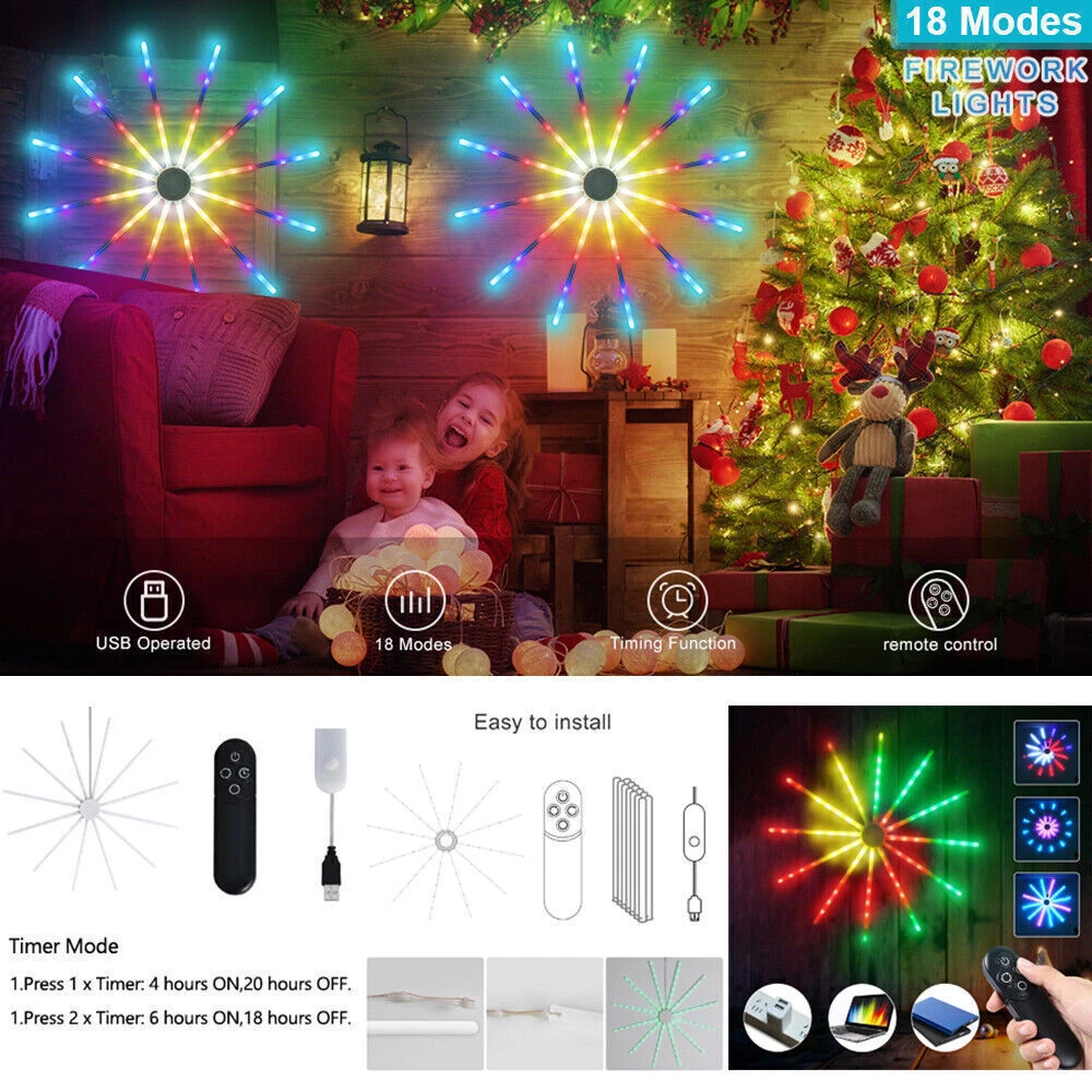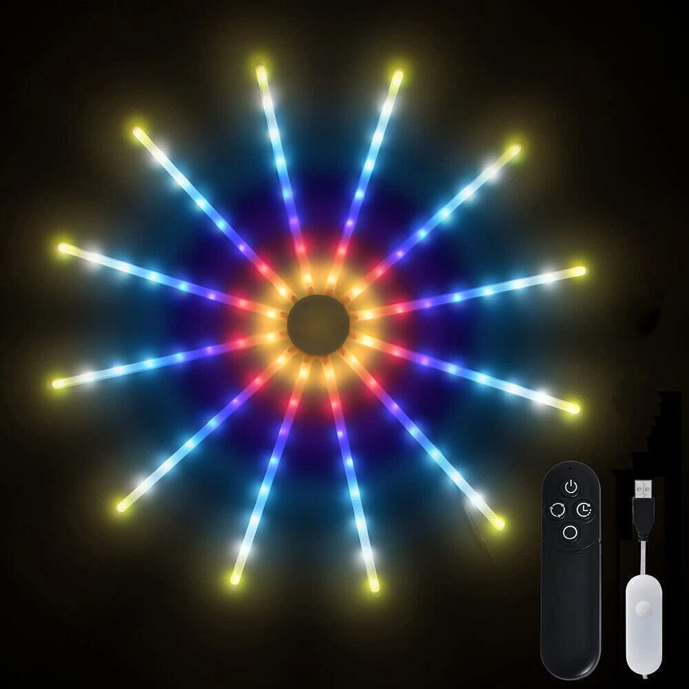Product Description RGB Dreamcolor LED Firework Light Remote Control 18 Modes String Lights Wall Hanging Lights for Home Party Patio Garden Christmas Valentines Wedding Decorative Description: Features: *【New Design RGB Dreamcolor Firework Lighting Effect in a Plane】With 12 branches copper wire fairy lights which can be built-in 12pcs PC tubes, built-in smart IC, this firework light creates 18 dynamic modes of RGB dreamcolor change lighting effects. USB operated with a modes adjustment button and remote control. *【Wireless RF Remote Control】Support for up to 15 meters / 49.2ft effective receiving range to control On/Off, Timer and 18 different modes (Color Slow-Glow, Color Fast changing, Flash, Slow-moving, Meteor-flash, Fan rotation Effect, Windmill rotation effect, Lineup forward, Chasing forward, Chasing backward, heap up, etc), operated by 2XAAA battery(not included). *【USB Powered LED Fairy Lights with Switch Button】5V/1A USB powered, very easy to use. You can use the remote or USB with a switch button to control the 18 dynamic lighting modes which can create a warm and surprisingly suitable atmosphere for any occasion. *【RGB Dreamcolor LED Firework Lights *【Timing Schedule String Lights】You can press the timer button to set up a personalized time, press first time it will be 4 hours on and 20 hours off, press second time it will be 6 hours on and 18 hours off. with a hanging hole, can be a perfect hanging light for bedroom, Xmas, bar, window, room, wall decor. *【IP65 Waterproof Indoor & Outdoor Lights】Withstand all kinds of weather, including heavy rain and heavy snow, outdoor decoration and high-quality LED fireworks lights sparkling and colorful, but the USB port is not, please keep the USB port away from water. *【Perfect Decoration】With low-energy consumption, the twinkle lights can be widely used for bedroom, birthday, parties, Christmas, Halloween, garden, patio, tent, etc. Specifications: Materials: Copper, Plastic Copper Wire Color: Silver LED Light Color: RGB Dreamcolor Working Voltage: 5V Battery Model of Remote Control: 2X AAA Battery(Not included) LED Qty.: 96LEDs(12 wires, 8LEDs each wire) Size: 60x60CM(WxH)/23.62*23.62inch(WxH) Lead Wire Length: 4M/13.12ft Modes: 18 Lighting Modes Waterproof Grade: IP65(USB Port is not waterproof) Package includes: 1X LED RGB Dreamcolor Fireworks Light 1X Remote Control(Battery Not included) 12X PC Tubes Payment Shipping Returns Contact Us Paypal. We only ship to confirmed paypal address. Items are generally dispatched within 1~3 business days after payment is cleared. Please make sure your address in Paypal is matched with your shipping address before you pay. We offer a 30 days return guarantee. If you are not satisfied with the item, you can return it within 30 days after item received. If items have any problem due to quality, please contact us for refund, exchange or a replacement. Please contact us first before item returned. Customer Service from 9:00 am - 6:00 pm on Business Days. Payment Paypal. We only ship to confirmed paypal address. Shipping Items are generally dispatched within 1~3 business days after payment is cleared. Please make sure your address in Paypal is matched with your shipping address before you pay. Returns We offer a 30 days return guarantee. If you are not satisfied with the item, you can return it within 30 days after item received. If items have any problem due to quality, please contact us for refund, exchange or a replacement. Please contact us first before item returned. Contact Us Customer Service from 9:00 am - 6:00 pm on Business Days. powered by