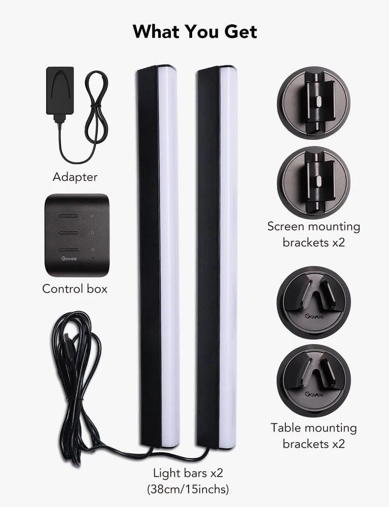 Store New Arrivals Add to Favorite View Feedback Contact Fast deliveries to the customer's home Quality customer service John Make the customers happy! RGBIC Light Bars, 15 Inches Wifi TV Backlight Suitable for 45-70 Inch Tvs, Smart Light Bars with Multiple Placement Options, Work with Alexa and Google Assistant, Black Description Created For 45-70 Inch TV: Bring your entertainment, movies, and gaming to life with the Govee RGBIC TV Light Bars. Use with the Govee Home App to control your light bars remotely or brighten your walls with preset scene modes and music modes. RGBIC Effects: Enjoy RGBIC lighting effects for your TV. With the included back buckles, the TV light bars can be rotated freely up to 90°, allowing for a wider spread of the lighting effects. The light bars don't have a color-matching function. Smart Voice Control: Use your voice assistant devices to turn your lights on and off, change scene modes, and more with Smart Voice Control. Pair your TV light bars with Alexa and Google Assistant to enjoy hands-free voice control. 8+ Dynamic Music Modes: Turn your lights into a dance party using Music Mode on Govee Home App. Choose from 8 diverse music modes to create a lively party scene for your space. Easy to Set Up: The TV light bars can be adjusted three ways to fit your lighting needs. Use the mounting brackets to mount them behind the TV or stand them next to the TV. The light bars can also be placed horizontally without the mounting brackets. Product description The video showcases the product in use. The video guides you through product setup. The video compares multiple products. The video shows the product being unpacked. H6046 A+ Video Merchant Video 1 Mount Behind 2 Lay Down 3 Stand Upright Govee x Evangelion RGBIC Gaming Light Bars The appearance of this Gaming light bar is inspired by Evangelion , meticulously recreating the EVA-01 and the anime's combat scenes, bringing to life a thrilling and immersive gaming atmosphere. Govee Smart TV Light Bar The Govee RGBIC light bar is equipped with 41 light beads. The 215° curved surface light-emitting combined with the lens doubles the brightness and spread of lighting effects. Govee Smart TV Light Bars The smart light bars have a built-in mic. The lighting will change in sync with the ambient sound, bringing you a more vivid and natural lighting effect for an immersive viewing experience. Govee Smart TV Light Bars Add to Cart Add to Cart Add to Cart Add to Cart Add to Cart Add to Cart Add to Cart Customer Reviews 4.6 out of 5 stars 3,862 4.6 out of 5 stars 6,785 4.6 out of 5 stars 645 4.7 out of 5 stars 1,652 4.4 out of 5 stars 403 4.7 out of 5 stars 1,652 4.7 out of 5 stars 133 Price $69.99 $ 69 . 99 $49.99 $ 49 . 99 $109.99 $ 109 . 99 $59.99 $ 59 . 99 $109.99 $ 109 . 99 $89.99 $ 89 . 99 $99.99 $ 99 . 99 Connection Wi-Fi+BLE Wi-Fi+BLE Wi-Fi+BLE Wi-Fi+BLE Wi-Fi+BLE Wi-Fi+BLE Wi-Fi+BLE Work with Alexa ✔ ✔ ✔ ✔ ✔ ✔ ✔ Color RGBIC RGBICWW RGBICW RGBIC RGBIC RGBIC RGBIC Dimmable ✔ ✔ ✔ ✔ ✔ ✔ ✔ Color-match Function ✘ ✘ ✔ ✘ ✘ ✘ ✔ Music mode 8 8 8 8 8 8 8 Scene mode 31 23 31 62 35 62 60+ Number of Light Beads 30 x 2 18 x 2 30 x 2 31 x 2 41 x 2 31 x 2 63 x 2 Number of Light Bar 2 2 2 2 2 2 2 Light Type Light Bars Light Bars Light Bars+TV LED Backlights Light Bars Light Bars Light Bars Light Bars Item model number H6046111 Light Source Type LED Style Modern Are Batteries Included No Power Source Corded Electric Number of Light Sources 30 Light Direction Adjustable Batteries Included? No Batteries Required? No Product Dimensions 14.94"L x 14.94"W x 14.94"H Material Plastic Maximum Compatible Light Source Wattage 24 Watts Finish Type Painted Item Package Quantity 1 Bulb Features Color Changing, Music Sync, Voice Control Item Weight 2 pounds Specific Uses General purpose Special Features Color Changing, Dimmable, Voice Control Part Number H6046111 Shade Color Black Mounting Type Wall Mount Color Black Wattage 10 watts Shape rectangular prism Voltage 12 Volts Shade Material Plastic Finish types Painted Included Components 1x Adapter, 1x Control box, 2x Light bars, 2x Screen mounting brackets, 2x Table mounting brackets ABOUT US We offer the best prices around on high quality products. Our E-store includes media such as books, movies, music and games while offering electronics, toys, sporting apparel, clothing, tools, general home, garden items and more. SHIPPING We are always working hard to ensure your package arrives as soon as possible. Please understand that some factors like weather, high postal traffic, and the performance of shipping companies are outside of our control. We offer free shipping to the lower 48 states and ship within 2 business days of payment, usually sooner. We do not accept P.O. Boxes. Please provide a physical address. For shipping outside of the continental USA, we only use eBay's Global Shipping Program. The item is shipped to KY and then sent to the rest of the world. International customers are responsible for all duties and taxes. Continue to 'check out' to calculate costs for shipping the item to your country. Messages regarding eBay's Global Shipping Program MUST be directed at eBay EXCLUSIVELY. RETURNS We offer a 30-Day Return Policy on items in which you are not completely satisfied with. You have the option of a full-refund or an exchange of the item. No returns are available on items shipped outside of the USA PAYMENT We accept PayPal. CONTACT US This page content is yet to come Please ad us to your favorite seller and visit again later Thank You CUSTOMER SATISFACTION We try our very best to make sure every customer is completely satisfied. If there's a problem, message us! We're happy to help. WE ACCEPT