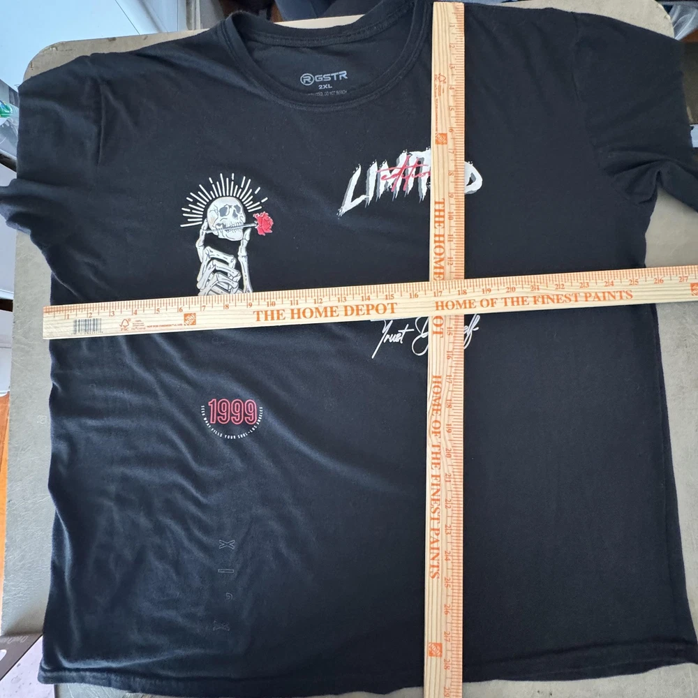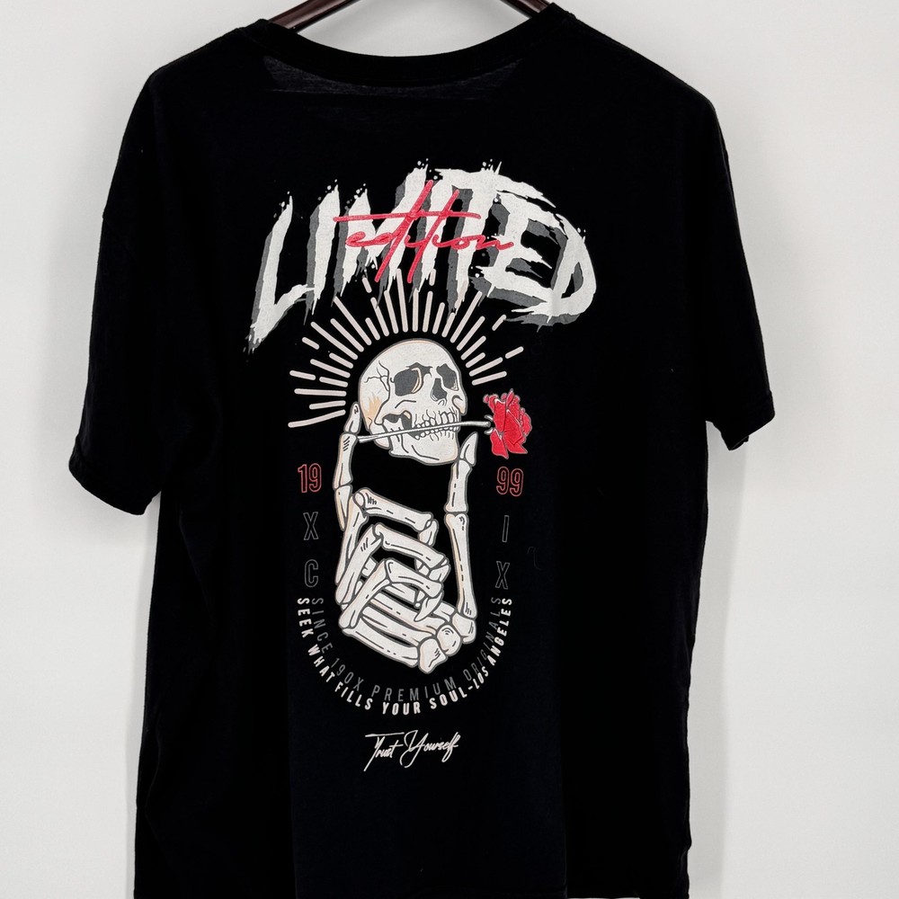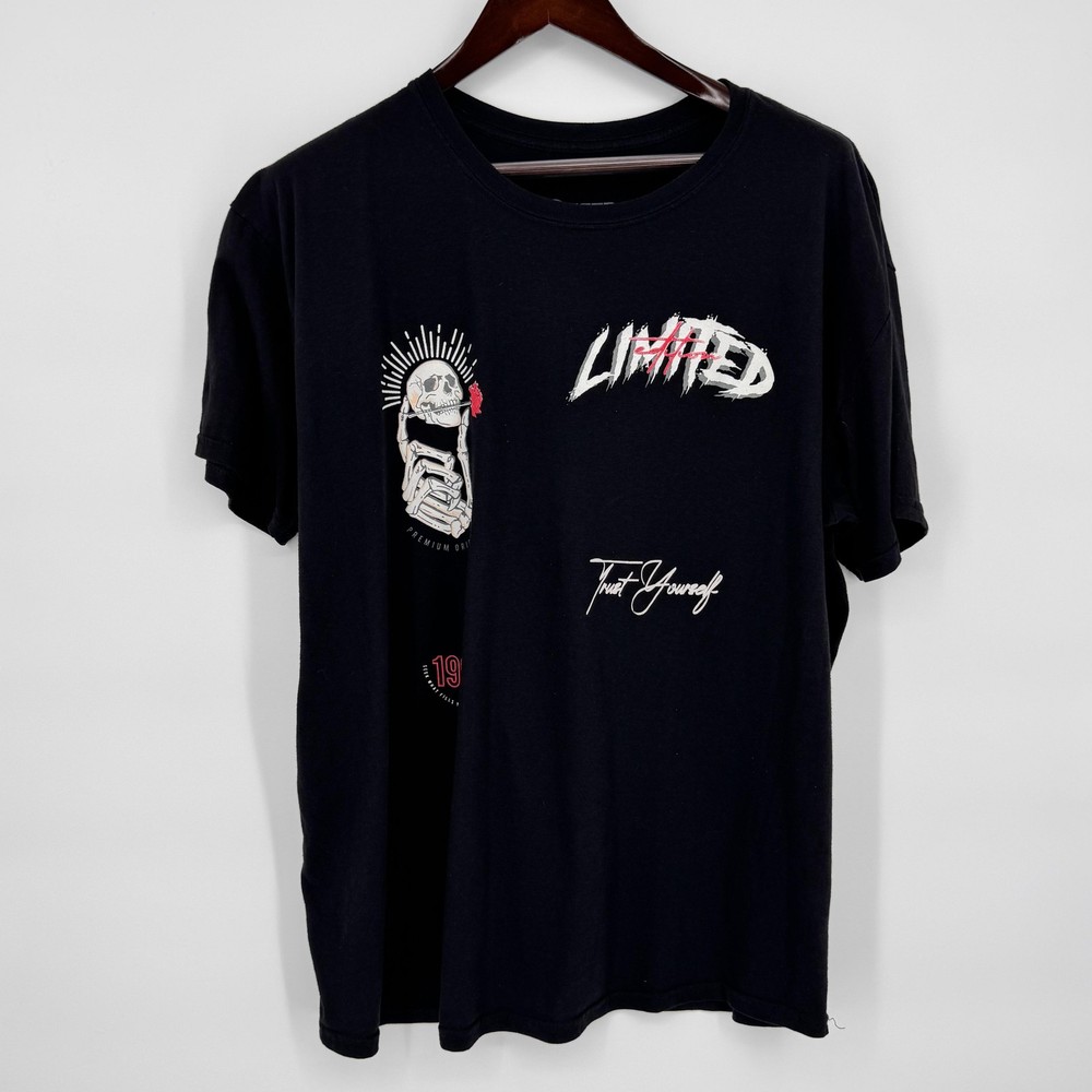 Brand: RGSTR Style: Mens short sleeve graphic shirt with skull and "Limited Edition" artwork on front and back. Color: Black Tag size: 2XL; regular fit crew neck with tagless printed neck label for comfort. Materials: 35% cotton, 65% polyester; made in Peru; RN 162282. Details: Front chest graphics include a skeleton hand holding a skull with a red rose and "Trust Yourself" script, with additional 1999 text accents. Large back graphic features the same skull and hand motif with radiating lines, bold "Limited Edition" lettering, roman numeral details, and repeated "Trust Yourself" slogan. Features: Soft midweight fabric suitable for all seasons, graphic print skull and limited edition theme, tagless design.