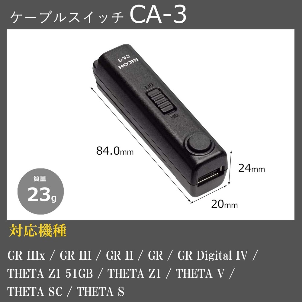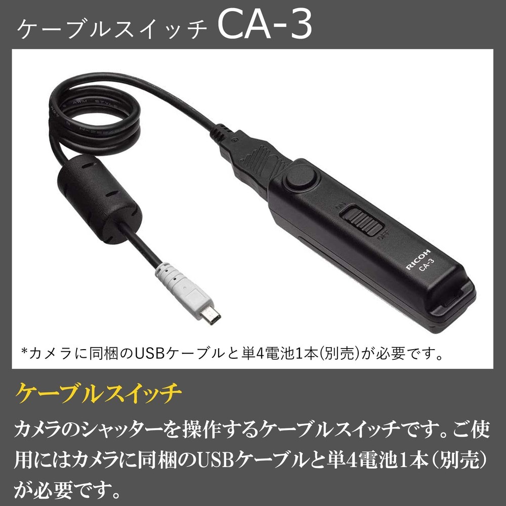 Description All my products are 100% Authentic. Please feel free to contact us if you have any question. [Cable switch] A cable switch that operates the camera shutter. [Compatible models] GR IIIx / GR III / GR II / GR / GR Digital IV / THETA Z1 51GB / THETA Z1 / THETA V / THETA SC / THETA S [How to use] To use this product, you will need the USB cable included with the camera and one AAA battery (sold separately). Payment We usually ship within 5〜10 business days of receiving cleared payment. Shipping We ship using FedEx and Japan Post. International Buyers - Please Note: Import duties, taxes and charges are not included in the item price or shipping charges.These charges are the buyer’s responsibility.Please check with your country’s customs office to determine what these additional costs will be prior to bidding/buying. These charges are normally collected by the delivering freight (shipping) company or when you pick the item up do not confuse them for additional shipping charges. I do not mark merchandise values below value or mark items as "gifts" - US and International government regulations prohibit such behavior.