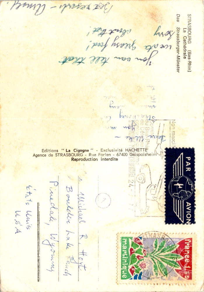 The postcard features a picture of La Cathédrale in Strasbourg, Bas-Rhin. The front of the postcard includes the name of the cathedral in French and German, along with a note mentioning greasy food. The back of the postcard includes the address of the sender, Michael R. Hoyt from Pinedale, Wyoming, in the United States.