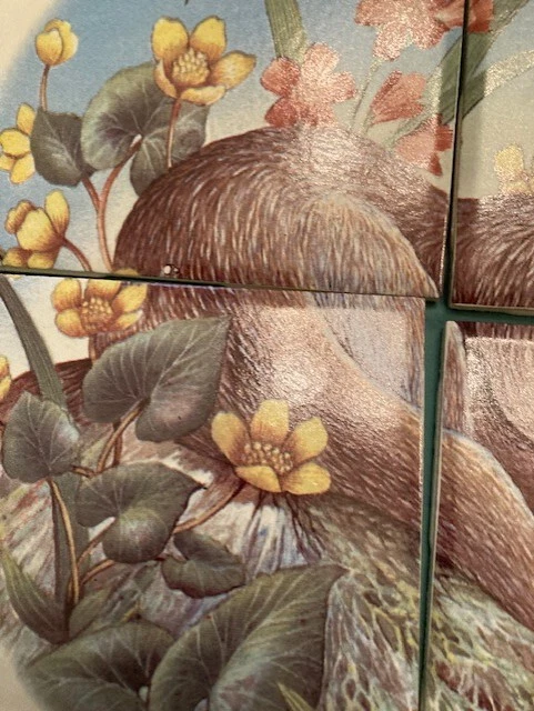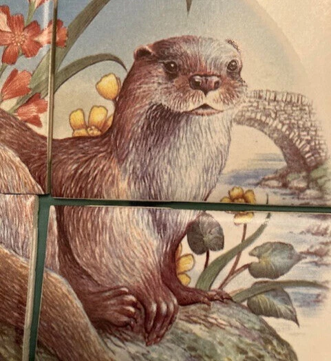 Add a touch of nature to your kitchen or bathroom with this charming 4 piece tile set featuring an adorable river otter. The lovely ceramic tiles are perfect for decorating your kitchen counter or wall, and are suitable for any nature or animal lover. The square tile shape measures 4.25" in length and width, and is installed using thinset mortar This tile set is a great addition to any home decor collection, and is perfect for those who enjoy art and beach-themed styles. The decorative tile set will add a charming touch of whimsy to your utility/laundry room, bathroom, or kitchen. I have a huge collection of all things Otter, contact me if you have interest in statuettes, framed vintage prints, jewelry featuring Otters and more.