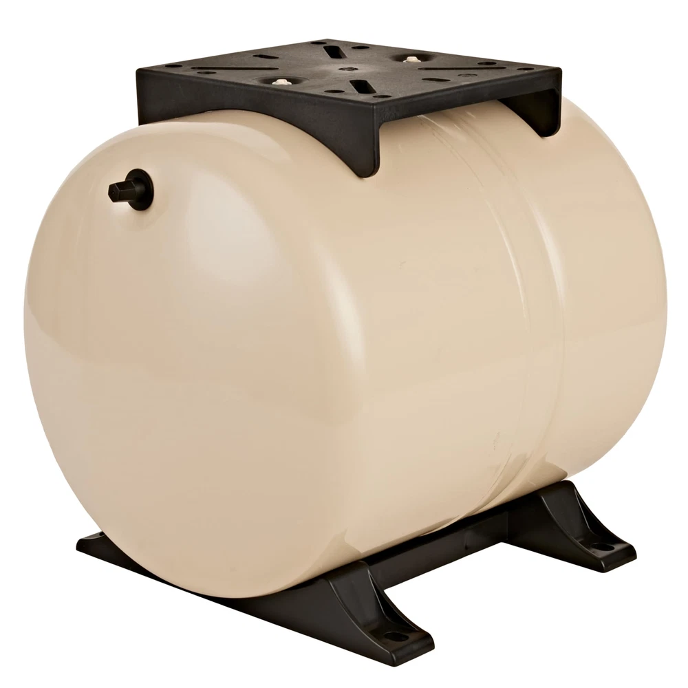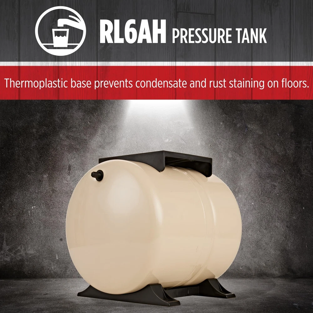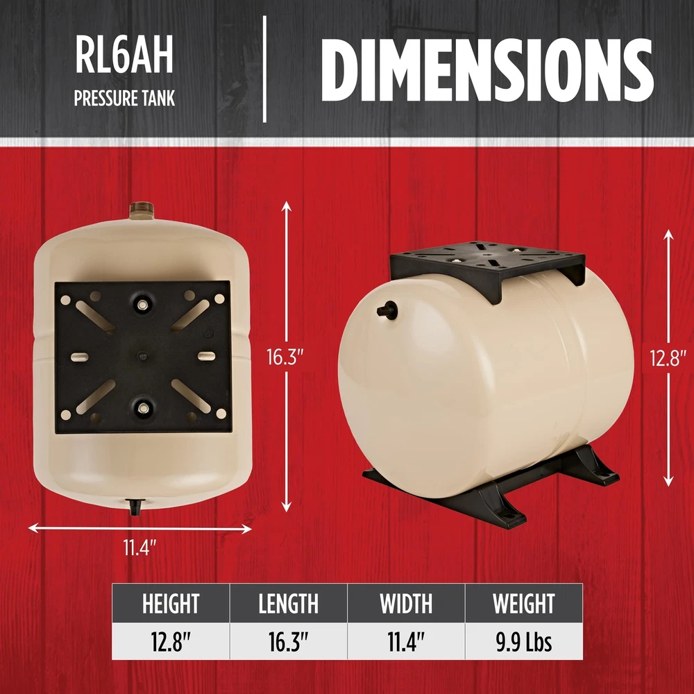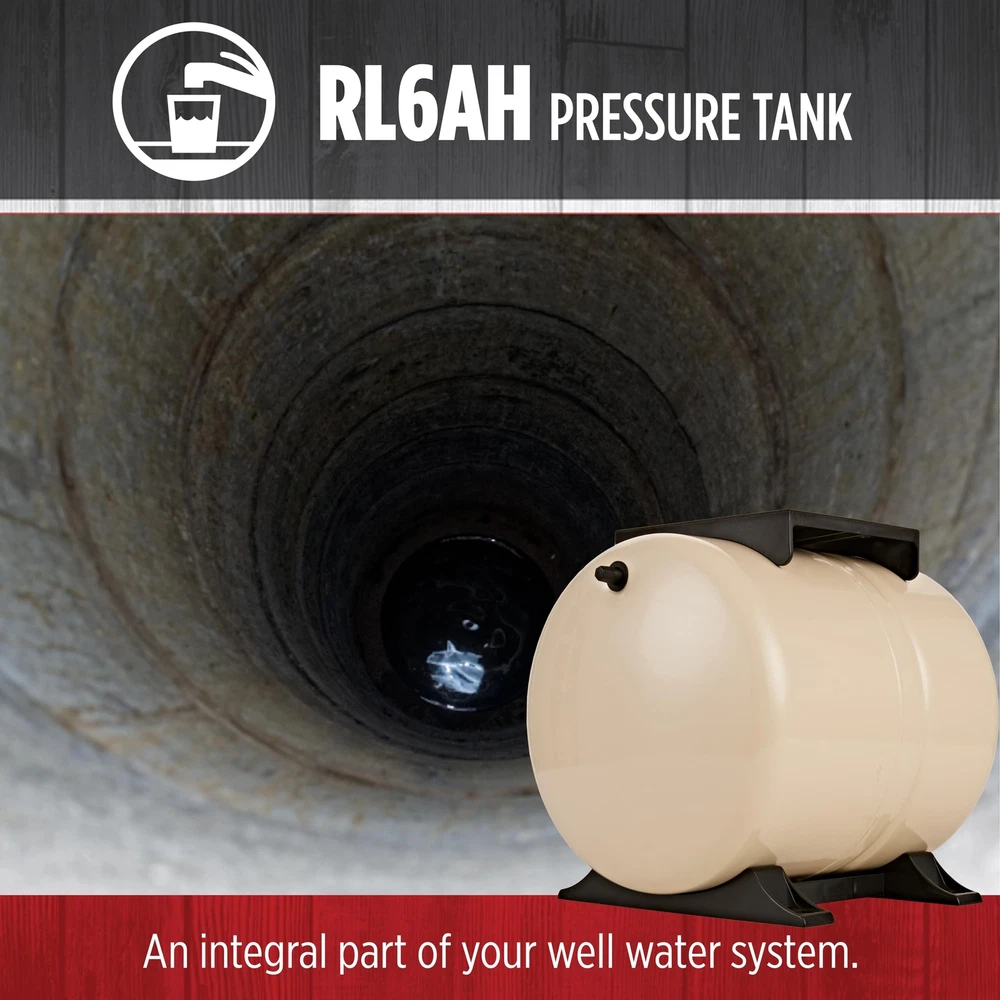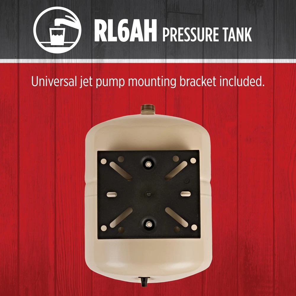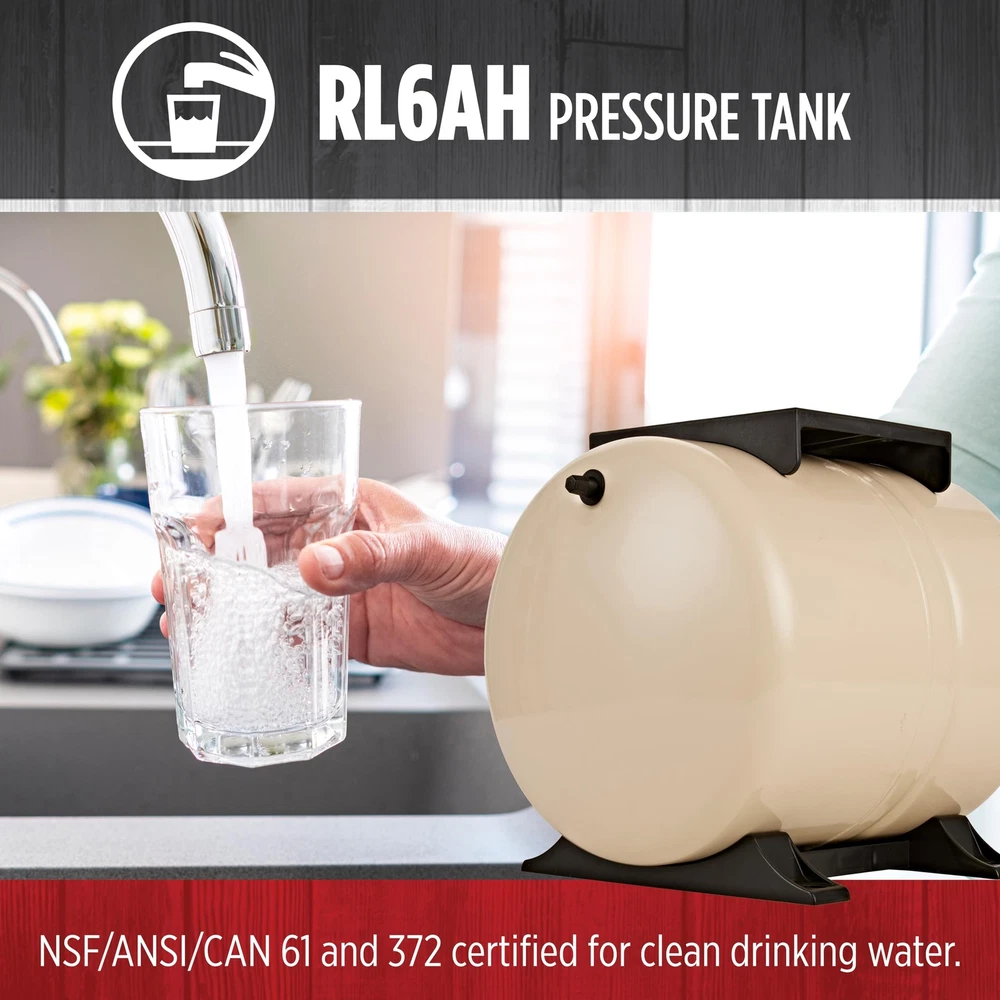 A pressure tank is an essential part of a pressurized water system that provides water pressure. The tank stores water between the diaphragm and the liner. The pressure tank reduces the number of times the pump needs to start significantly increasing the lifespan of your well pump. The tension of the diaphragm maintains the water pressure within the system ensuring proper operation of all water appliances such as a dishwasher and washing machine and provides a robust flow of water for showering. No maintenance is needed. A properly set-up pump and tank will work as a team to deliver water pressure to your home and provide many years of dependable service. The RL6AH tank is a 6-gallon horizontal tank with a drawdown of 1.9 gallons at 30/50 PSI. It is designed to handle 1 water fixture at a time. The RL6AH is equipped with a 3/4-inch MNPT threaded straight system connection. The RL6AH is made of heavy-duty 20-gauge cold rolled carbon steel with a 304 stainless steel connector. It has a triple grade almond paint finish. The liner material is FDA grade polypropylene. The unit is rated at a maximum working temperature of 194 degrees F and a maximum working pressure of 150 PSI. Initial set-up: The tank is pre-charged to 20 PSI in order to transport this pump safely and must be filled with air to 2 PSI below the cut-in setting of the pressure switch. For example, a 30/50 system needs 28 PSI of air in the tank. A 40/60 system needs 38 PSI. To fill the pump with air, use a standard bicycle pump and monitor the pressure using a pressure gauge (not included). This unit is equipped with a space saving thermoplastic universal pump mounting plate that allows a jet pump to be attached directly to the tank. This system is NSF/ANSI/CAN 61/CAN 372 tested and certified by WQA. APPLICATION: Designed to work with a well pump system to maintain water pressure when the pump is not running; certified for safe, clean, drinking water NSF/ANSI/CAN 61 and NSF/ANSI/CAN 372 approved BUILT TO LAST: Heavy-duty 20-gauge steel tank; 304 stainless steel water connection with patented leak safe technology; high performance variable geometry butyl rubber diaphragm; propylene liner SET-UP: Tank is pre-charged to 20 PSI for transportation; air pressure in the tank must be topped off with a bicycle pump to 2 PSI below the pressure switch cut-in setting PUMP MOUNTING BRACKET AND STAND INCLUDED: mounting bracket allows pump to be installed onto tank; stand lifts tank off of the floor preventing condensation from forming and staining of the floor SPECIFICATIONS: 6 gallon horizontal tank; 1.9 gallon drawdown @ 30/50 PSI; handles 2 water fixtures running simultaneously; 3/4" MNPT straight system connection, NSF/ANSI tested/certified by WQA