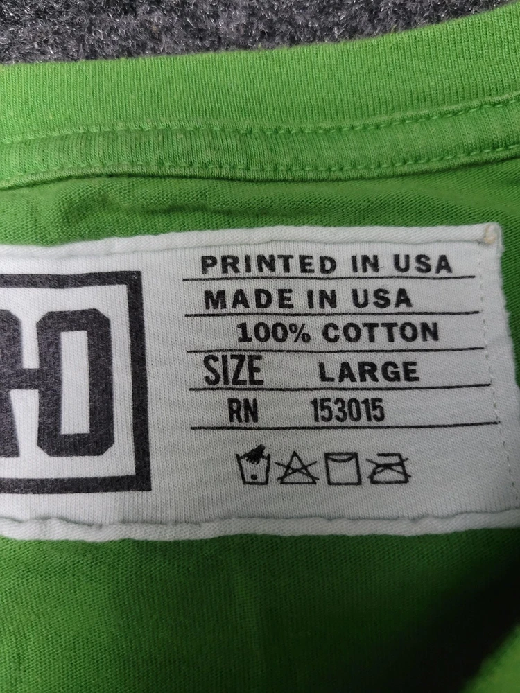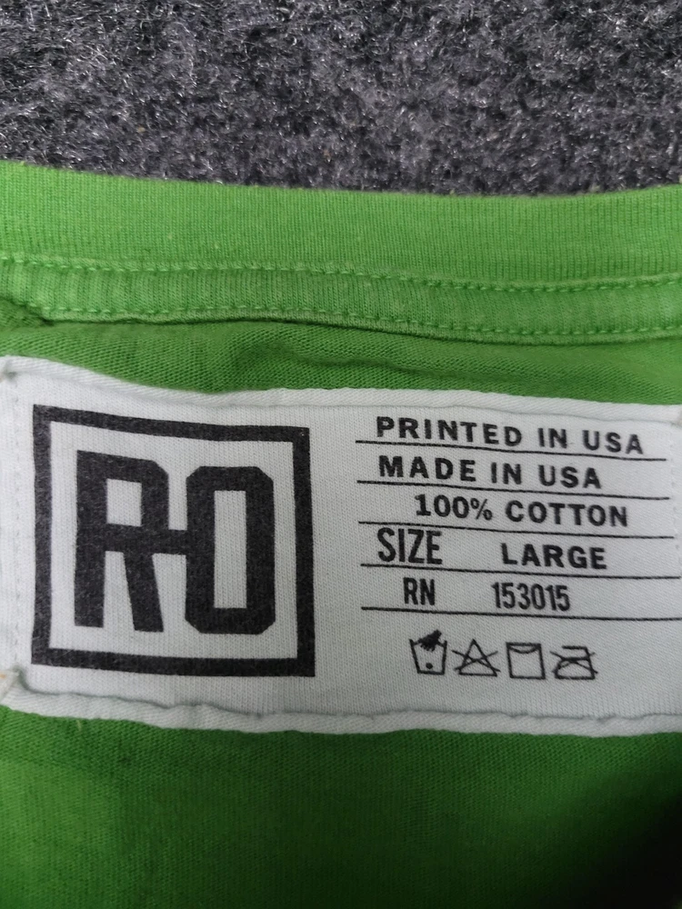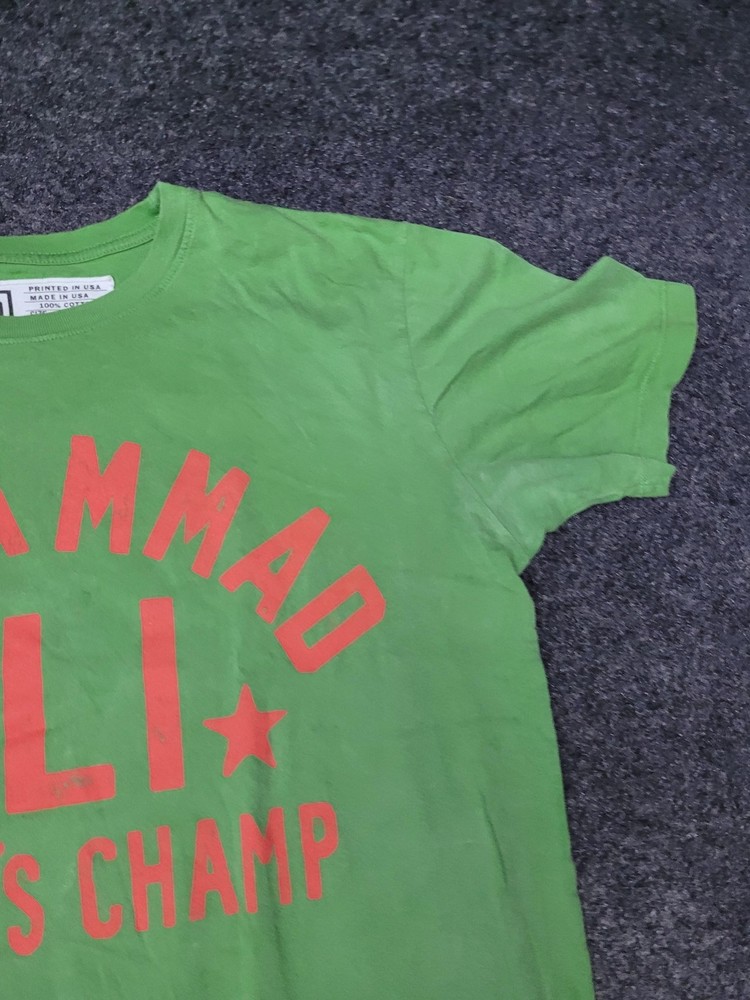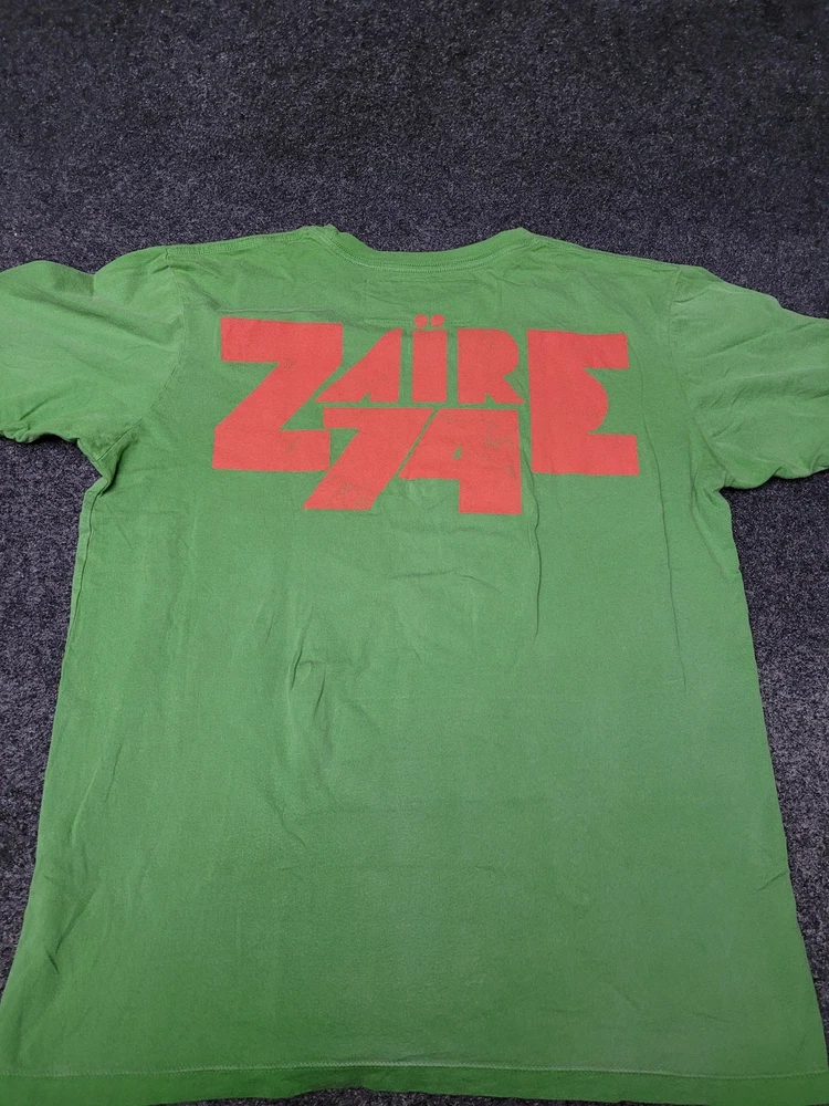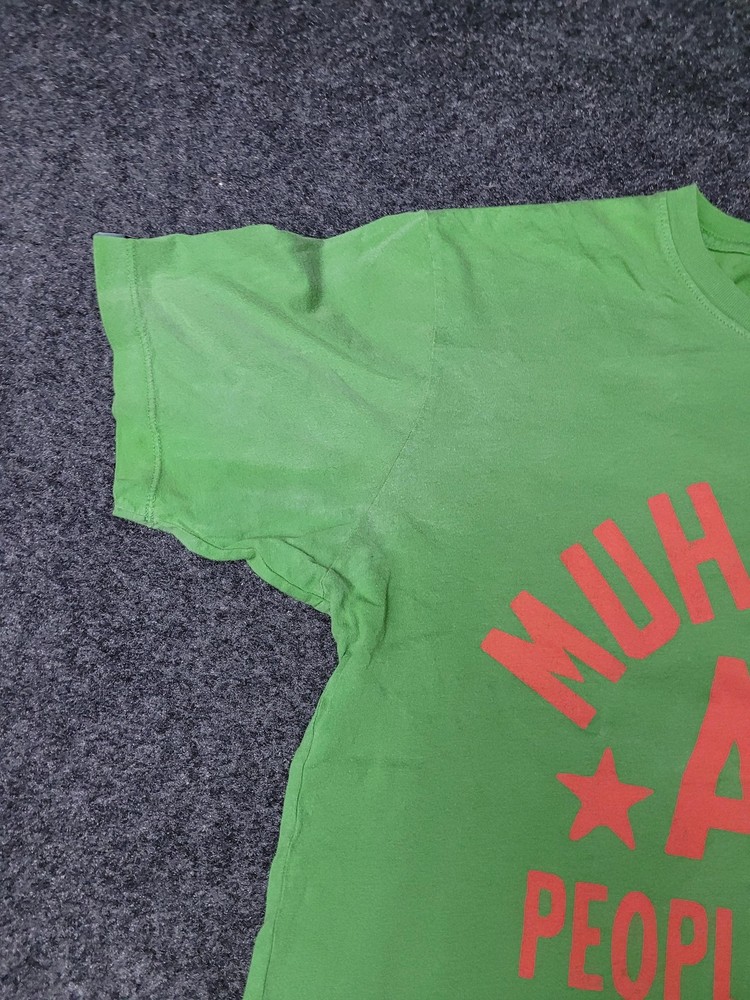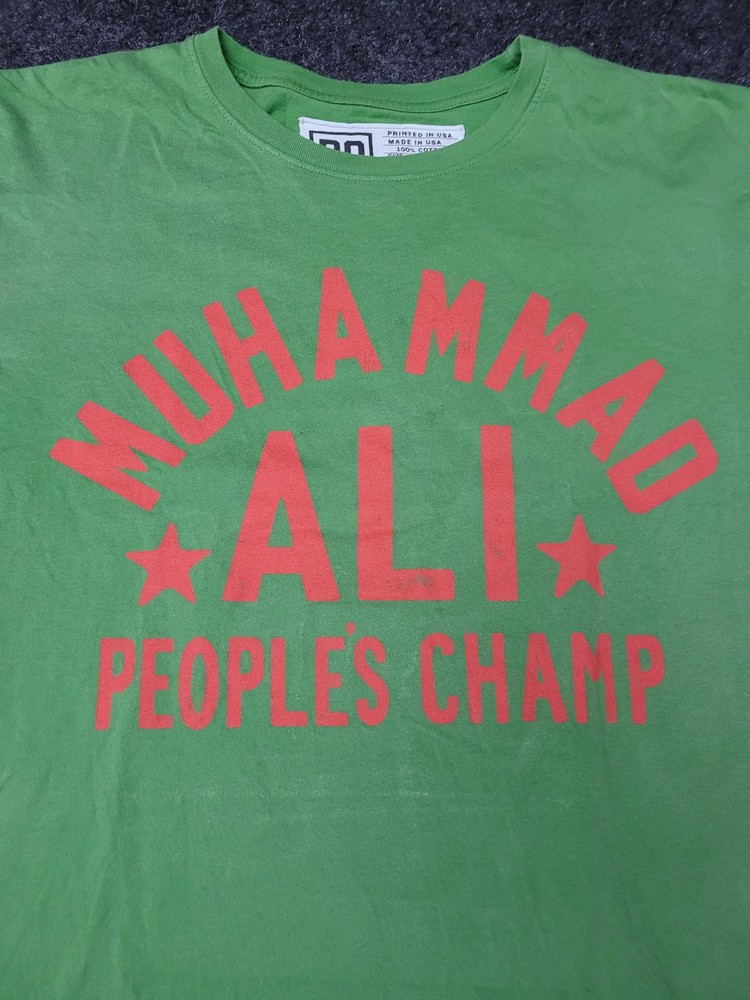 This listing is for a RO Muhammad Ali Shirt Mens L Green People's Champ Zaire 74 Boxing Tee T-Shirt Pre-owned RO Muhammad Ali tee with overall wash wear, creasing, and fabric softness. Underarm areas on both sides show noticeable fading and discoloration as photographed. Front and back graphics display minor print wear; fabric remains clean and intact with no holes or stains. Woven neck label and front hem logo patch are intact with some loose threads at the patch edge. Refer to pictures for condition. Message me if you have any questions.
