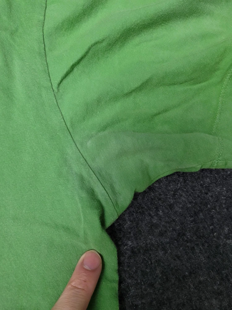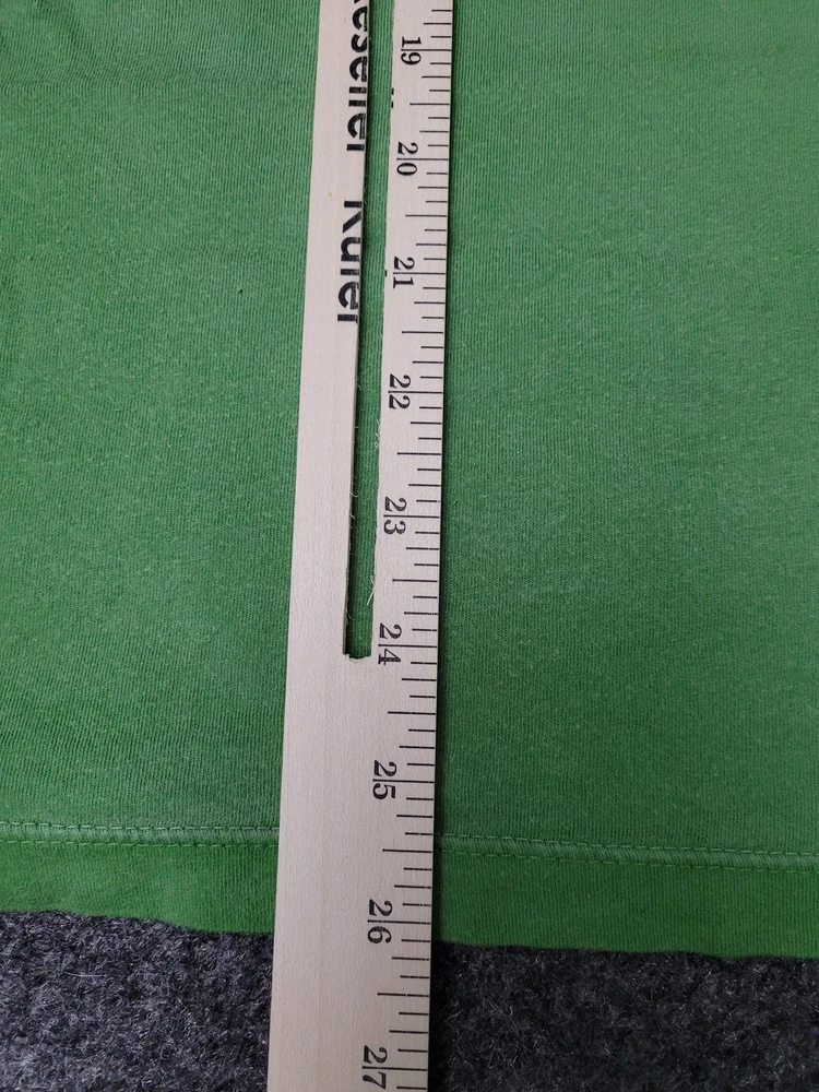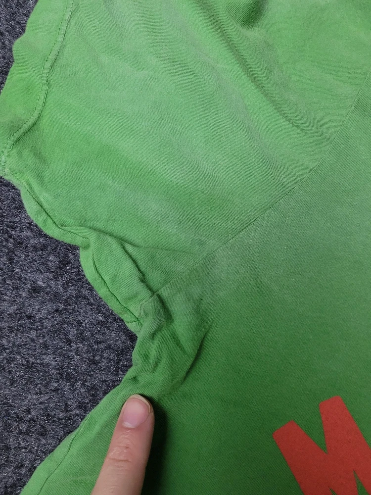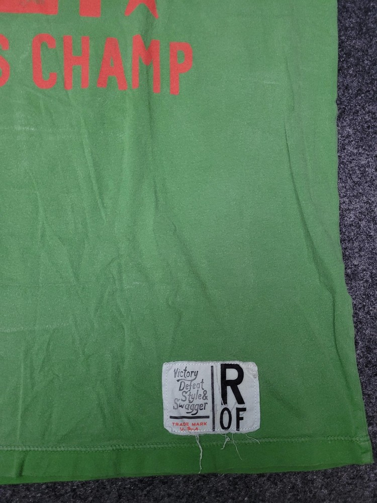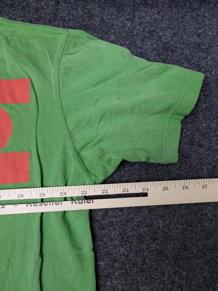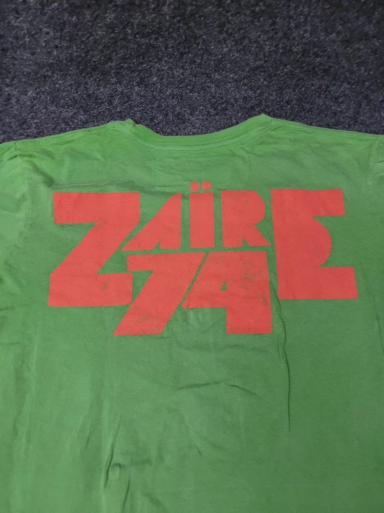 This listing is for a RO Muhammad Ali Shirt Mens L Green People's Champ Zaire 74 Boxing Tee T-Shirt Pre-owned RO Muhammad Ali tee with overall wash wear, creasing, and fabric softness. Underarm areas on both sides show noticeable fading and discoloration as photographed. Front and back graphics display minor print wear; fabric remains clean and intact with no holes or stains. Woven neck label and front hem logo patch are intact with some loose threads at the patch edge. Refer to pictures for condition. Message me if you have any questions.