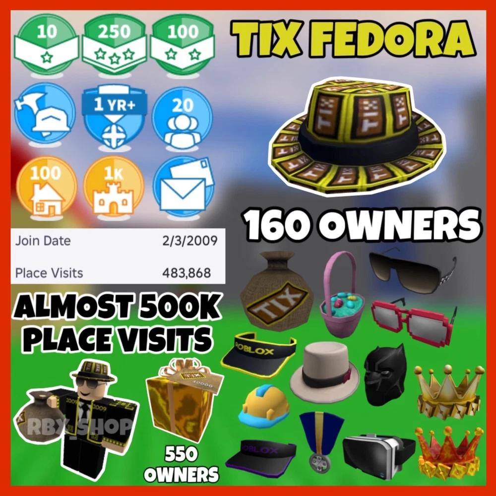 Video Game Series: Roblox Features: Hat, Roblox Tix, Tix Fedora, TIX, STACKED ROBLOX, Place Visits, ROBLOX PLACE, ROBLOX OFFSALES, Roblox Unverified, Offsales Roblox, Roblox Fedora Type: Hat