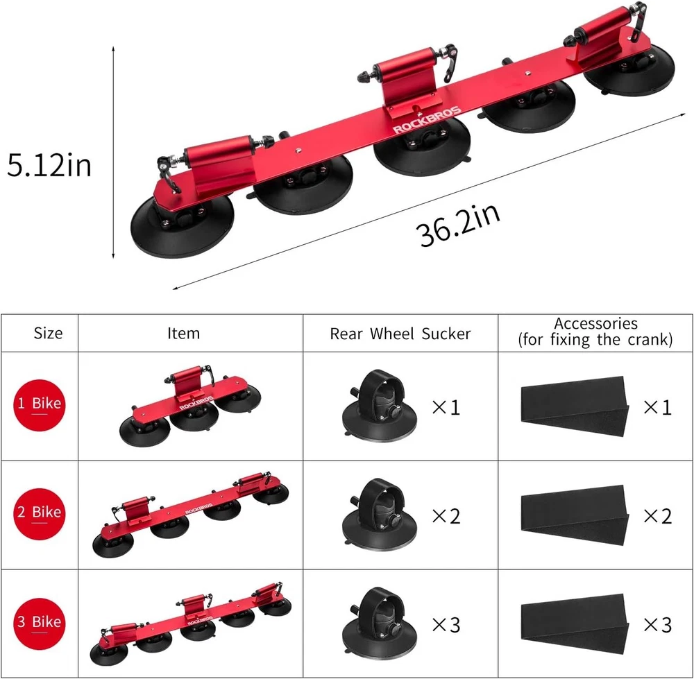 Product Details Brand: ROCKBROS Color: Black, Red Style: 1 bike, 2 bikes, 3 bikes Weight: About 2kg, 3.5kg, 4.6kg Name: Bicycle Car Rack Material: 47*13cm, 82*13cm, 93*13cm Sucker: Font 3 Back 1, Front 4 Back 2,Front 5 Back 3 Product Features Installation and disassembly Simply attach the suction cups to the roof and you can easily attach the bike to the roof. Small and portable Light as a brick, easy for girls to move, easy to borrow and share with friends No damage to paint or sheet metal Synthetic rubber suction cups, no damage to the paint, no damage to the roof sheet metal, say goodbye to traditiona car racks on the roof of the destruction of the transformation Good Compatibility Supports 99% of all car models on the market, sedans, sports cars, and SUVs bicycles quick release and barrel forks. All Raider mountain softtail, it all fits Low Air Resistance The small, slim profile controls wind resistance and reduces noise, so you drive in peace Installation steps: Clean up car and sucker Press cylinder rod until you can't see the white part Fixed the fork Confirm the rear wheel position Fixed rear wheel and pedal Tip: If it is installed on a car sunroof, please do not open the skylight. Speed less than 120 km/h Check every 4 hours If your bike need 15mm or 20mm hub to install it (such as your bike's fork thru-axle size is 15*100mm, or 15*110mm, 20*110mm), you can note the size on your order.(or a message we will help you) One order only send one pair for free.