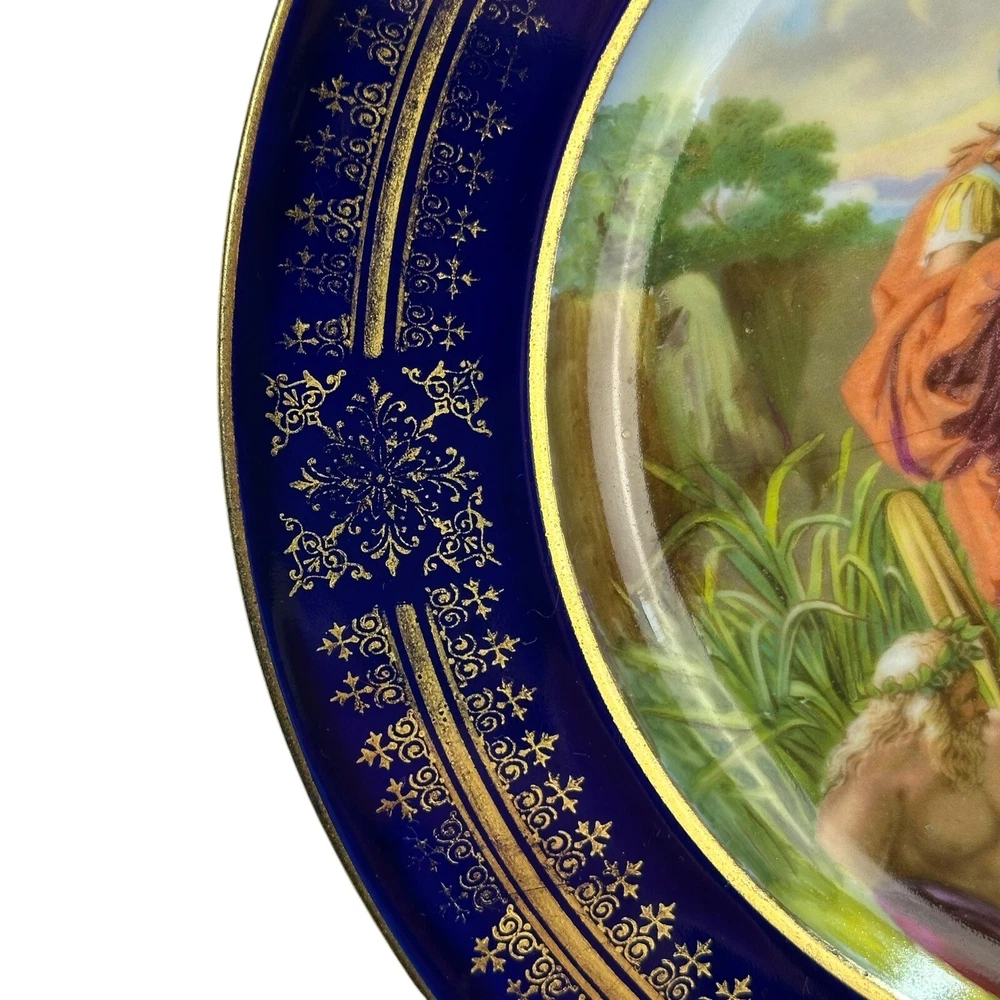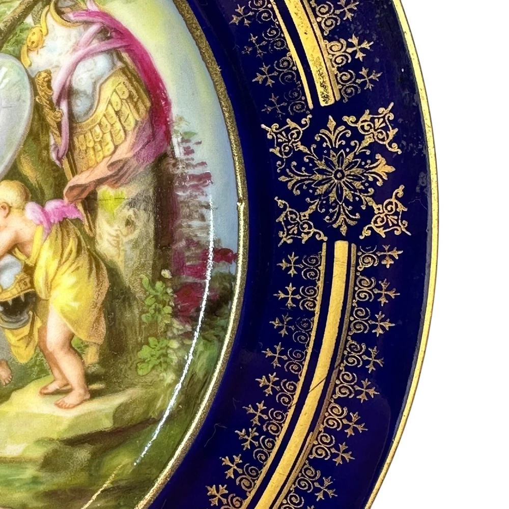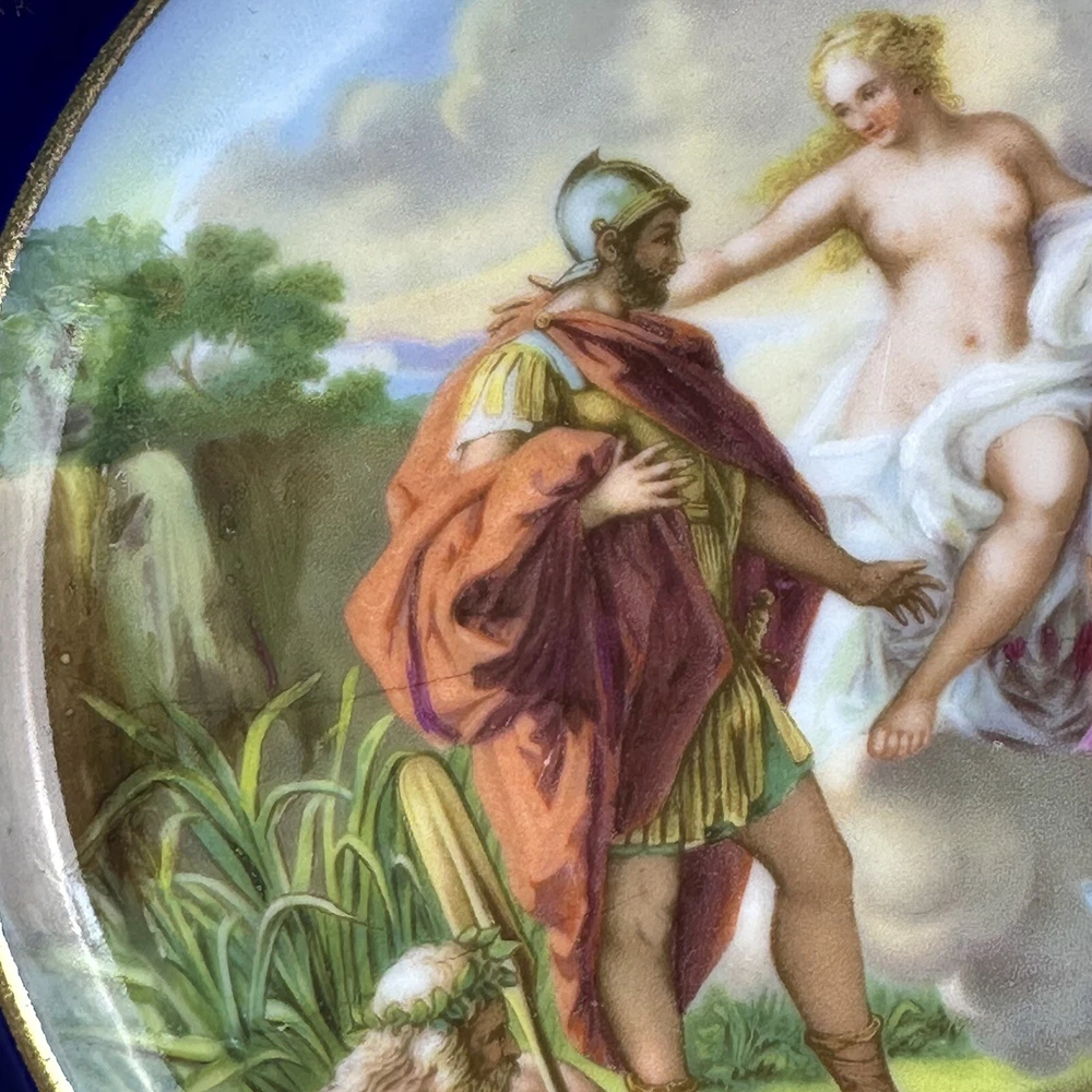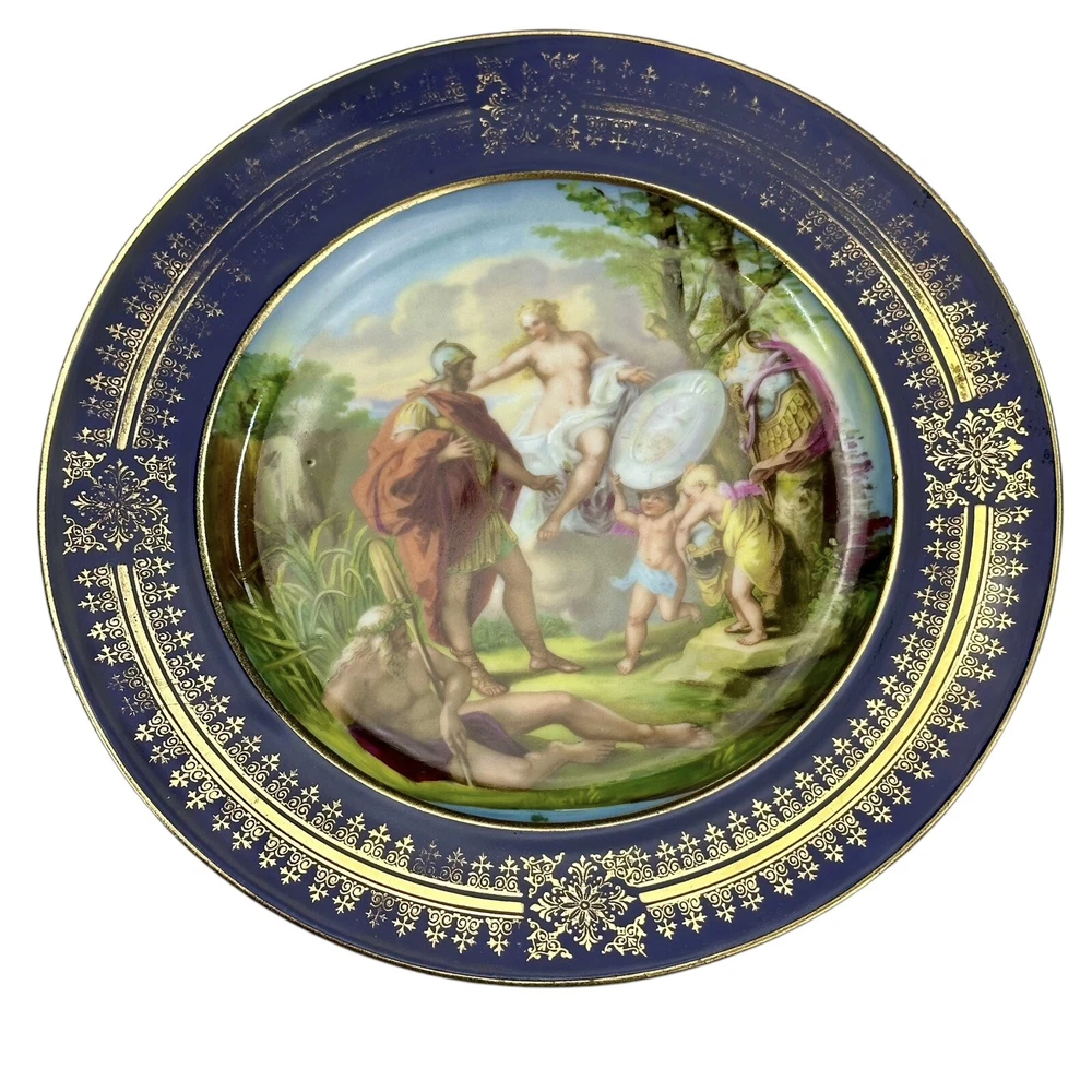 This is an antique Royal Vienna collector plate depicting "Venus & Achilles" on a round 8.5-inch porcelain plate. The design features multicolor detailing with blue and gold accents, showcasing a Victorian era theme of gods. We closely inspected for any flaws or issues. This piece is in excellent condition. No chips or cracks. There is some wearing off of the gold paint . Please look closely at our high resolution photos, and we encourage you to ask any questions you might have. It is our goal that all customers are extremely happy with their purchase :-) We package all items very carefully using bubble wrap and double boxing when necessary. You can trust in our 25 years of shipping delicate and fragile items. We purchase the vast majority of the items we sell from a local not-for-profit women’s shelter, where we also volunteer. These high-quality items are graciously donated by affluent residents to support the work of the shelter. You are also supporting the shelter by purchasing with us. Thank you for your patronage :-)