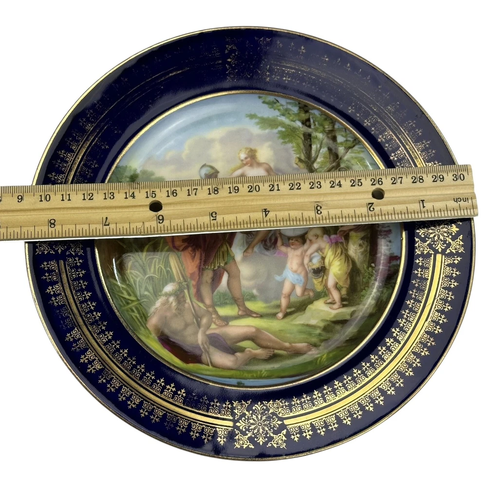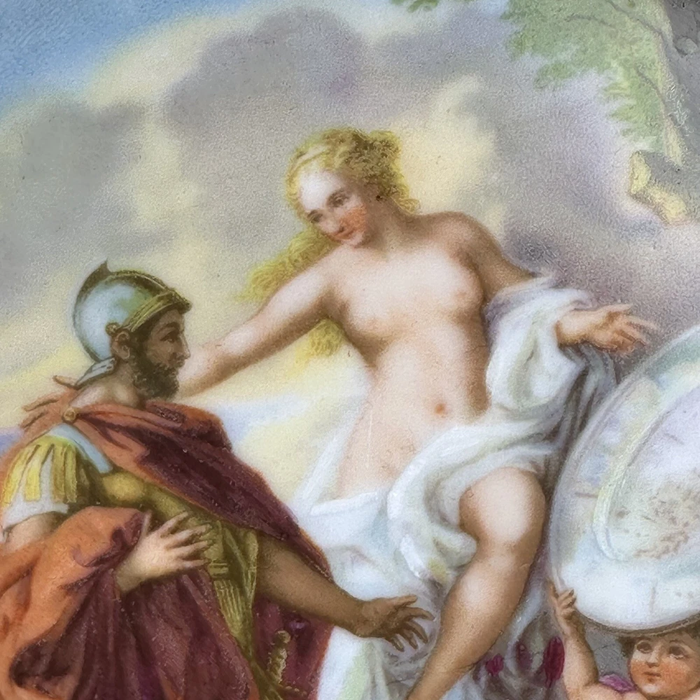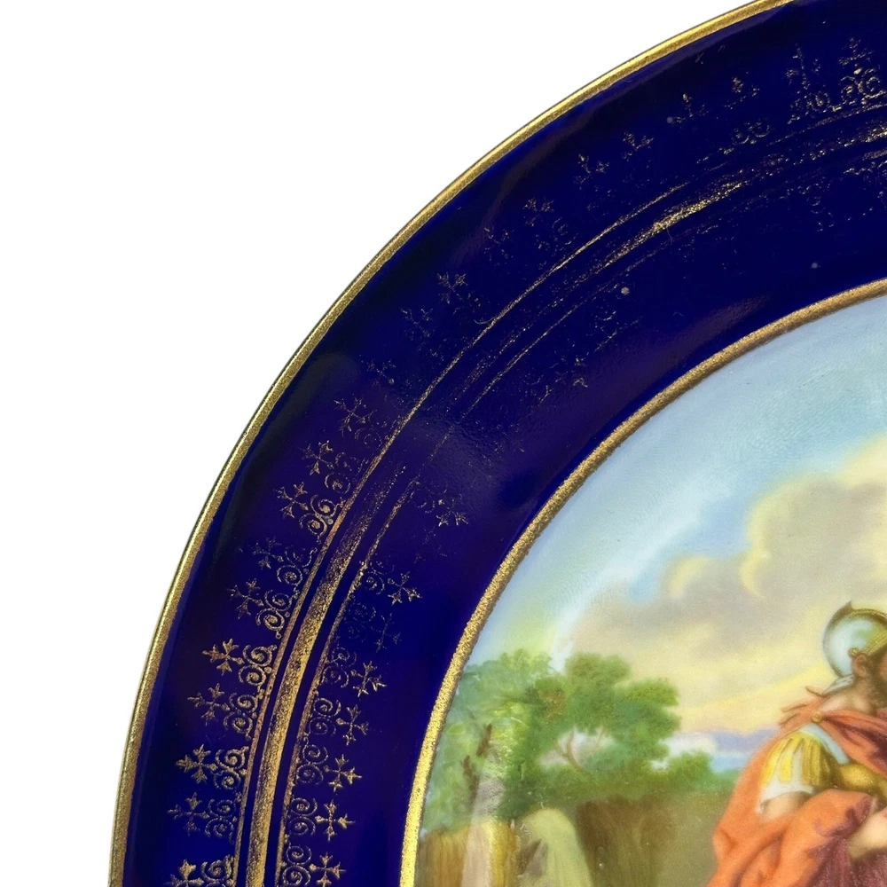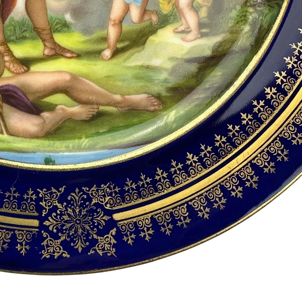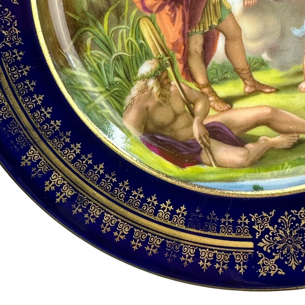 This is an antique Royal Vienna collector plate depicting "Venus & Achilles" on a round 8.5-inch porcelain plate. The design features multicolor detailing with blue and gold accents, showcasing a Victorian era theme of gods. We closely inspected for any flaws or issues. This piece is in excellent condition. No chips or cracks. There is some wearing off of the gold paint . Please look closely at our high resolution photos, and we encourage you to ask any questions you might have. It is our goal that all customers are extremely happy with their purchase :-) We package all items very carefully using bubble wrap and double boxing when necessary. You can trust in our 25 years of shipping delicate and fragile items. We purchase the vast majority of the items we sell from a local not-for-profit women’s shelter, where we also volunteer. These high-quality items are graciously donated by affluent residents to support the work of the shelter. You are also supporting the shelter by purchasing with us. Thank you for your patronage :-)