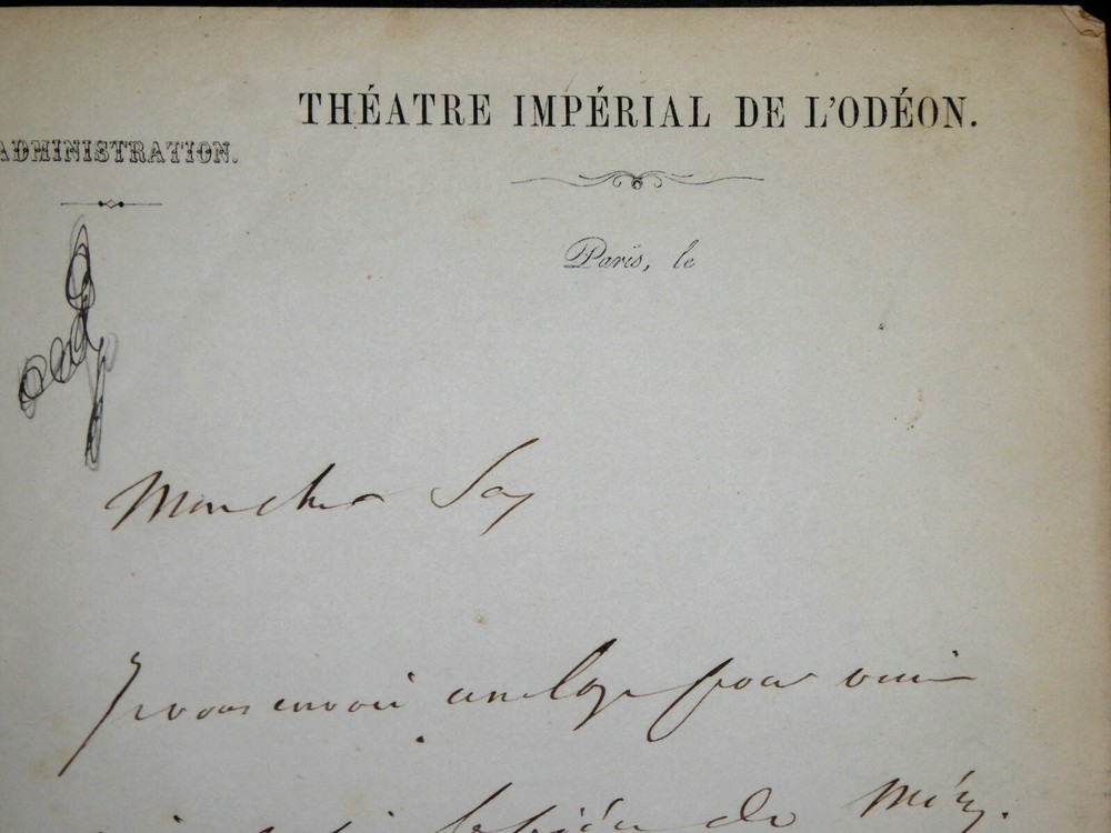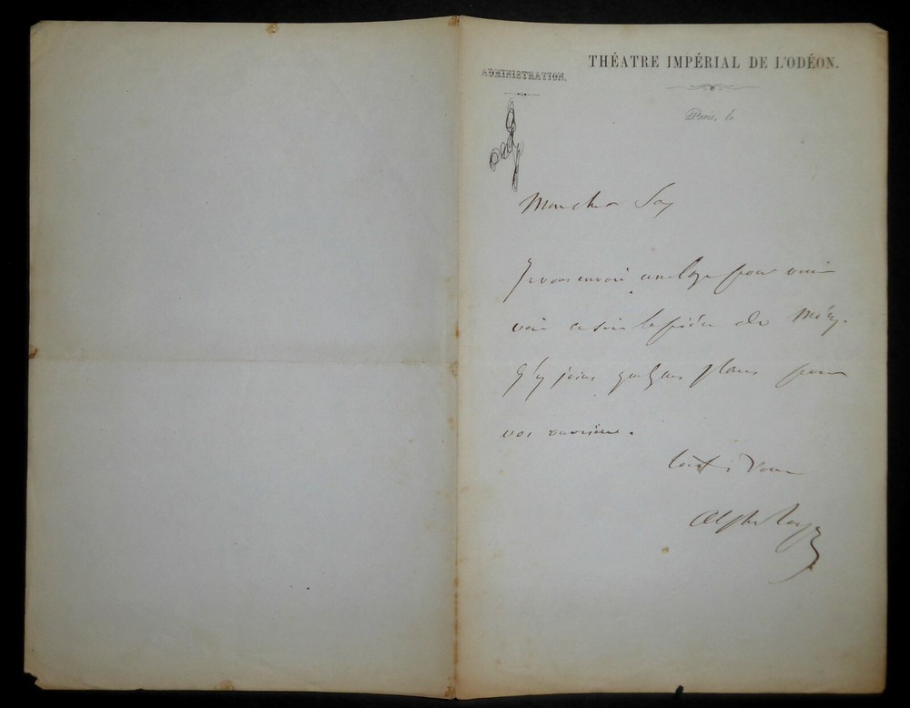 Alphonse ROYER. Lettre autographe signée, Paris. Lettre en une page sur papier à en-tête du Théâtre Impérial de l'Odéon, actuel Odéon - Théâtre de l'Europe, adressée à une connaissance afin de lui attribuer une loge pour venir voir une pièce de théâtre. Dimensions : 13.7 x 21 cm. 1 page. Etat : Bon état de conservation. Alphonse Royer, né le 10 septembre 1803 à Paris où il est mort le 11 avril 1875, est un librettiste, littérateur et journaliste français. Wikipédia Le Théâtre national de l'Odéon, dénommé depuis mars 1990 Odéon–Théâtre de l'Europe, est un théâtre public parisien situé place de l'Odéon, inauguré en 1782 pour accueillir la troupe du Théâtre-Français. L'Odéon est depuis septembre 1971 un des cinq théâtres nationaux. Son directeur actuel est Stéphane Braunschweig. Wikipédia Envoi soigné dans un emballage rigide et étanche. Satisfait ou remboursé. Si vous n'êtes pas entièrement satisfait, je reprends la marchandise avec retour à ma charge pour l'Europe et à la charge de l'acheteur pour le reste du monde. N’hésitez pas à visiter ma boutique et affiner vos recherches en fonction des catégories qui vous intéressent. Ma boutique L'Art Délivré. Lettres autographes, vieux papiers, livres anciens, photographies, gravures, timbres… Nous expertisons et/ou rachetons dans toute la France vos lettres, collections de lettres et livres anciens. Merci de votre visite. Jérôme KAYSER. Lettre en une page sur papier à en-tête du Théâtre Impérial de l'Odéon, actuel Odéon - Théâtre de l'Europe, adressée à une connaissance afin de lui attribuer une loge pour venir voir une pièce de théâtre. Alphonse Royer, né le 10 septembre 1803 à Paris où il est mort le 11 avril 1875, est un librettiste, littérateur et journaliste français. Wikipédia Le Théâtre national de l'Odéon, dénommé depuis mars 1990 Odéon–Théâtre de l'Europe, est un théâtre public parisien situé place de l'Odéon, inauguré en 1782 pour accueillir la troupe du Théâtre-Français. L'Odéon est depuis septembre 1971 un des cinq théâtres nationaux. Son directeur actuel est Stéphane Braunschweig. Wikipédia Satisfait ou remboursé. Si vous n'êtes pas entièrement satisfait, je reprends la marchandise avec retour à ma charge pou