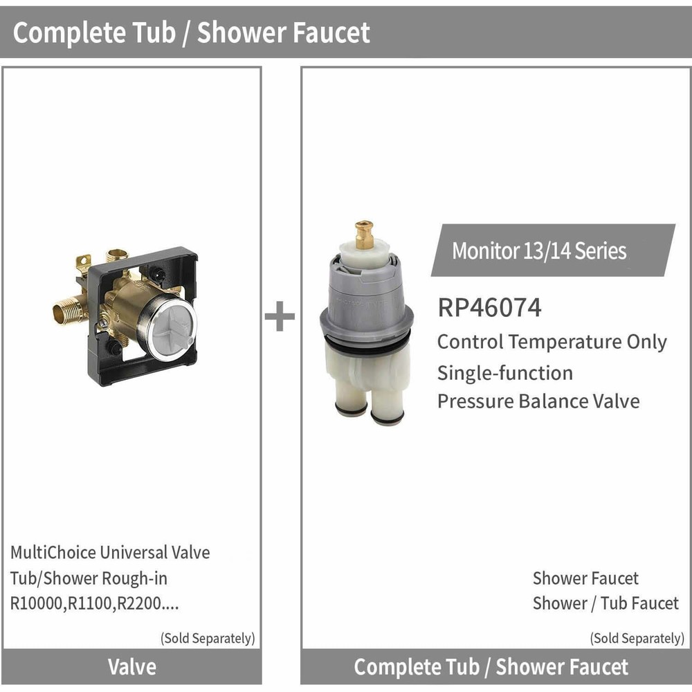 RP46074 Shower Valve Cartridge Repair Assembly - For Tub/Shower Valves 13/14 Series, Shower Valve Replacement--Single Function Temperature Control Valve Cartridge Repair Kit Product Description [Applicable products]-The RP46074 valve core assembly can be used with MultiChoice Universal valve body, suitable for single handle 13/14 series bathtub/shower. Please note: Only fit for 13/14 Series, rough-in R10000, R1100, R1800, R2200, etc.( NOT FIT 1300/1400 series ). Please confirm the product model before purchasing. [Product function] -RP46074 monitoring shower has a pressure balance design, which is safe to use. It can keep the water temperature within a safe range of ±3.6°F (±2°C), which helps protect you from sudden changes in the pressure of hot and cold water. [Product material]-The valve core is made of high-quality plastic, strong, durable, clean and effective. You can use it with confidence to save time, money and water. The product is also equipped with two spare black washers (not only spare washers, but also can be tied to the valve body) to achieve effective and durable effects. [Product convenience]-It does not require too many tools and experience, and it is easy to operate, install and repair the leaking faucet. Please note: Before installing the new spool, all contaminants in the area of the old spool must be removed. [Product Assurance] -100% quality assurance. If you are not satisfied with our products, please feel free to contact us(Through the order or Email),we will solve it for you as soon as possible and guarantee 100% percent replacement or a full refund. Let your satisfaction is our ultimate goal. 𝐂𝐨𝐦𝐩𝐚𝐭𝐢𝐛𝐢𝐥𝐢𝐭𝐲: RV RP46074 valve cartridge assembly can be used for (rough-in R10000, R1100, R1800, R2200, etc.) single handle function repair kit; Comaptible with all single handle 13/14 series bathtub shower faucets. ( Note: NOT FIT 1300/1400 series! ) Please confirm the product model before purchase. Safety: This RP46074 Monitor shower cartridge designed with pressure balance to keep water temperature within a safe ±3.6°F (±2°C), can help to protect you from sudden changes in hot or cold water pressure. Material: The RP46074 replacement cartridge is made of plastic structure, durable and can easily replace your entire shower faucet cartridge. Easy to Install: RP46074 shower valve cartridge is easy to install and repair the leaking faucet, no other tools needed. It can be replaced without going into the wall. Before installing the new cartridge, please clean all the contaminants around the previous ink cartridge area. Perfect service is our ultimate pursuit, your perfect experience makes us happy.Before purchasing, please confirm the size of the part model you need, thanks!