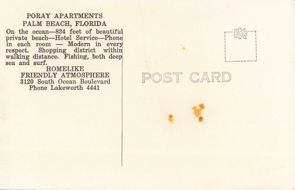 Antique or Vintage Photo Postcard item: RPPC, Real Photo postcard. See below, for a complete description. ...RPPC Palm Beach FL PORAY APARTMENTS Vacation Accomodations RPPC on the Oceanfront Palm Beach County, in SE Florida YOURS HOSTS Mr. & Mrs W. Poranski Owners Proprietors... Location or Photographer known and listed or unknown. All items are original, authentic RPPC's ... Original, not reproduction. Shipped very well package, USPS 1st Class postage, or Priority Mail with tracking! Quantity shipping discount refunds sent along with all shipment (dollar bills) where they apply! Please Note: We provide high-resolution scans and cropped views for your review. Don't hesitate to get in touch with us with any questions. We do not knowingly sell reproductions, so you can be assured these are historically significant, antique, or vintage items! Shipping Discount for multiple card "Winners"! O rder tracking...We post "Buyer Feedback" at the time of shipping! Check out our UpNorth Memories Store to see more great collectible items! Link: https://www.ebay.com/str/upnorthmemoriescollection UpNorth Memories Postcards, Historic Photographs and Paper Collectibles! Don Harrison...The UpNorth Memories Guy! Traverse City, Michigan. #upnorthmemories Mobile Format Modified: updated 8-13-2022 #upnorthmemoriescollection Powered by SixBit's eCommerce Solution