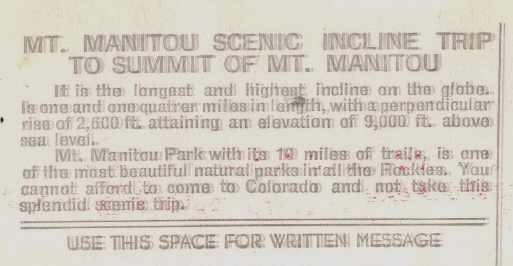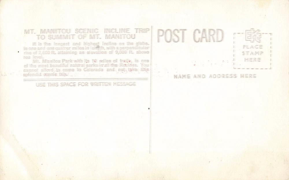 Antique or Vintage Photo Postcard item: RPPC, Real Photo postcard. See below, for a complete description. ...RR Manitou Springs, CO RPPC 1944 ROADSIDE Mount Manitou Incline RR funicular, cable tram built to aid the 1907 construction of a nearby hydroelectric dam wooden boxcars were used to haul materials and pipe... Location or Photographer known and listed or unknown. All items are original, authentic RPPC's ... Original, not reproduction. Shipped very well package, USPS 1st Class postage, or Priority Mail with tracking! Quantity shipping discount refunds sent along with all shipment (dollar bills) where they apply! Please Note: We provide high-resolution scans and cropped views for your review. Don't hesitate to get in touch with us with any questions. We do not knowingly sell reproductions, so you can be assured these are historically significant, antique, or vintage items! Shipping Discount for multiple card "Winners"! O rder tracking...We post "Buyer Feedback" at the time of shipping! Check out our UpNorth Memories Store to see more great collectible items! Link: https://www.ebay.com/str/upnorthmemoriescollection UpNorth Memories Postcards, Historic Photographs and Paper Collectibles! Don Harrison...The UpNorth Memories Guy! Traverse City, Michigan. #upnorthmemories Mobile Format Modified: updated 8-13-2022 #upnorthmemoriescollection Powered by SixBit's eCommerce Solution