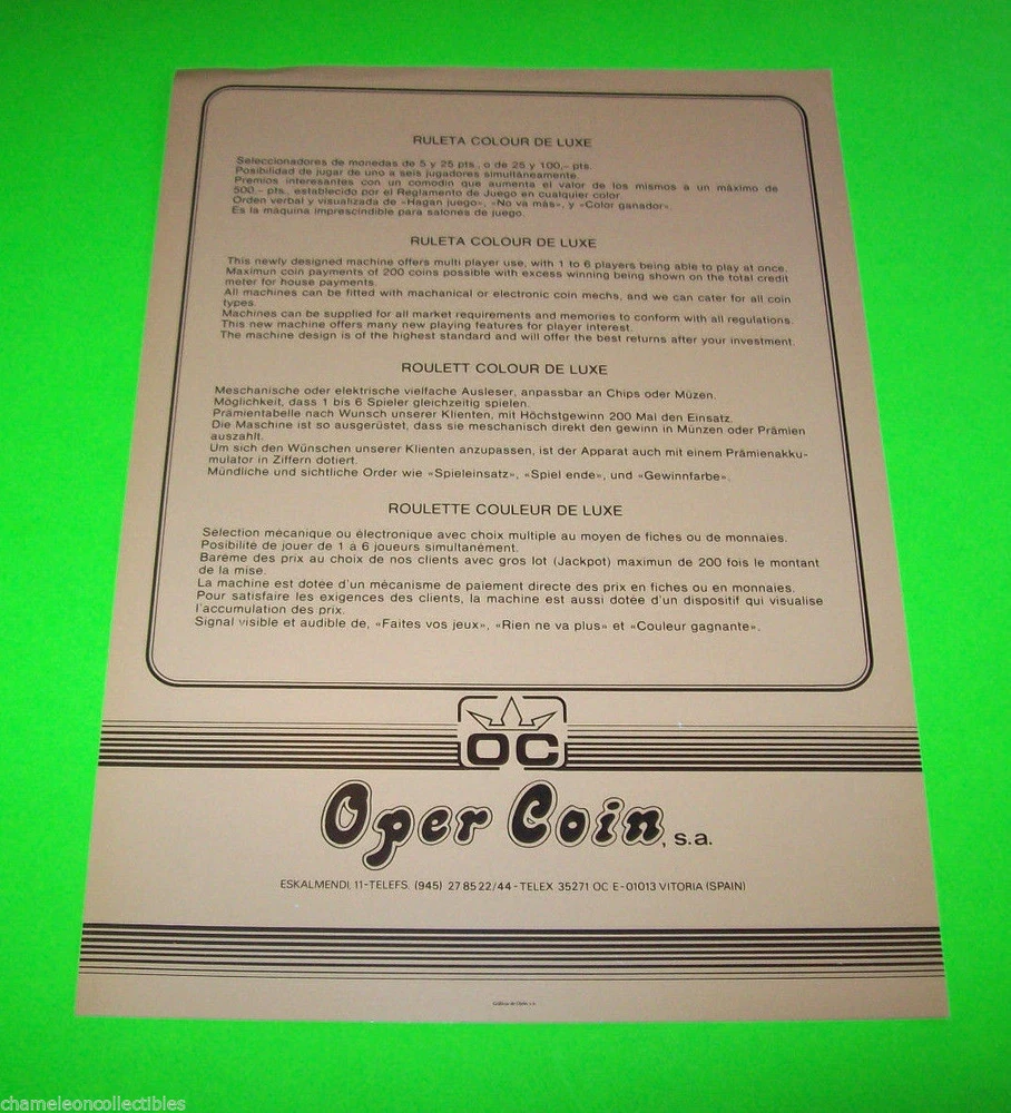 Original promotional sales flyer for the above mentioned coin operated gambling type machine. Flyers are advertising literature also called a circular, brochure, or flier. All are single sheets unless noted otherwise. Size is 8.25" X 11.5". Double click photos to enlarge and see detailed view. Free sheet protector included with all flyers. All flyers are shipped flat with cardboard. Visit my Ebay store to see all my listings: http://stores.ebay.com/Chameleon-Collectibles-Store Paypal accepted. Payment is due within 5 days of auction close. Buyer pays shipping and handling for the first item. Additional items will be free or discounted if combined and paid at once. USA estimated delivery 2-5 business days. International estimated delivery: First Class Mail International = 14-30 business days. Priority Mail International = 10-14 business days. (please note these are estimates) Selling on Ebay since 1997. Check my feedback. International Buyers – Please Note: Usually there are no import duties on goods but please check with your postmaster to determine if you are expected to pay any additional fees. Import duties, taxes, and charges are the buyer's responsibility if applicable. Any fees required are not from Chameleon Collectibles they are from your countries customs department. Total value will be shown on customs forms less the postage paid. Items can not be marked as gift on customs forms. The estimated arrival date is 14-30 business days from the time item is shipped. Please note your item may arrive sooner or later depending on the postal service. Delays are beyond my control once item is posted. In the unlikely event you do not receive your item there is a 60 day wait period until claims can be processed. In the unlikely event your item is damaged please contact me as soon as item is received so insurance claim can be started. By purchasing this item or any item from my Ebay store you agree to these terms and to cooperate with signing insurance claim forms and returning to me. First Class Mail International parcels offer tracking to only select countries. Please contact me for current rates if you require Priority Mail Shipping service. Save by using the cart to bundle orders.