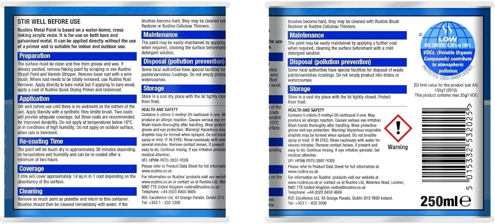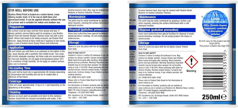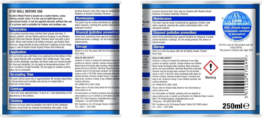 Powered by Frooition Helpful Links Add to Favourite Sellers Sign up to Newsletter View Feedback Contact Seller Visit seller's eBay Shop About Seller Page clearance DIY Tools Home Appliances Outdoor & Garden Kitchen & Homeware Toys & Games Sporting Goods Health & Beauty Baby & Toddler Electronics Musical Instruments Rustins Metal Paint Rustins Metal Paint Fast Delivery Secure Payments Ask a Question Follow SuperGift More Items! View more great items 2 X 400ML STOVE PAINT HEAT RESISTANT BLACK MATT SPRAY PAINT HIGH TEMPERATURE £12.99 SPRAY PAINTS ALL PURPOSE AEROSOL MATT GLOSS SATIN PRIMER GLITTER NEON METALLIC £5.75-£10.95 300ML WHITE RADIATOR PAINT GLOSS FINISH PAINT TIN QUICK DRYING FOR METAL PAINT £6.99 2 X 300ML BRILLIANT WHITE RADIATOR SPRAY PAINT HEAT RESISTANT QUICK DRY AEROSOL £10.95 Item Descriptio RUSTINS METAL PAINT Rustins Quick Dry Metal Paint is a high-performance, water-based paint formulated for direct application to bare or previously painted metal. It offers a smooth satin finish and excellent rust protection, making it perfect for both interior and exterior use. No primer is needed on most surfaces, and the quick-drying formula makes it ideal for jobs where time is of the essence. Whether you're painting radiators, railings, metal doors, gates, or garden furniture, Rustins Metal Paint provides a durable, weather-resistant finish in a range of attractive colours. Features: ✅ Smooth satin finish – sleek and modern look ✅ Quick drying – touch dry in under 30 minutes ✅ Water-based – low odour and easy to clean ✅ Rust-resistant – helps protect and extend metal life ✅ Suitable for bare and painted metal surfaces ✅ Interior & exterior use ✅ No undercoat or primer usually required ✅ Weather and moisture resistant Item Specification Brand Rustins Colour Multicoloured Material Paint Type Metal Paint Weight 250ml / 500ml EAN 5015332533299 MPN RUS-WHT-500-1 About Us About Us Delivery Returns Terms Contact About Us Discover SuperGift utilising the latest technologies to make your shopping experience even better. Our pages are fully responsive and offer a unique online shopping experience such as frequently bought items and recommended gifts. We want to be the first to know all about your needs, and that's why we have SuperGift online Browse our store and search your next needed product. Delivery Delivery Please be advised that bulk order may require palletising. In the event this occurs, the courier will contact you to discuss how to move forward. If you have any issues, you can also contact us. Please be aware while we guarantee that we will dispatch your order however we cannot be held responsible for any delays with the courier. All orders are dispatched with Royal Mail or DPD local. Dispatch time - Same day if ordered before 2pm (working days only) Important information: We are only able to dispatch your order to the address registered on your PayPal account at the time of payment. Please ensure any address changes are updated prior to ordering. If you live in any of the following regions, your delivery may have a higher cost: Scottish Highlands, Orkney, Shetland and Western Scottish Islands and Northern Ireland. We are not able to ship to: BFPO Channel Islands Republic of Ireland (Eire) Isle of Man Please be aware that in certain circumstances our couriers are unable to deliver to some postcode areas. In this instance we will cancel and refund your order. ? All delivery times are subject to change, especially during peak periods. Returns Returns SuperGift Cancellation Returns and Refunds Policy At SuperGift we strive to ensure that our customers enjoy an outstanding online shopping experience. Occasionally our customers may need assistance and our Customer Services Team will do their best to support and assist in any way necessary. Returning an item to SuperGift I have changed my mind and would like to return my purchase To return an item(s) please notify Customer Services at SuperGift by email via My eBay. Please state the order number and a reason why you may wish to return the product to us. Please allow up to 48 hours for a response. The returned goods do not need to be in their SuperGift packaging however they need to be in their original, sellable condition. Please include a note within the returned package with a reason for return (even if you have just changed your mind) as well as your name and address. Buyers have 30 days to return a product to SuperGift for a refund or an exchange. Return postage is at the buyers own cost and risk. Our returns policy does not affect your statutory rights. Faulty or Damaged Items My item has arrived damaged or faulty If your purchase arrives damaged or faulty, please contact SuperGift within 7 days of receiving the item. Customer Services at SuperGift will be happy to support customers in resolving such issues. You may be asked to provide photographic images of the damage or product fault for Customer Services to investigate and resolve. By providing these, Customer Services can suggest the most appropriate resolutions. If asked to return a damaged or faulty item, SuperGift are responsible for the cost of postage. Customers have 30 days from purchase to return a faulty or damaged item to SuperGift for an exchange (stock permitting) or refund. If you return goods claiming they are defective, we will examine the returned goods and will notify you of your refund via e-mail. We will process the refund as soon as possible. If a refund or reimbursement is payable to you, we will transfer the money using the same method originally used by you to pay for your purchase. Please note, if SuperGift organise for a courier to collect a faulty / damaged item from your home and they are unable to access the item, a fee of £15.00 will be deducted from the total refund given. My item has developed a fault within 30 days of delivery. Within 30 days of the receipt of goods (or for perishable goods within their use by date) yo