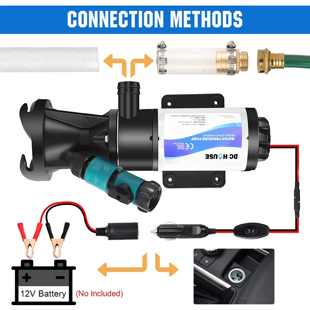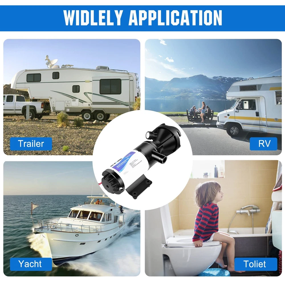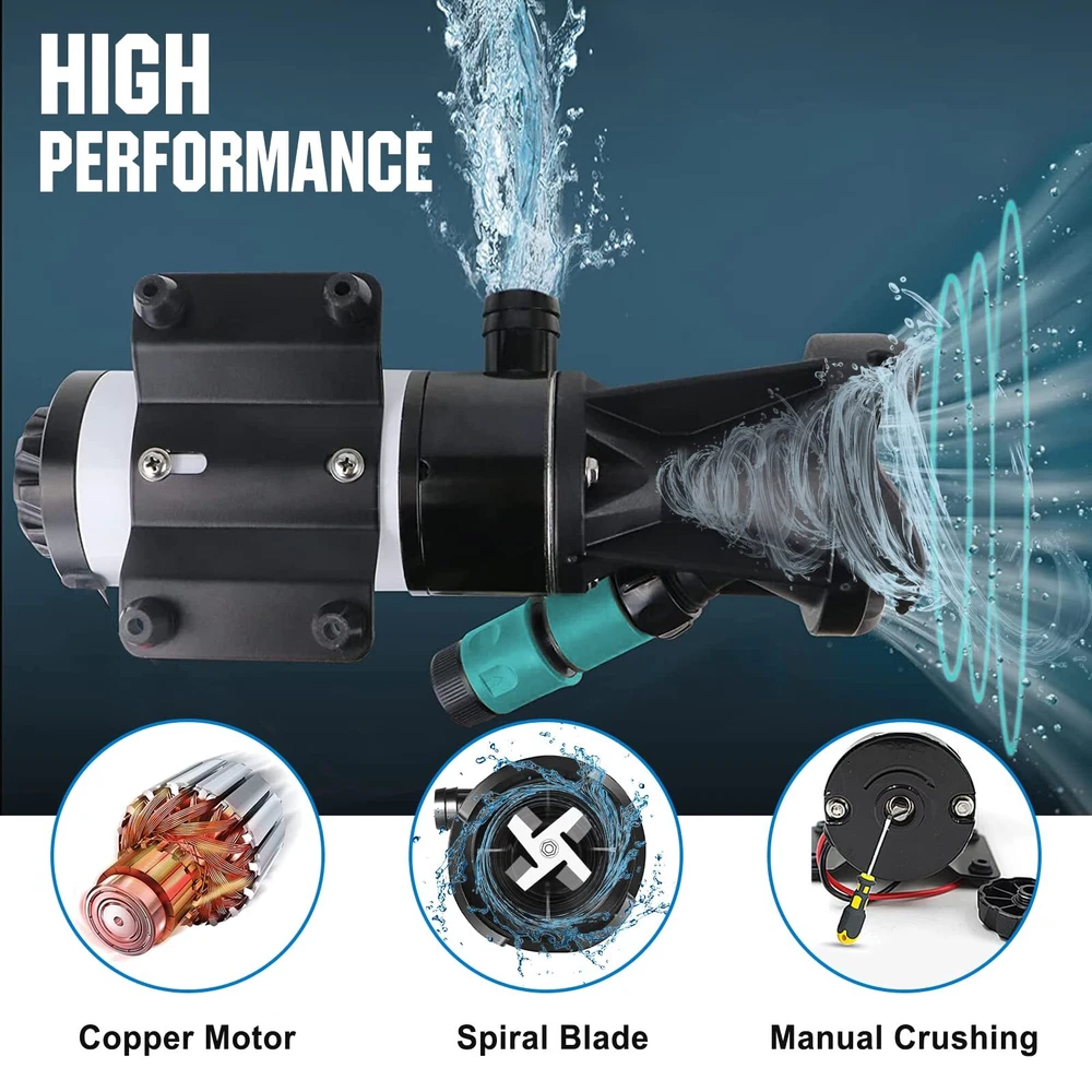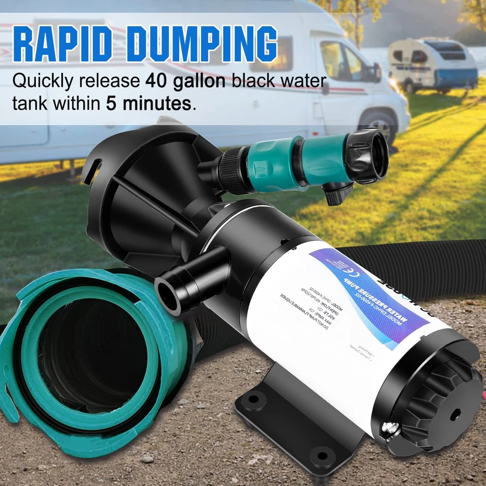 High Flow: The RV dump pump empties 40 gallons wastewater of sewage tanks within 5 minutes, and supports long-distance(32 FT) dumping wastewater. The flow is up to 12 GPM, lifting up to 10 FT, which save you more time Wide Application: Macerator pump can connects to the standard 3 "RV black water tank outlet. It can also be used with the sewer hose kit to clean up and transport sewage for your life Crushing & Cleaning: The sewage pump design fresh water flushing function and manual crushing function. Builted-in a double 4-blade cutter to crush the dirt into small particles with less than 1/8 inch(3.17 mm), and quickly discharge through the 25mm outlet. The garden hose connector designed with rotary switch can control the water flow to clean the residue in the pump Easy to Use: Comes with 2 power cables,16.4 ft (5 M) cigarette lighter power cord and alligator clip adapter cable, which are convenient for you to control of pump start or stop working. Pump can be power by car cigarette lighter or 12V battery,you can choose the power supply variously.It can be well used in outdoor camping and other scenes Tips: Thermal protection, dry-running protection up to 30s