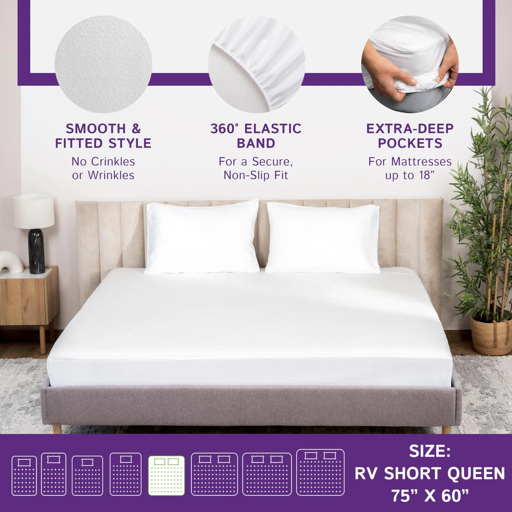 For Travel Trailer, Motorhome and Camper RV Queen Mattresses. Fitted Sheet Style cover with elastic all around. Waterproof layer on all 5 sides (top and 4 sides) WATERPROOF: Whether you have pets or , accidents and spills happen. This 100% waterproof mattress protector has a polyurethane inner lining that blocks liquids and moisture from getting in. Liquids easily seep through to deeper layers of your mattress and are almost impossible to remove. Simply wrap your mattress in our premium cover and your mattress will remain waterproof, dry and protected! ALLERGY : Do you suffer from allergies? Impenetrable cover help you stay healthy and breathe easy. With our high quality mattress protectors, you are shielded from irritating contaminants that can sneak into the deep layers of your mattress! Sleeping on an unprotected mattress can expose you to many different types of allergies making it difficult to breathe and sleep. Seal out dust, pet hair etc. for good! COMFORT & EASE: Stretchable, breathable fabric keeps liquids and contaminants out without compromising comfort. Designed to be soft and completely noiseless, you will not see or hear crinkles under your sheets. DURABLE & LONG-LASTING: Made of high quality polyester (surface) and polyurethane (inside lining). Intended for daily sleep and strong enough for heavy duty protection. Machine washable for easy cleaning and lasting use.