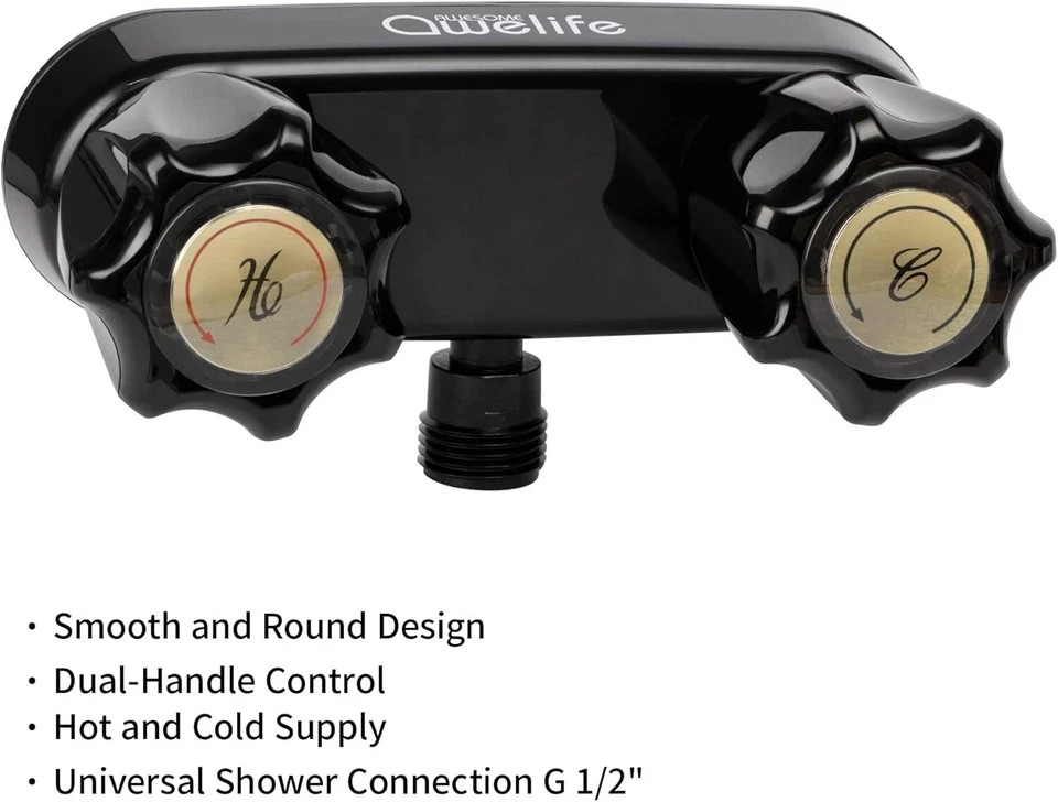 Brand Awelife Recommended Uses For Product Bathroom Mounting Type Wall Mount Finish Type Glossy Material Non-Metallic Color Black Number of Handles 2 Included Components Faucet Body, Hose Nut(Without Hose) Hole Count 2 Special Feature Lightweight About this item FEATURES | This faucet boasts a classic, fully functional diverter, and black knob operation, to quickly adjust temperature and aerated water pressure. DESIGN | The classic styling of this faucet is the perfect solution for updating your shower hardware, and is made using premium grade lightweight synthetic waterways and sturdy plastic construction. QUALITY | This dual knob faucet comes with a durable easy-to-turn design, and provides a desired smooth turning action and unwanted dripping. The diverter accommodates all standard shower hoses. INSTALLATION | If you are concerned about enough space in your shower to accommodate this faucet, don’t worry! It was made with a recreational vehicle’s space in mind, and no plumber is needed. SPECIFICATIONS | Works on any 2-hole, 4” center to center installation. Flow rate is a powerful 2.4 GPM for those that are looking for powerful stream.