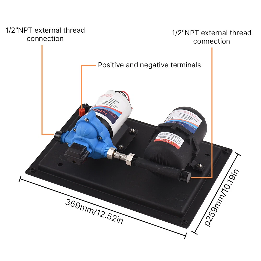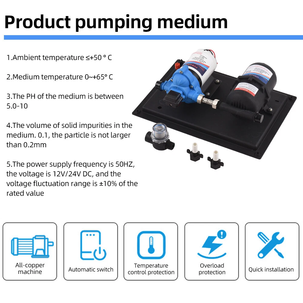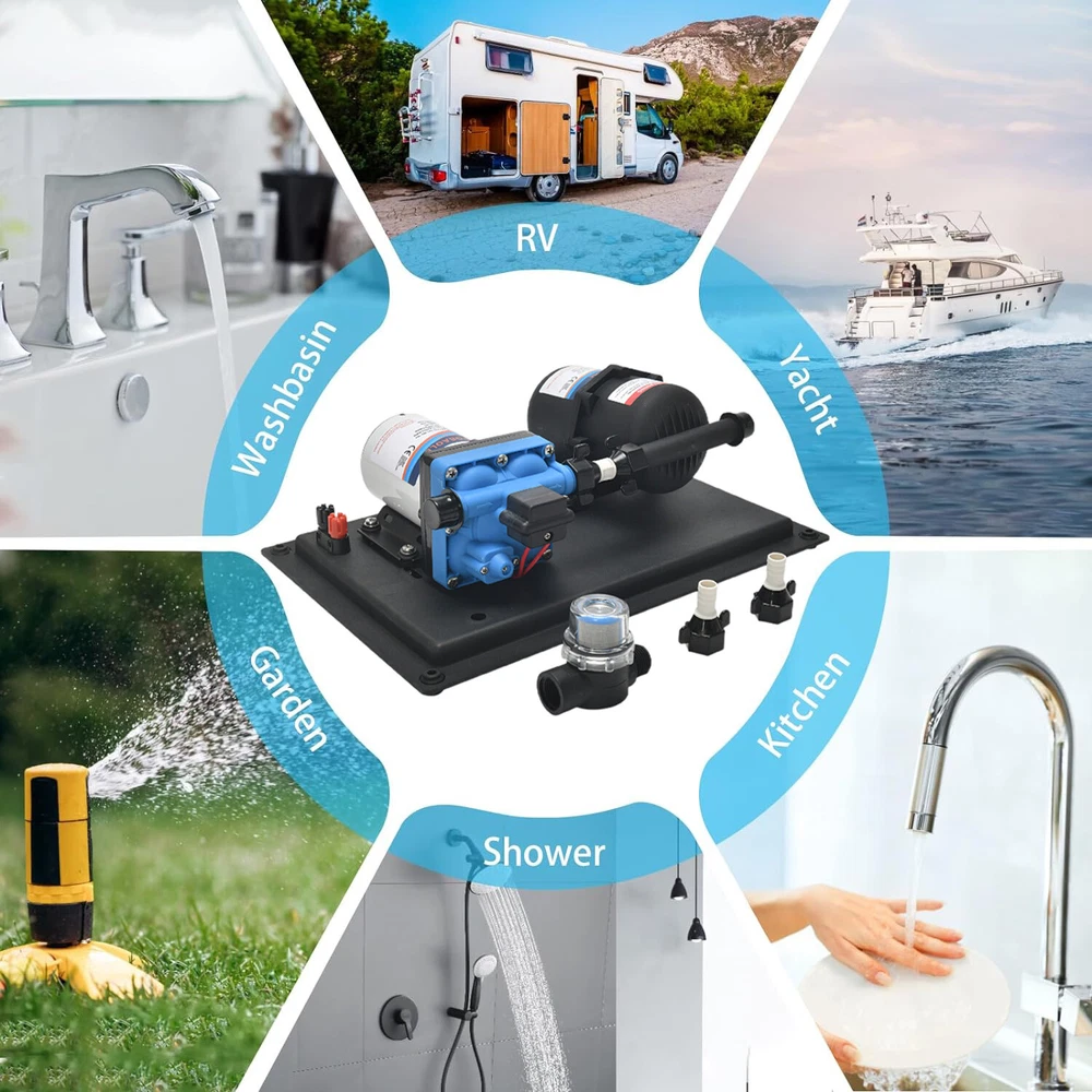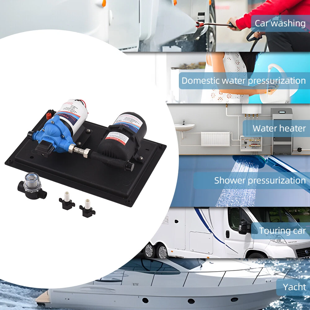 Features: 【Reliable and Efficient】: This DC 12V boost water pump kit features a powerful motor and a flow rate of 3GPM (11.3L/Min) at 55PSI, ensuring a steady and consistent water supply. The built-in thermal overload protection automatically stops the pump when the motor overheats, providing peace of mind and preventing damage. 【Versatile and Easy to Install】: Designed with a standard 4-point external threaded interface, this water pump is easy to operate and quick to install. The automatic pressure switch allows for adjustable pressure ranging from 1.0kg/cm² to 3.5kg/cm², catering to various needs. The shock-proof iron plate mounting feet effectively reduce noise and the galvanized surface prevents rusting, making it durable even in humid environments. 【Powerful and Durable】: Equipped with a high-quality copper core motor, this water pump delivers superior performance, low noise, and higher rotation speed for safer and more reliable operation. The motor also features overload and overheat protection, automatically disconnecting the circuit to safeguard the motor. With its exceptional durability and anti-oxidation ability, this pump is built to last. 【Integrated Water Pressure System】: Our RV water pump comes with a pressure tank, providing a stable and reliable water supply. The integrated system offers multiple configuration options to suit different applications, including yachts, RVs, agricultural irrigation, industrial use, fluid transfer, water purifier boosting, solar water systems, home water supplementation, and car washing. The simple installation and operation of this system effectively reduce the frequency of pump start-up and absorb excess heat generated by heaters. 【Pressure-Regulating and Reflux Functionality】: This water pump is designed with a built-in pressure switch and reflux function. When the actual flow rate is lower than the pump's output, the bypass switch starts the pressure release cycle, greatly reducing the risk of pressure switch damage. This feature ensures the longevity of the pressure switch, providing optimal protection and peace of mind. Specifications: Maximum Flow Rate: 11.3L Maximum Head: 38m/124ft Pump Body Material: Engineering plastic Drive Mode: Electric Pressure/Flow Rate: 55PSI/11.3L GPM: 3 Environmental Temperature: ≤+50 ° C Medium Temperature: 0~+65 ° C Medium PH Value: 5.0-10 The volume of solid inputs in the medium is ≤ 0.1, and the particle size is not greater than 0.2mm Power Frequency: 50Hz Voltage: DC 12V Voltage Translation Range: Rated value ± 10% Product Size: 36.9 * 25.9cm/12.5 * 10.2inch Note: Due to the different display screen and light effect, the actual color of the item might be slightly different from the color showed on the pictures. Packing List: 1 x Water Pump 1 x Filter 2 x Joint