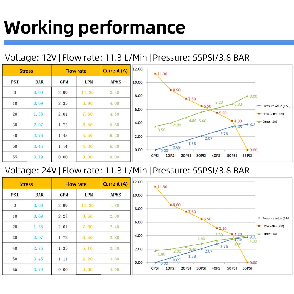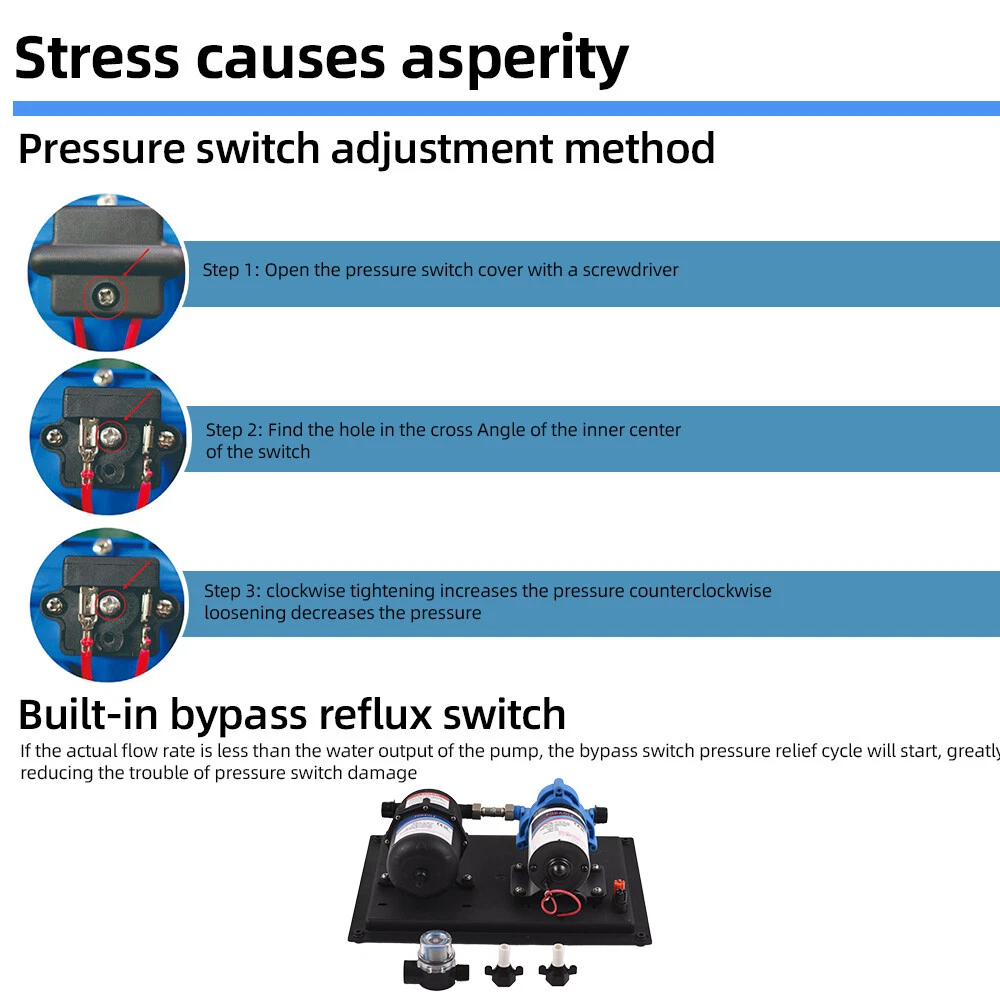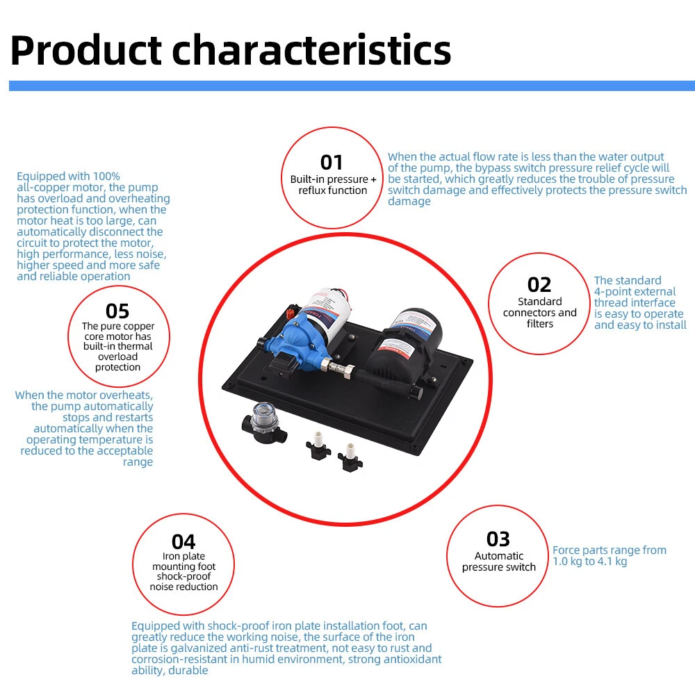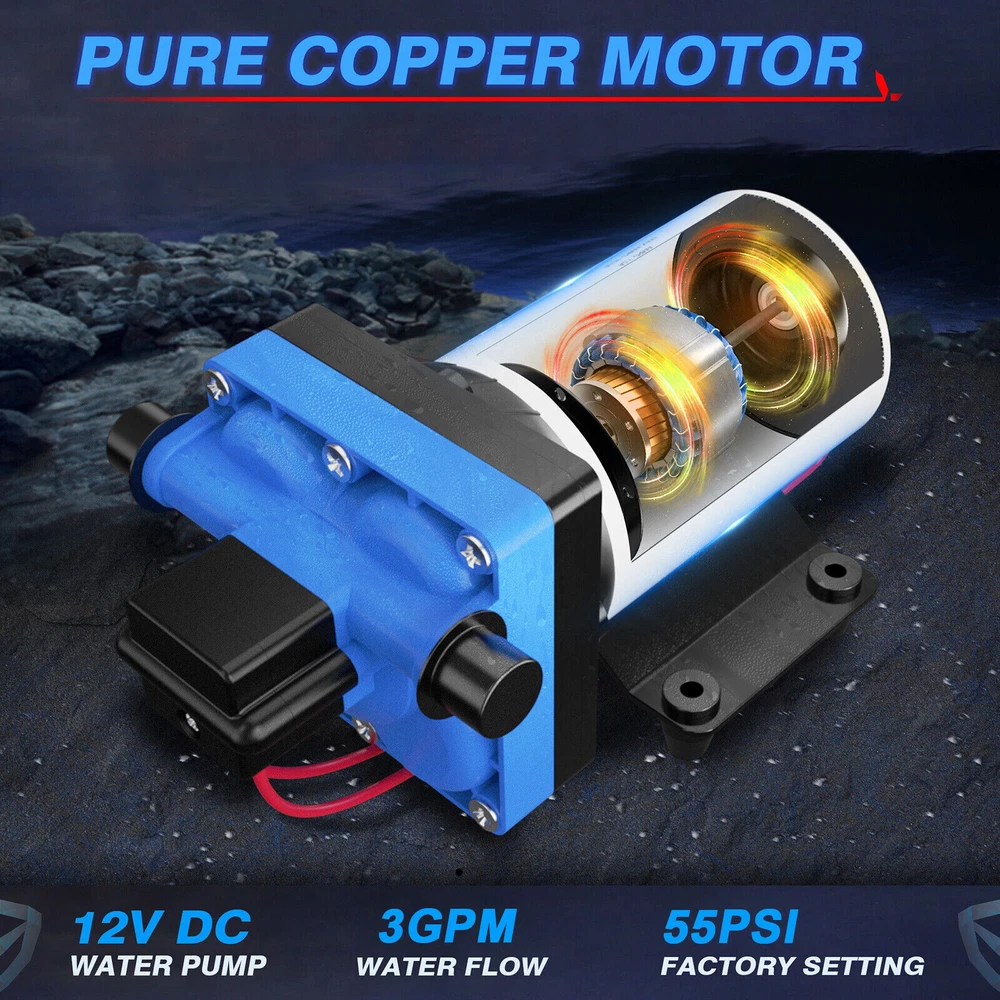 Features: 【Reliable and Efficient】: This DC 12V boost water pump kit features a powerful motor and a flow rate of 3GPM (11.3L/Min) at 55PSI, ensuring a steady and consistent water supply. The built-in thermal overload protection automatically stops the pump when the motor overheats, providing peace of mind and preventing damage. 【Versatile and Easy to Install】: Designed with a standard 4-point external threaded interface, this water pump is easy to operate and quick to install. The automatic pressure switch allows for adjustable pressure ranging from 1.0kg/cm² to 3.5kg/cm², catering to various needs. The shock-proof iron plate mounting feet effectively reduce noise and the galvanized surface prevents rusting, making it durable even in humid environments. 【Powerful and Durable】: Equipped with a high-quality copper core motor, this water pump delivers superior performance, low noise, and higher rotation speed for safer and more reliable operation. The motor also features overload and overheat protection, automatically disconnecting the circuit to safeguard the motor. With its exceptional durability and anti-oxidation ability, this pump is built to last. 【Integrated Water Pressure System】: Our RV water pump comes with a pressure tank, providing a stable and reliable water supply. The integrated system offers multiple configuration options to suit different applications, including yachts, RVs, agricultural irrigation, industrial use, fluid transfer, water purifier boosting, solar water systems, home water supplementation, and car washing. The simple installation and operation of this system effectively reduce the frequency of pump start-up and absorb excess heat generated by heaters. 【Pressure-Regulating and Reflux Functionality】: This water pump is designed with a built-in pressure switch and reflux function. When the actual flow rate is lower than the pump's output, the bypass switch starts the pressure release cycle, greatly reducing the risk of pressure switch damage. This feature ensures the longevity of the pressure switch, providing optimal protection and peace of mind. Specifications: Maximum Flow Rate: 11.3L Maximum Head: 38m/124ft Pump Body Material: Engineering plastic Drive Mode: Electric Pressure/Flow Rate: 55PSI/11.3L GPM: 3 Environmental Temperature: ≤+50 ° C Medium Temperature: 0~+65 ° C Medium PH Value: 5.0-10 The volume of solid inputs in the medium is ≤ 0.1, and the particle size is not greater than 0.2mm Power Frequency: 50Hz Voltage: DC 12V Voltage Translation Range: Rated value ± 10% Product Size: 36.9 * 25.9cm/12.5 * 10.2inch Note: Due to the different display screen and light effect, the actual color of the item might be slightly different from the color showed on the pictures. Packing List: 1 x Water Pump 1 x Filter 2 x Joint