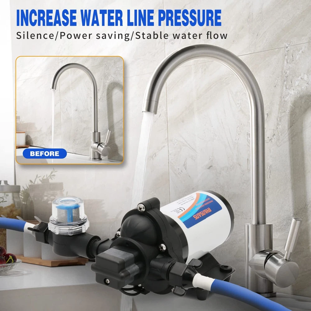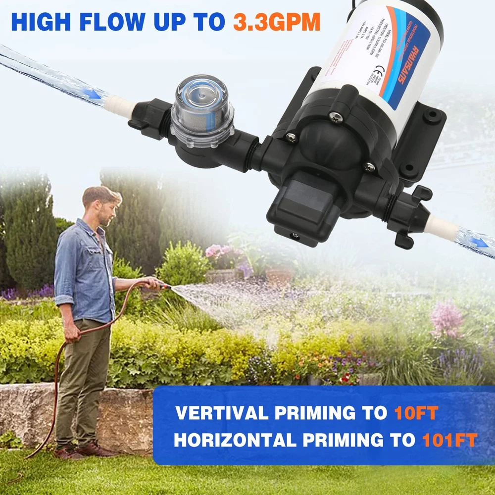 【Product Specifications】3.3 Gallons Per Minute Flow, 12.5 LPM Flow Rate, 45 PSI pressure setting, 115V AC Voltage self priming water pump, Pump lift up to 101 feet. 【Pressure Switch】Equipped with an adjustable pressure switch, the adjustable range of pressure is 1.0 kg to 3.5 kg, 1KG=14.95PSI, with automatic start-stop function, and the factory setting is 45 PSI. 【Wide Compatibility】The booster pump provides you with a wide range of experience, which can be used for RV, boats, car washes, agricultural irrigation, household water boosting, shower boosting, etc. 【Package Includes】1× Strainer, 1× Diaphragm Pump, 2× Hose Fitting, 1× User Installation Manual. 【Buy With Confidence】If you are not satisfied with the product, please contact us by e-mail and we will solve the problem immediately. Buying RYANSANS products will enjoy a one-year warranty and customer service, you can buy products with peace of mind.