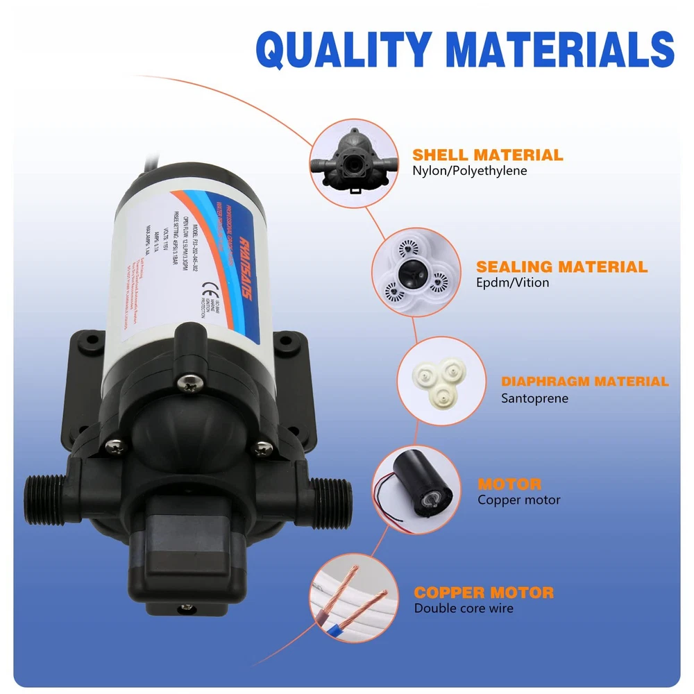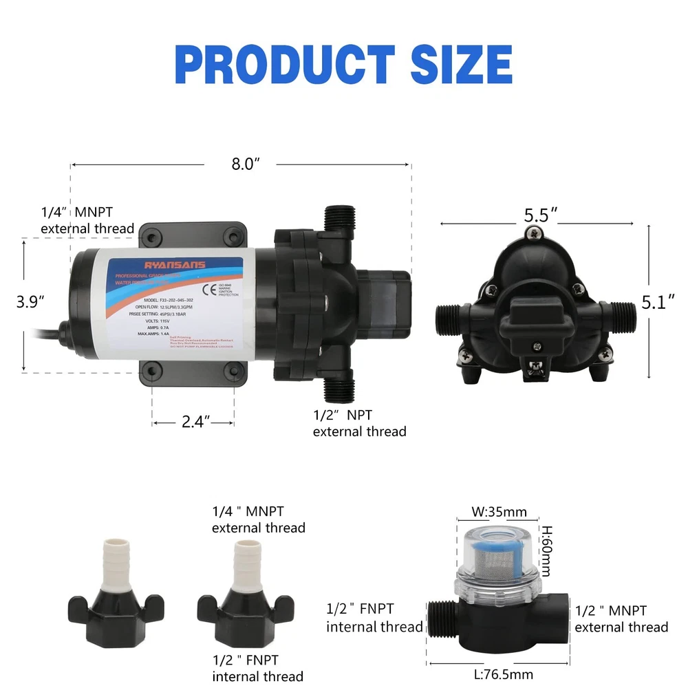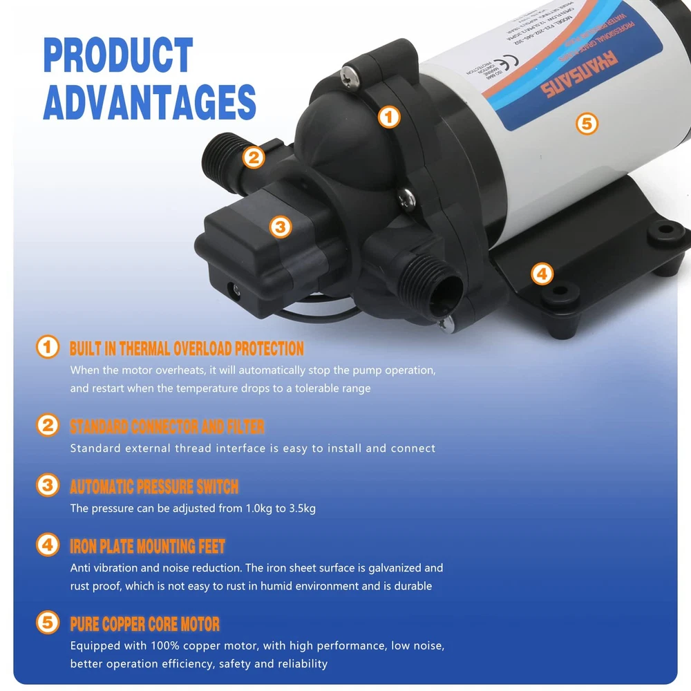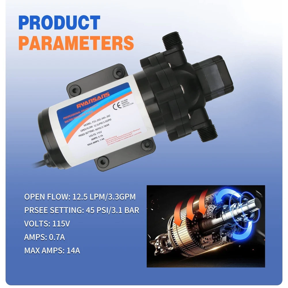 【Product Specifications】3.3 Gallons Per Minute Flow, 12.5 LPM Flow Rate, 45 PSI pressure setting, 115V AC Voltage self priming water pump, Pump lift up to 101 feet. 【Pressure Switch】Equipped with an adjustable pressure switch, the adjustable range of pressure is 1.0 kg to 3.5 kg, 1KG=14.95PSI, with automatic start-stop function, and the factory setting is 45 PSI. 【Wide Compatibility】The booster pump provides you with a wide range of experience, which can be used for RV, boats, car washes, agricultural irrigation, household water boosting, shower boosting, etc. 【Package Includes】1× Strainer, 1× Diaphragm Pump, 2× Hose Fitting, 1× User Installation Manual. 【Buy With Confidence】If you are not satisfied with the product, please contact us by e-mail and we will solve the problem immediately. Buying RYANSANS products will enjoy a one-year warranty and customer service, you can buy products with peace of mind.