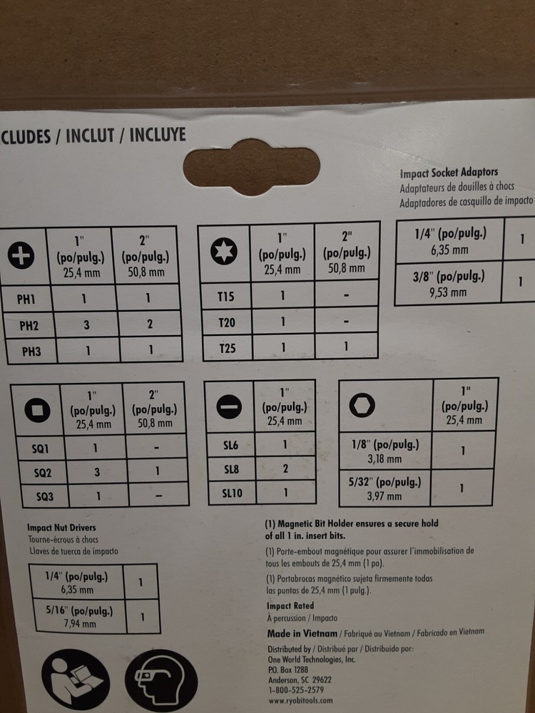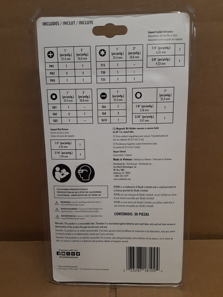 Elevate your tool collection with the RYOBI 30 PC. Impact Driver Bit Set, model AR2037l. Engineered for compatibility and durability, this comprehensive set caters to a variety of drilling tasks around the home and workshop. From delicate woodwork to robust concrete projects, these bits are designed to handle it all with precision. The set's thoughtful organization ensures that you always have the right bit for the job at hand. With Ryobi's reputation for quality, this drill bit collection is a must-have for both professional tradespeople and DIY enthusiasts looking to ensure their toolkit is complete and efficient.