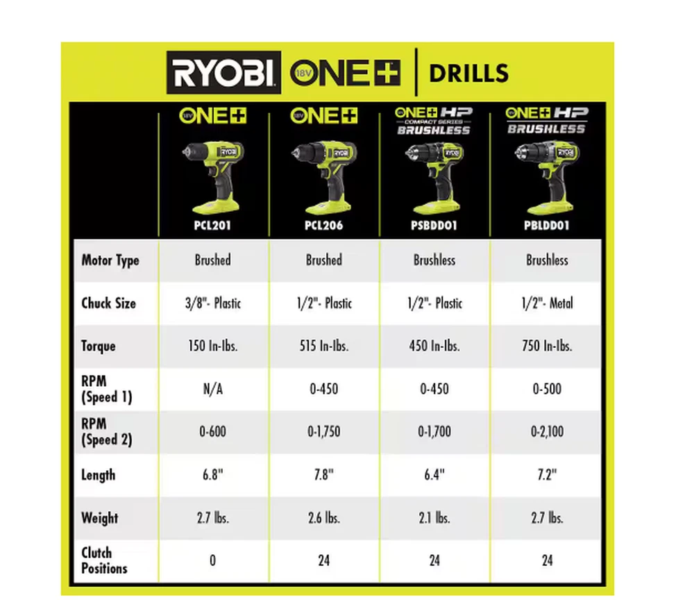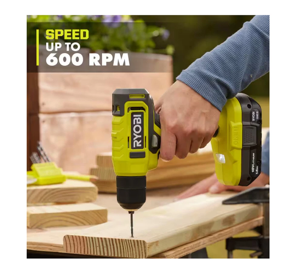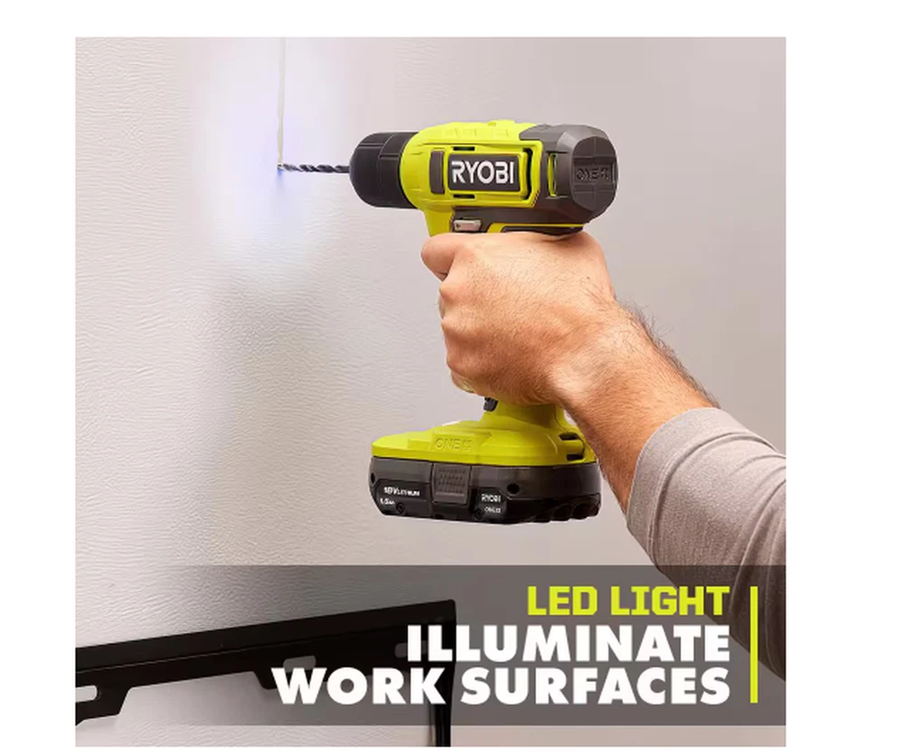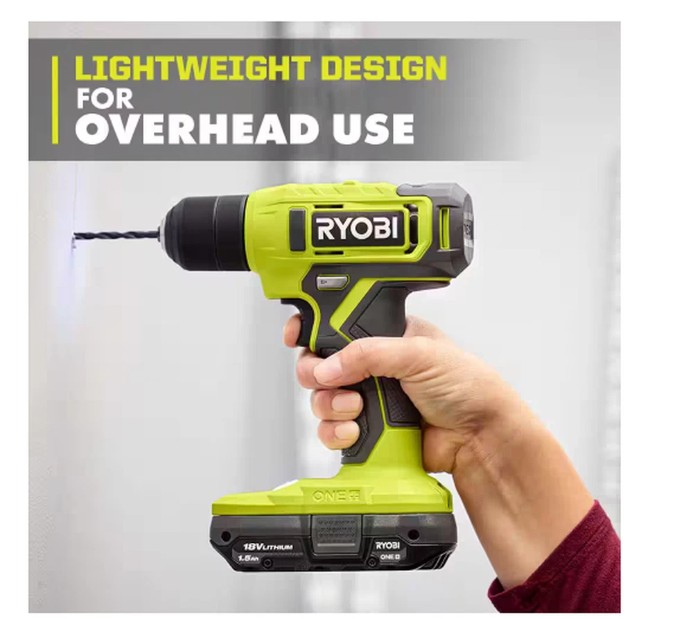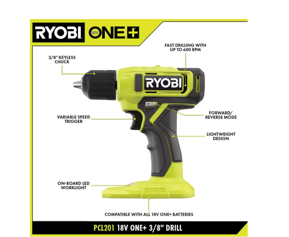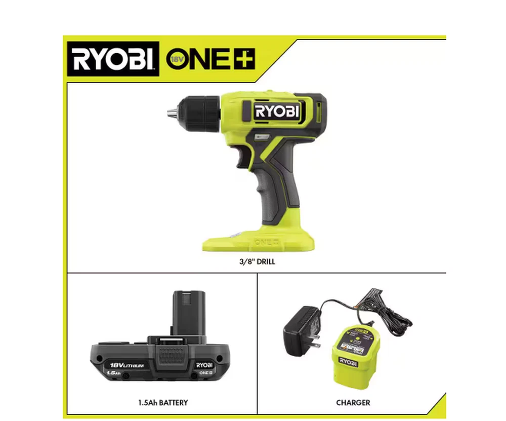The RYOBI 18V ONE+ 3/8" Drill has the power and speed to tackle everyday projects around the home like drilling pilot holes or driving screws. Designed with a 3/8” keyless chuck, attach most drill bits and various drill attachments, making this the perfect tool to have handy for projects like building, assembling, hanging and so much more. With speeds up to 600 RPM, quickly drill into a variety of materials. Weighing in at a light weight 2.8lbs., this drill's design allows for effortless and easy handling. Plus, it features an on-board LED worklight for visibility in dimly lit spaces and a variable speed trigger for control in all applications. Best of all, it is part of the RYOBI ONE+ system where any 18V ONE+ battery works with any 18V ONE+ product. This 18V ONE+ 3/8" Drill is backed by the RYOBI 3-Year Manufacturer's Warranty and includes PCL201 18V ONE+ 3/8" Drill, PBP002 18V ONE+ 1.5Ah Battery, 18V Charger and Operator's Manuals. On-board LED worklight Variable speed trigger Part of the RYOBI 18V ONE+ System of Over 300 Cordless Products Includes: 18V ONE+ 3/8" Drill, 18V ONE+ 1.5Ah Battery, Charger, and Operator’s Manual Everyday DIY drill Easily drill holes and drive screws Lightweight design at only 2.8 lbs. Fast drilling with up to 600 RPM 3/8" keyless chuck Product Depth (in.) 3.5 in Product Height (in.) 8.25 in Product Width (in.) 8.38 in Battery Amp Hours 1.5 Ah Battery Power Type Lithium Ion Battery Voltage (V) 18V Battery/Charger 1 Battery & Charger Included Charger Included Charger Included Chuck Size (In.) 3/8 In. Chuck Type Keyless Color Family Green Condition New Cordless Tool Type Drill/Driver Cordless/Corded Cordless Drill/ Driver Type Power Drill Included Belt Clip, Bit Holder, Bits Maximum Speed (RPM) 600 RPM Motor Type Brushed Number of Total Batteries Included 1 Power Tool Features Cushioned Grip, LED Light, Variable Speed Product Weight (lb.) 2.8 lb Tools Product Type Power Tool Torque (lb-in) 135 In lbs