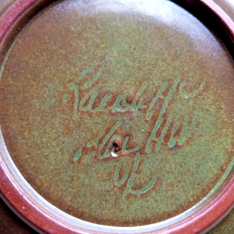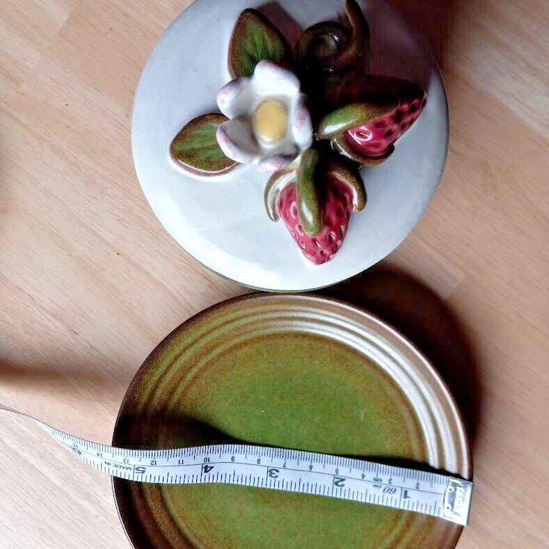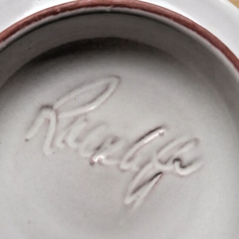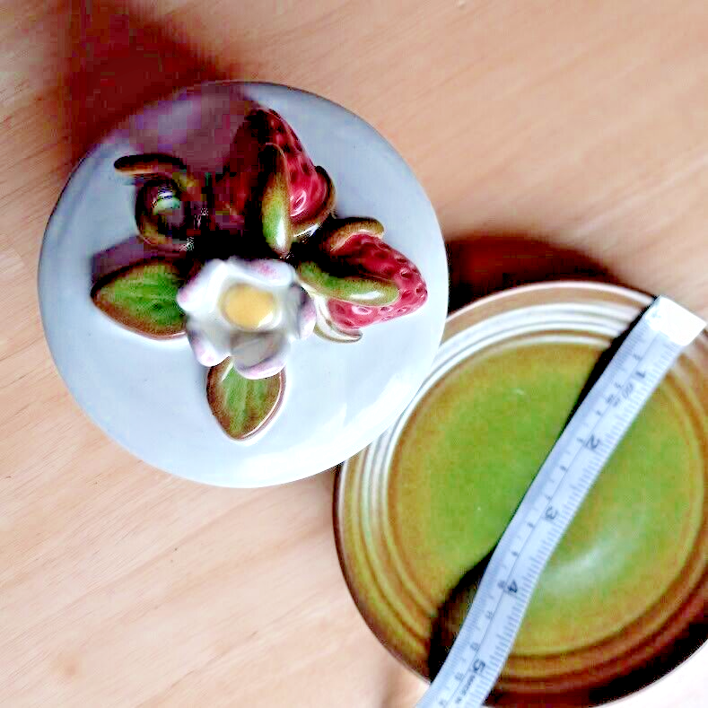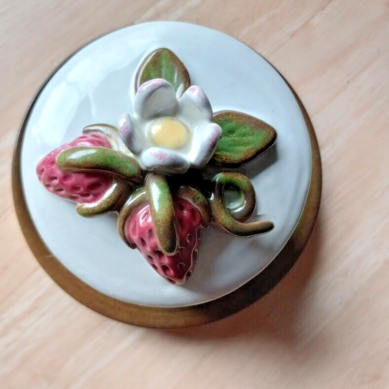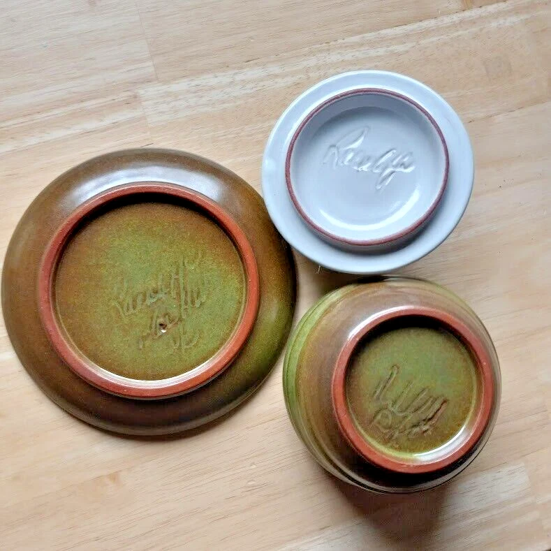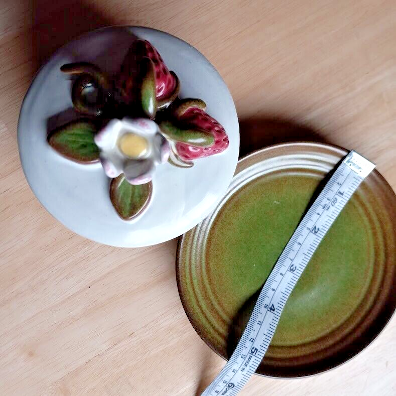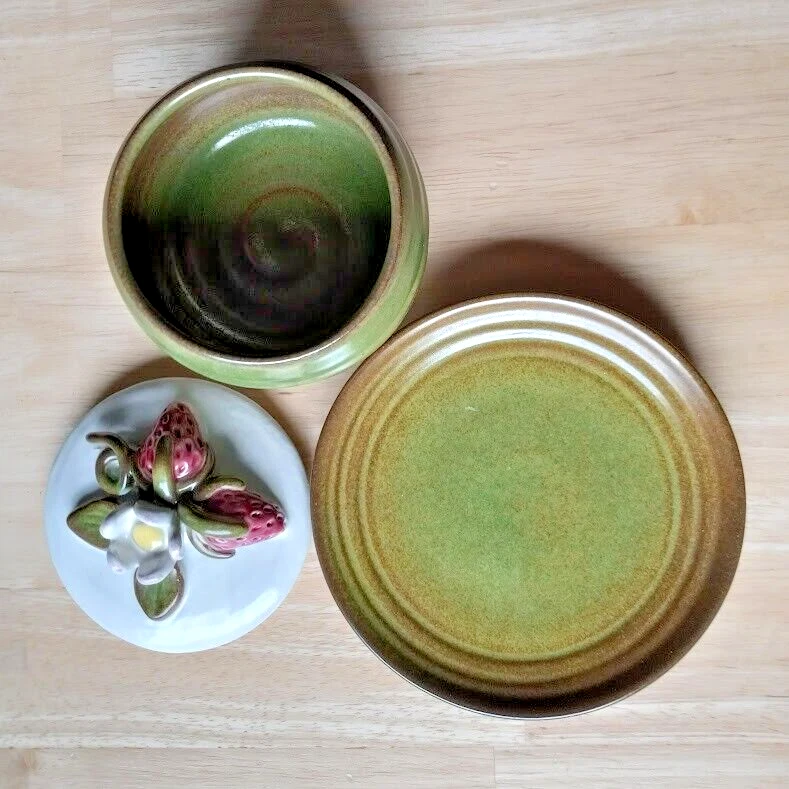 The vintage Rackliffe ceramic bowl set includes a bowl, lid, and underplate, featuring a strawberry pattern in multicolor. This decorative art pottery piece was manufactured in 1980 in Blue Hill, Maine, showcasing a vintage aesthetic. The set belongs to the Strawberry product line and is crafted using pottery techniques, making it a unique addition to any collection of decorative cookware or dinnerware.