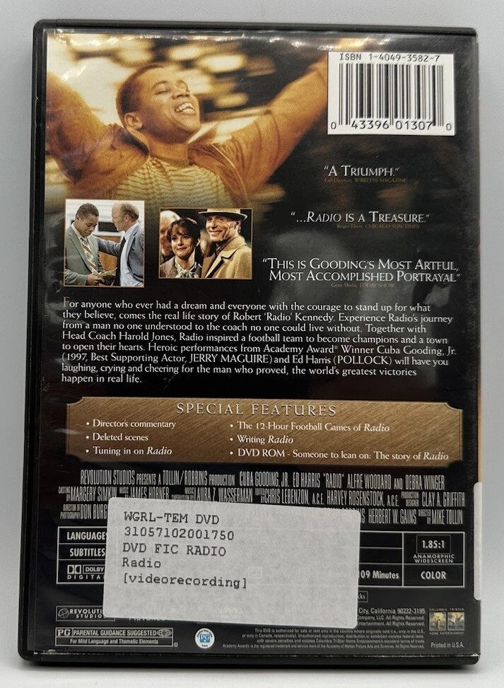 Studio: Tri-Star Case Type: Tall/DVD Case UPC: 0043396013070 Run Time: 109 Mins. Format: DVD Release Year: 2004 Features: Widescreen Video Format: NTSC Genre: Sports Actor: Cuba Gooding Jr. Rating: PG gtin13: 0043396013070 Region Code: DVD: 1 (US, Canada...) Type: Movie Language: English Season: N/A MPN: 01307 Director: Mike Tolin Movie/TV Title: Radio Cinematic Movement: Abstract Edition: Widescreen Country/Region of Manufacture: United States Sub-Genre: American Football