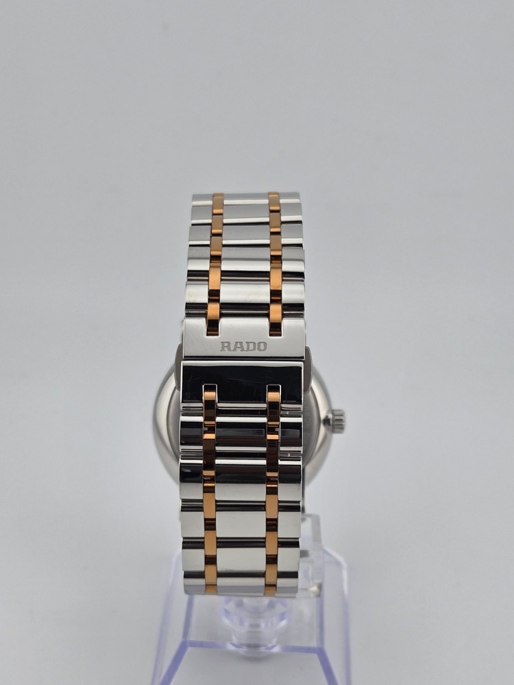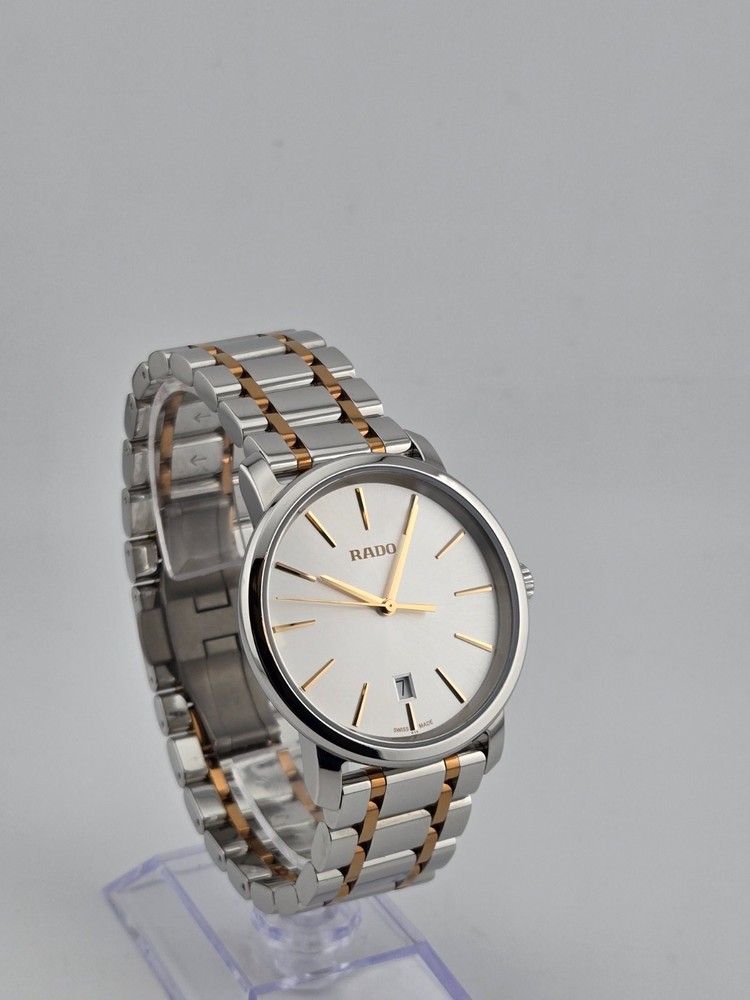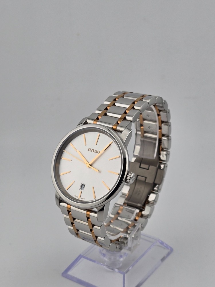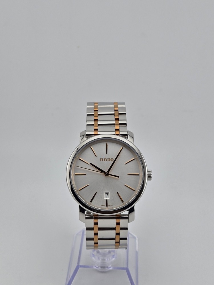 Rado Men’s DiaMaster Silver Dial Quartz Watch – R14078103 ($1700 MSRP) New with Gift Box! This watch is a Shelf Pull from one of the Major Department Stores. May find few micro scratches on the watch case/band, visible under a direct and strong light. The Rado Men’s DiaMaster Silver Dial Quartz Watch - R14078103 embodies the Swiss brand's dedication to combining modern aesthetics with precision engineering. Featuring a stainless steel case and a two-tone silver-tone and rose gold PVD stainless steel bracelet, this timepiece exudes sophistication and durability. The fixed stainless steel bezel frames a sleek silver dial adorned with rose gold-tone hands and index hour markers, offering a harmonious contrast and excellent readability. Powered by quartz movement, the watch ensures reliable timekeeping, while a scratch-resistant sapphire crystal protects the dial from daily wear and tear. With a water resistance of 100 meters (330 feet), it is suitable for recreational swimming and showering, adding versatility to its appeal. The 40 mm round case, 9 mm thickness, and 21 mm band width provide a balanced presence on the wrist, complemented by a fold-over clasp with a push button release for secure wearability. Designed for both style and functionality, the Rado DiaMaster Quartz Watch is a testament to Rado's commitment to quality craftsmanship and contemporary design. Features Stainless steel case with a two-tone (silver-tone and rose gold PVD) stainless steel bracelet. Fixed stainless steel bezel. Silver dial with rose gold-tone hands and index hour markers. Dial Type: Analog. Date display at the 6 o'clock position. Quartz movement. Scratch resistant sapphire crystal. Pull / push crown. Solid case back. Round case shape. Case size: 40 mm. Case thickness: 9 mm. Band width: 21 mm. Band length: 8 inches. Fold over clasp with a push button release. Water resistant at 100 meters / 330 feet. Functions: date, hour, minute, second. Fast and Free Shipping You're already purchasing the item. Why pay additional for shipping, especially slow shipping? We get your order shipped out within 1-business day and delivered to your doorstep as quickly as possible. Competitive Pricing With our dynamic pricing model, our prices are always competitive. Our prices are some of the lowest that you will find on the internet. Rest assured that you're getting a good deal when purchasing with us. 30-day Money Back Guarantee We are committed to making sure that you leave this transaction satisfied. If you're unhappy with the product for any reason, you may return it back for your money-back or a replacement within 30 days. No questions asked!