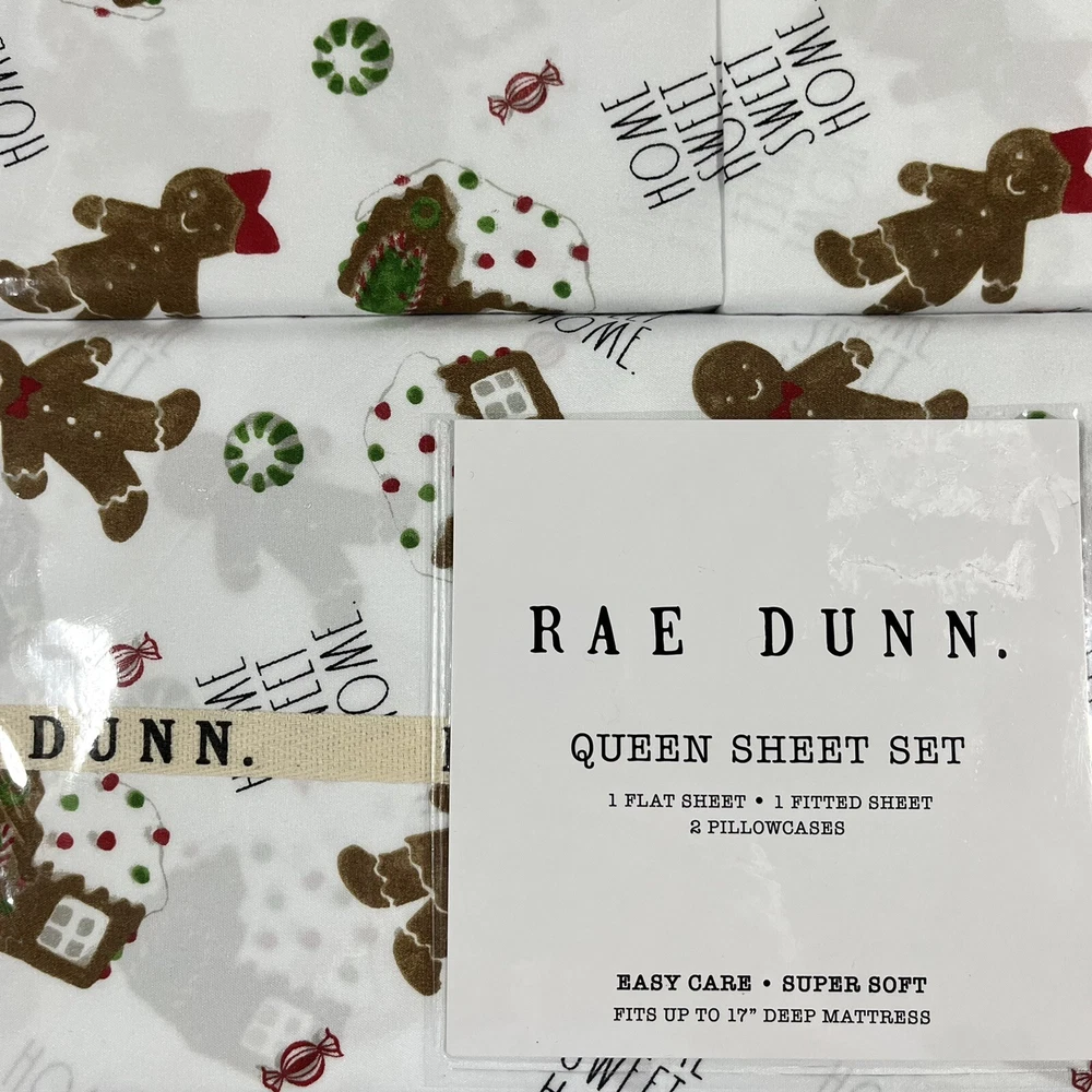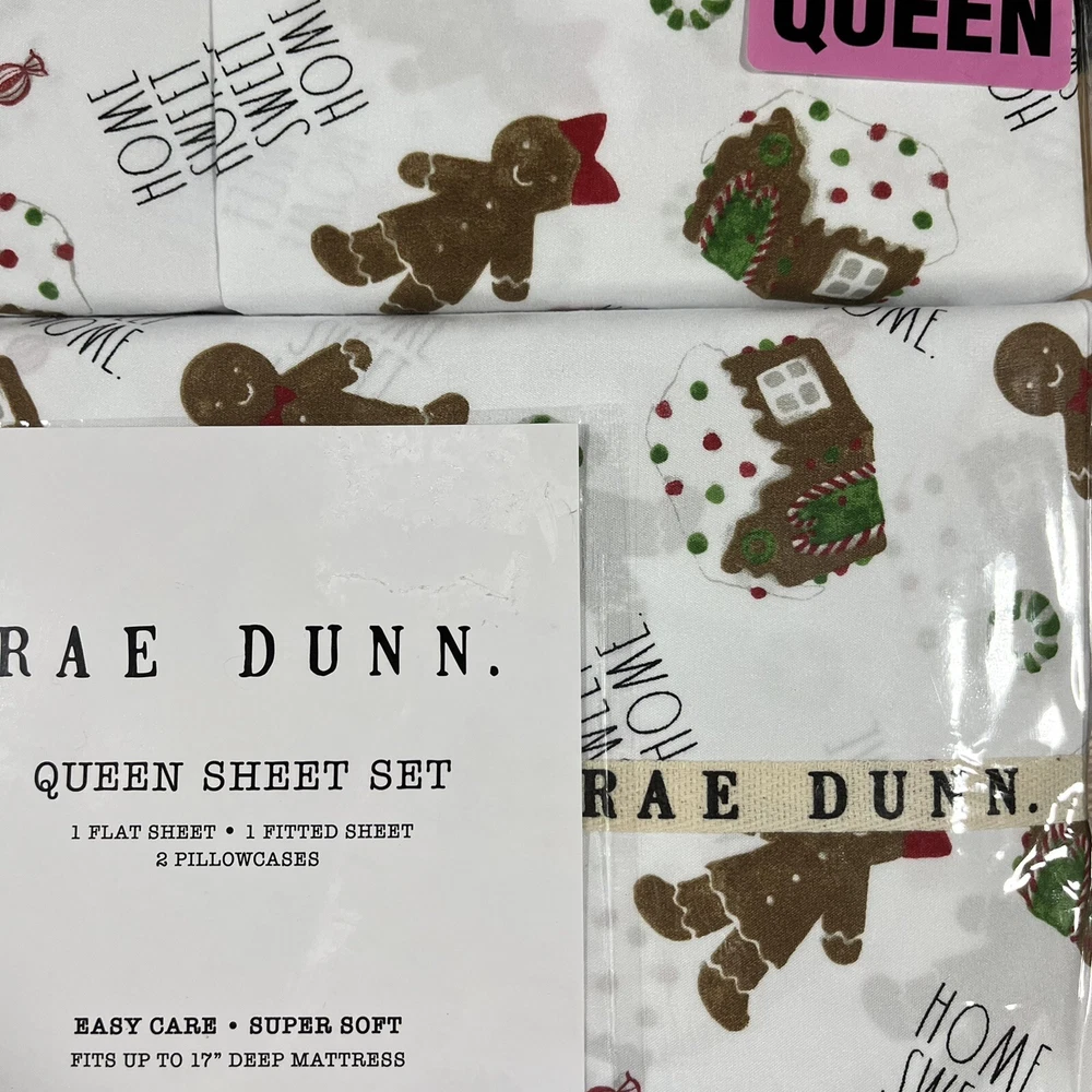 Rae Dunn Christmas QUEEN Size Sheet Set Home Sweet Home Gingerbread Man Cookie