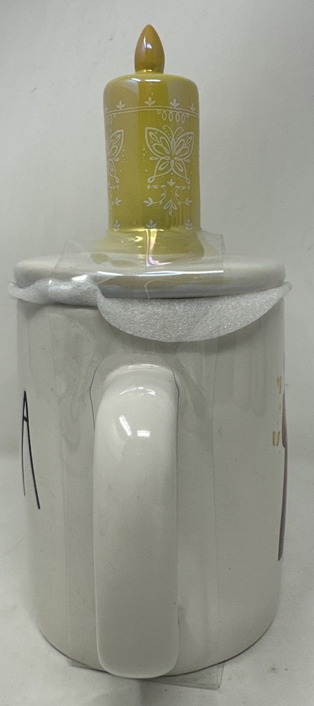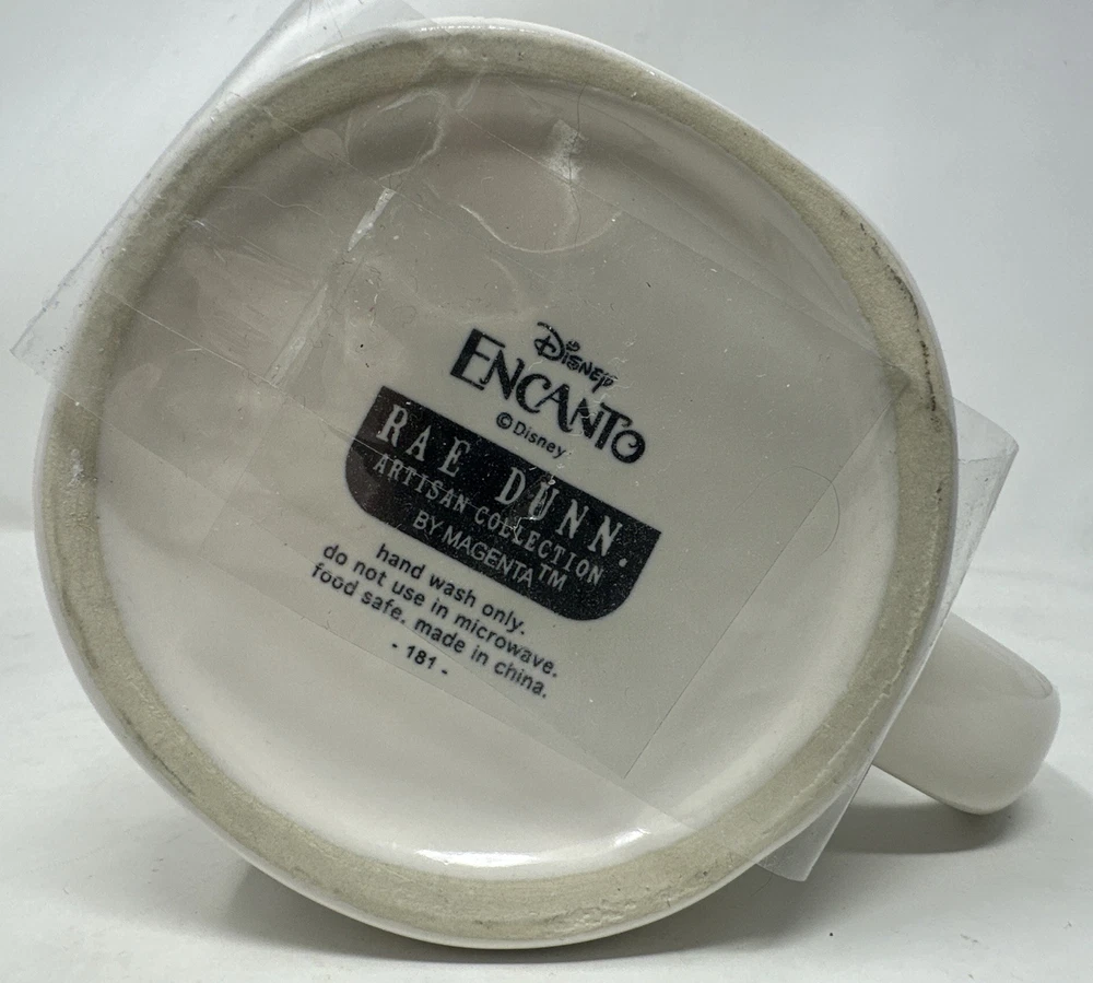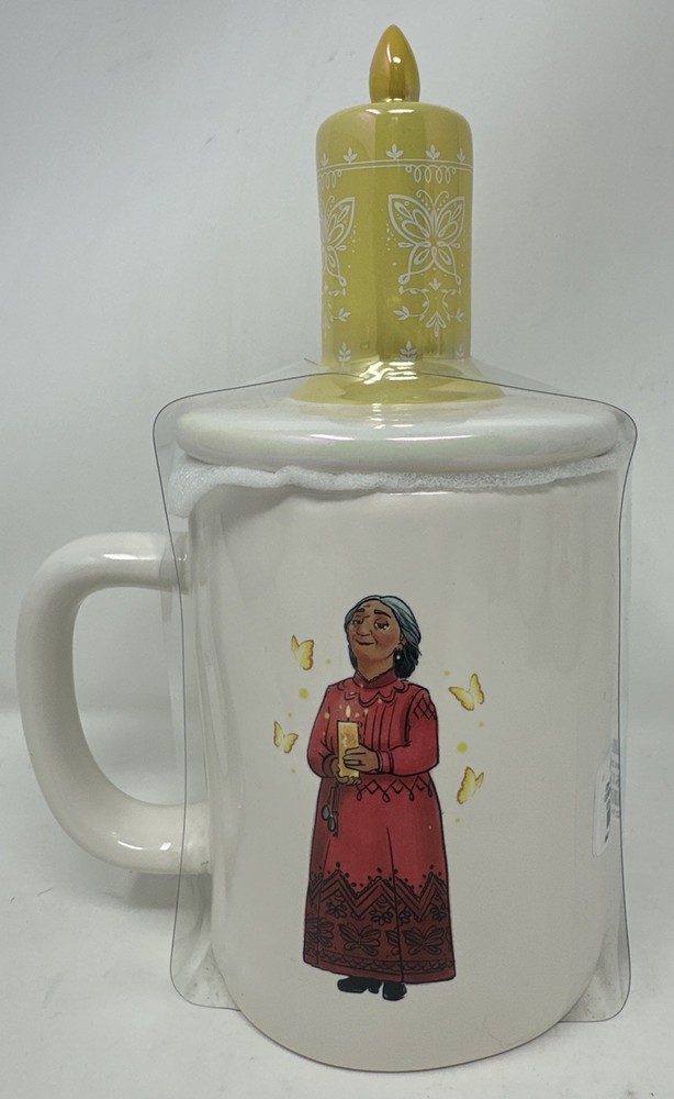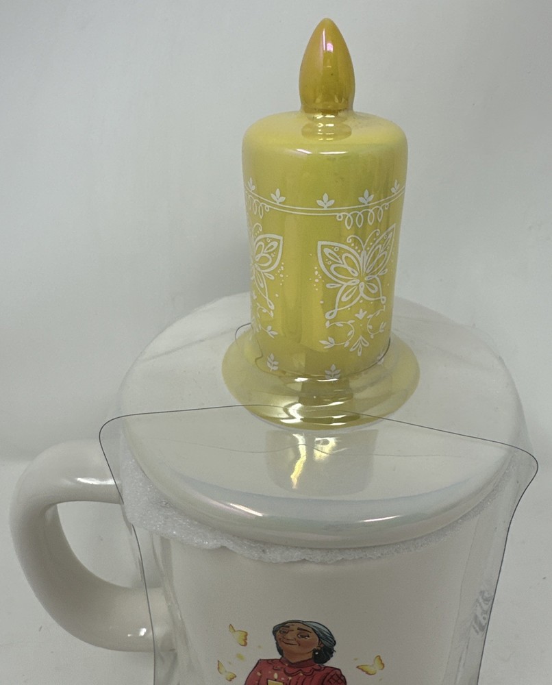 The Rae Dunn Disney Encanto ABUELA White Ceramic Iridescent Candle Topper Mug is a stunning two-piece set featuring a round, glossy white ceramic mug decorated with a graphic pattern inspired by Disney's Encanto. The mug comes with a decorative lid and a candle topper, making it a perfect gift or as an addition to your collection! Hand wash only. Made by Rae Dunn, this Disney-themed mug is a unique and exclusive addition to any collection.