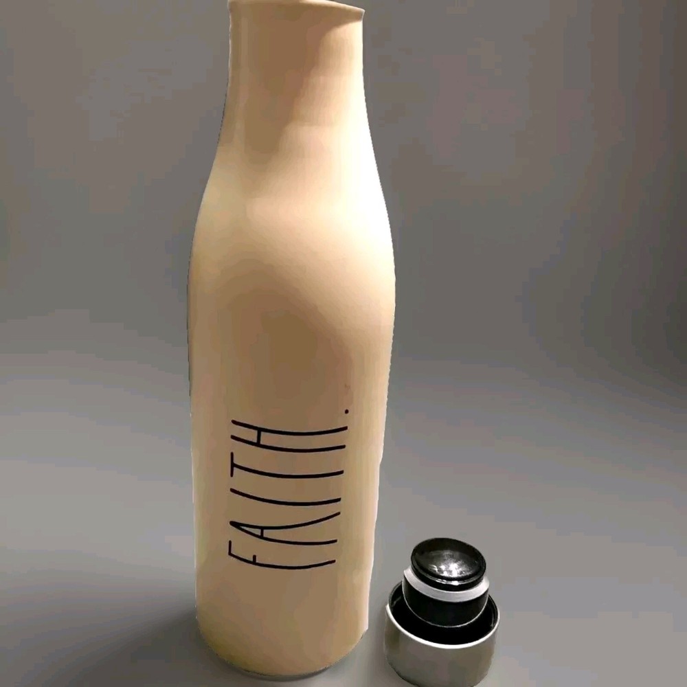 This is a Rae Dunn designer water bottle in beige, featuring an insulated stainless steel construction with a screw-on lid. The bottle is BPA-free, phthalate-free, reusable, refillable, and has a vacuum wall for insulation. It also includes a child-resistant cap, is leakproof, and designed to keep beverages cold or hot. The set includes the water bottle, which is not a modified item.