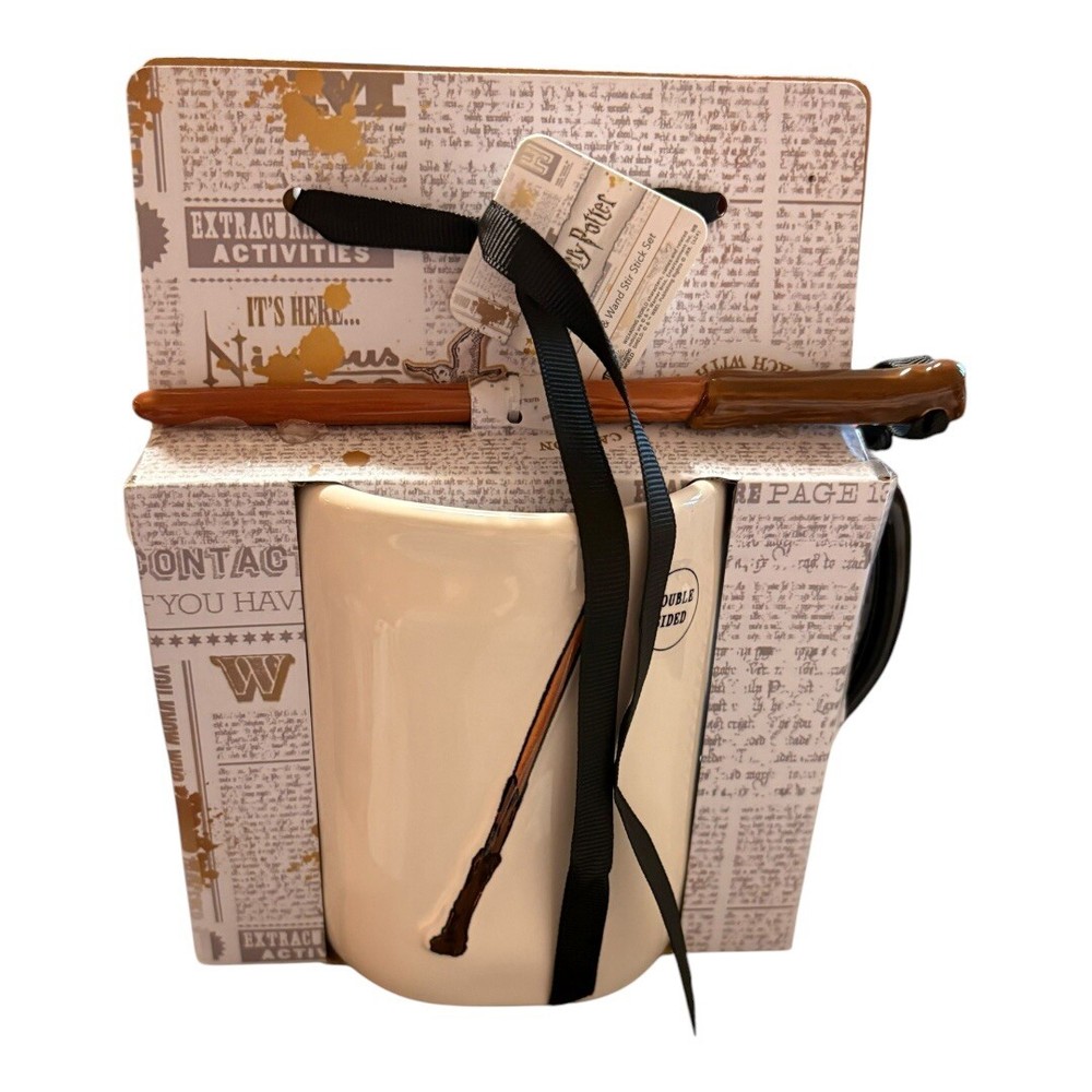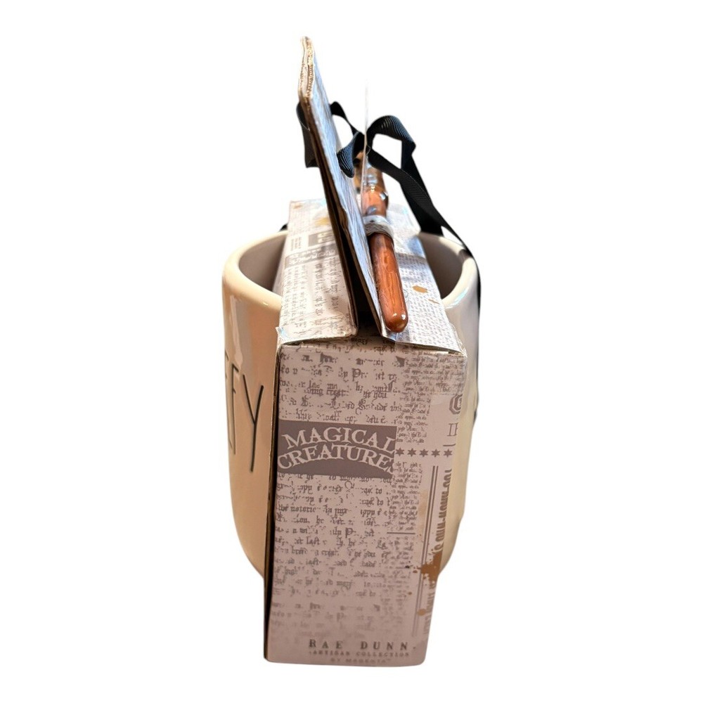 This is a Rae Dunn HARRY POTTER Hogwarts STUPEFY Wand Wizarding World Mug featuring a wand design. It is part of the Harry Potter franchise and belongs to the Wand type within the Fantasy genre. The mug is brand new with tags (BNWT) and would be a collectible item for fans of Harry Potter and the magical world of Hogwarts.