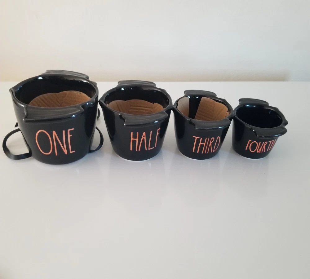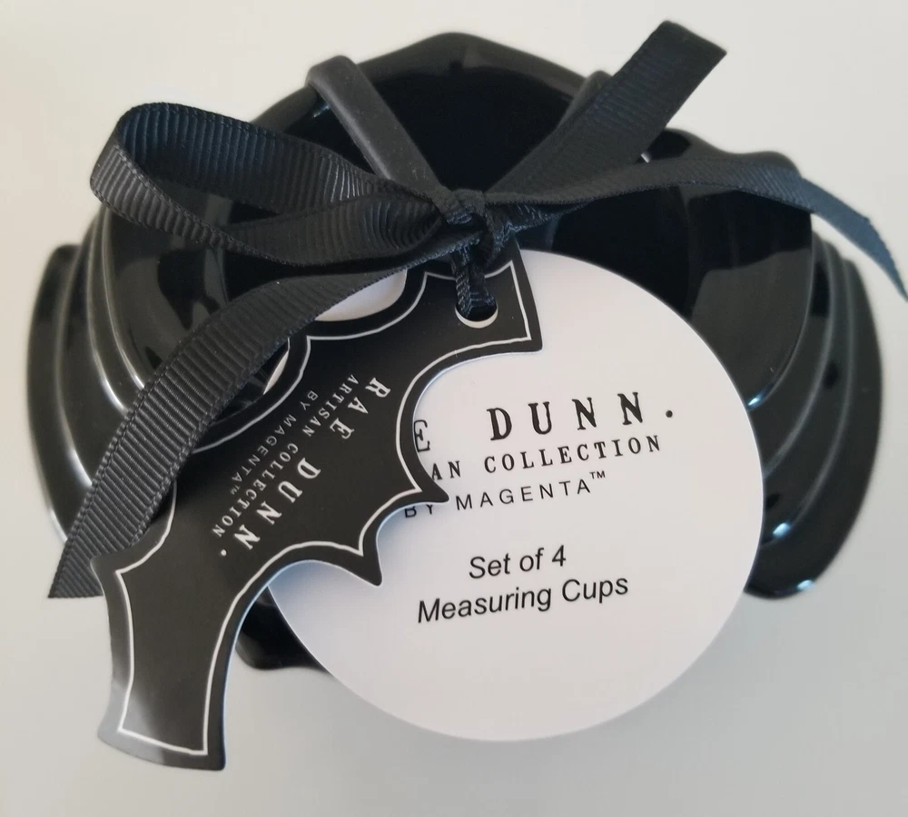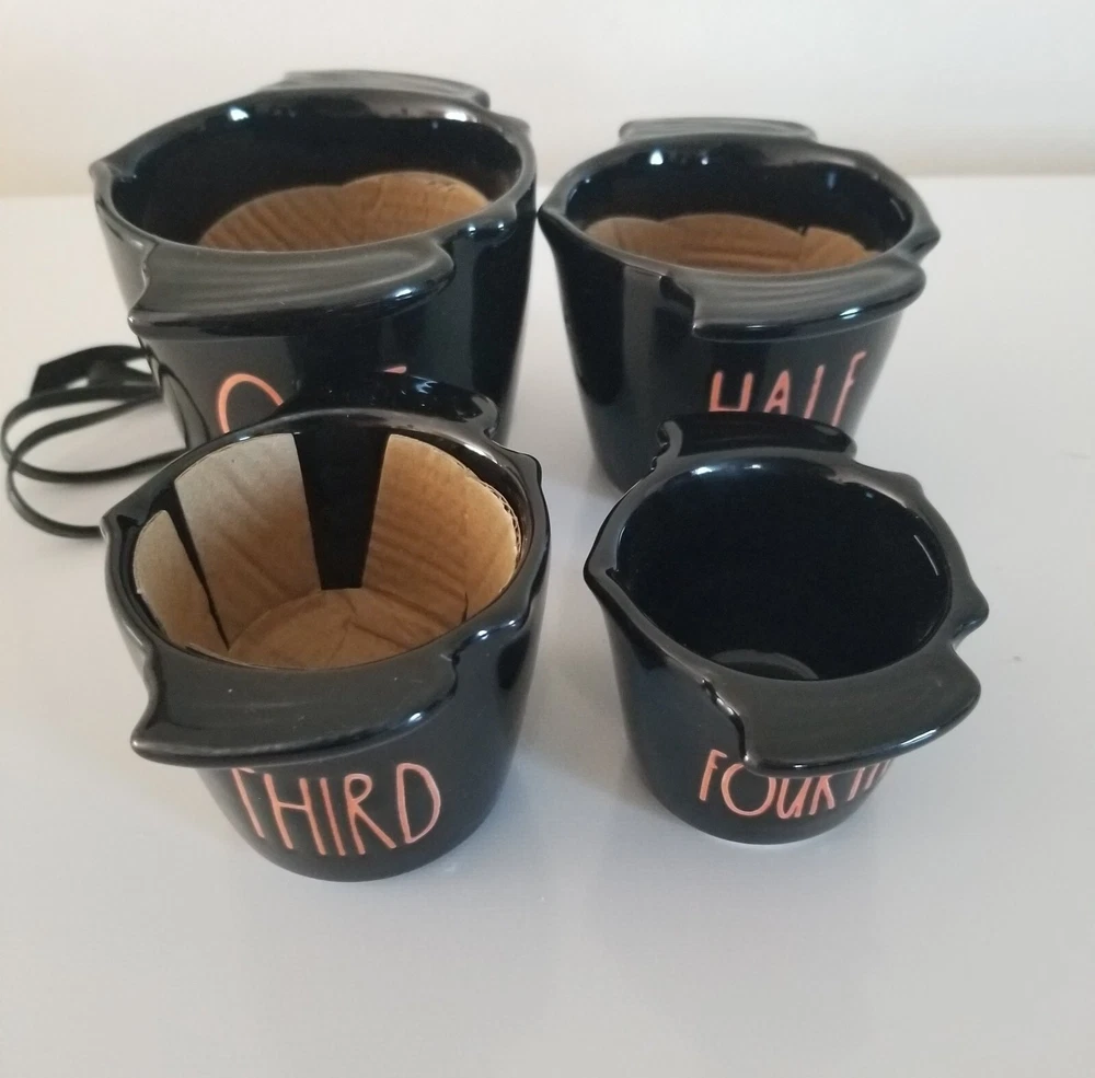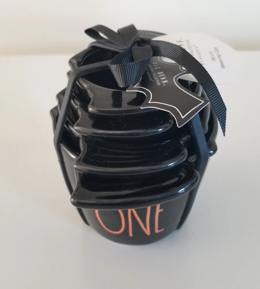 Brand new! Get ready for Halloween with these Rae Dunn measuring cups! The black bat-shaped cups feature a vibrant orange LL design, perfect for adding a pop of color to your kitchen. Made for measuring kitchen ingredients, these cups are a must-have for any baking or cooking enthusiast. The cups are made of durable material, ensuring they will last for years to come. Add these measuring cups to your collection today and show off your love for Halloween!